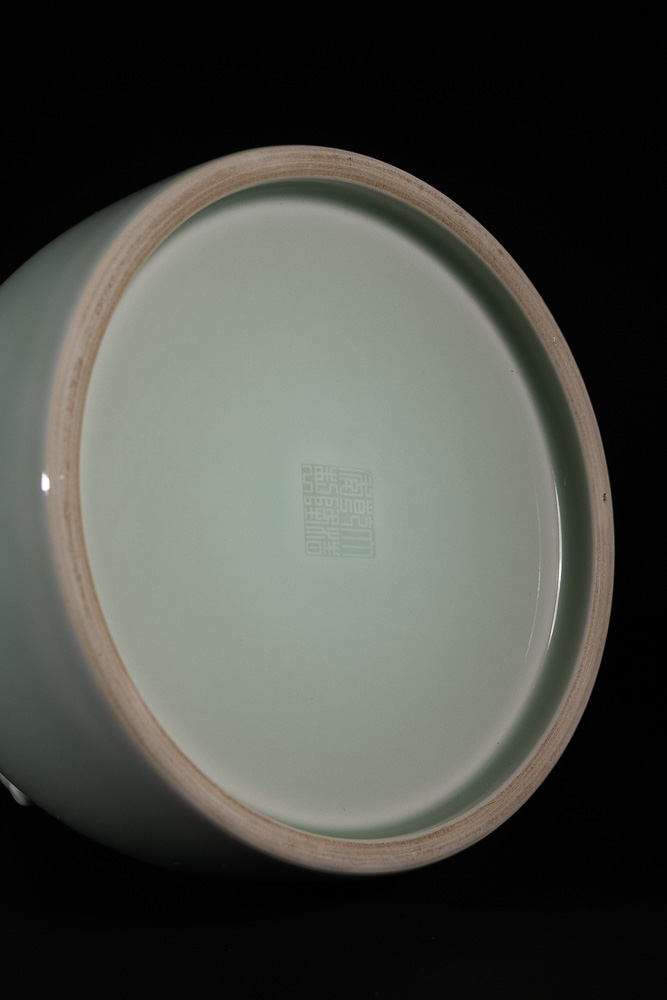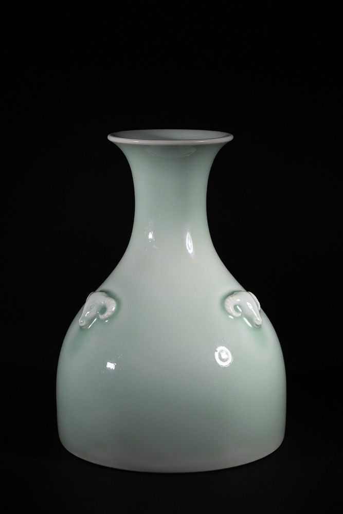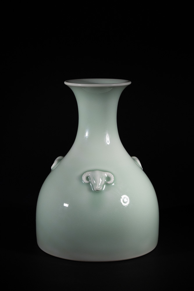 Lot 100: A Chinese Celadon-Glazed Vase with Three Ram's Head Handles, Qianlong Mark