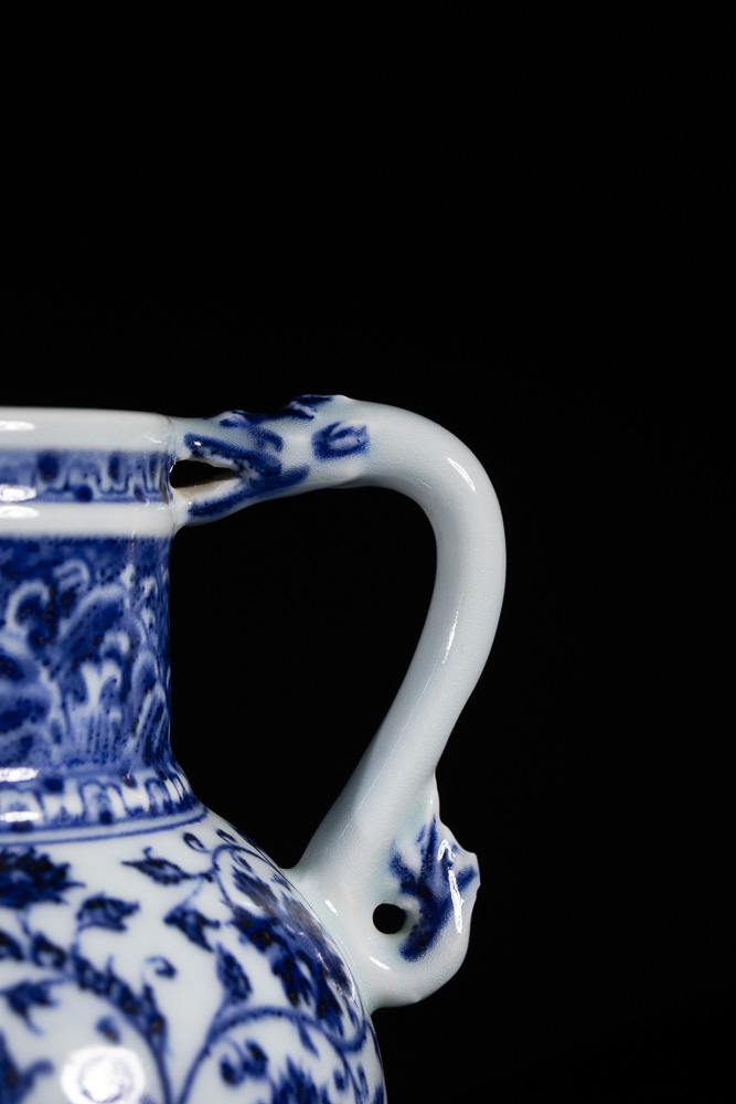 A Chinese blue and white porcelain ewer, executed in the Ming style and bearing a six-character horizontal Xuande mark. The ewer features a globular body, a cylindrical neck, and a curved handle stylized as a dragon or mythical beast, with its head resting on the rim. It is decorated in underglaze cobalt blue on a white ground, featuring continuous floral scrolls across the body, a band of stylized waves or ruyi-heads on the neck, a classic scroll at the shoulder, and lotus panel motifs around the foot. A six-character horizontal mark, 大明宣德年制 (Dà Míng Xuāndé Nián Zhì), meaning "Made in the Xuande reign of the Great Ming dynasty, " is visible on the shoulder.