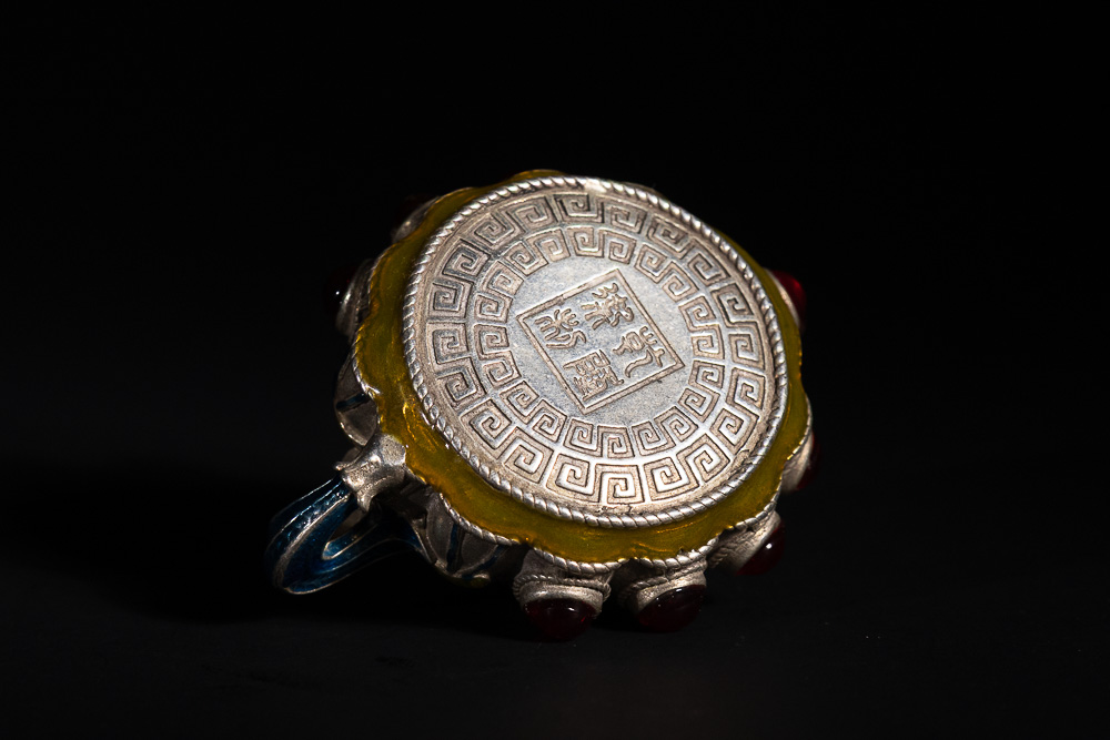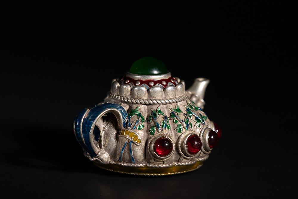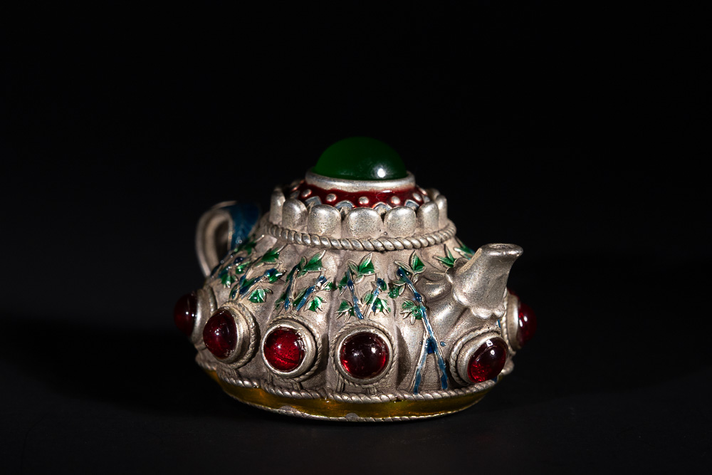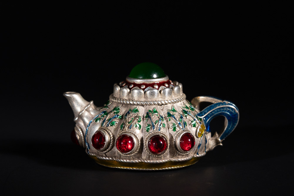 Lot 103: A Chinese Tibetan White Metal Cloisonné and Gem-Inlaid Teapot, Guangxu Mark