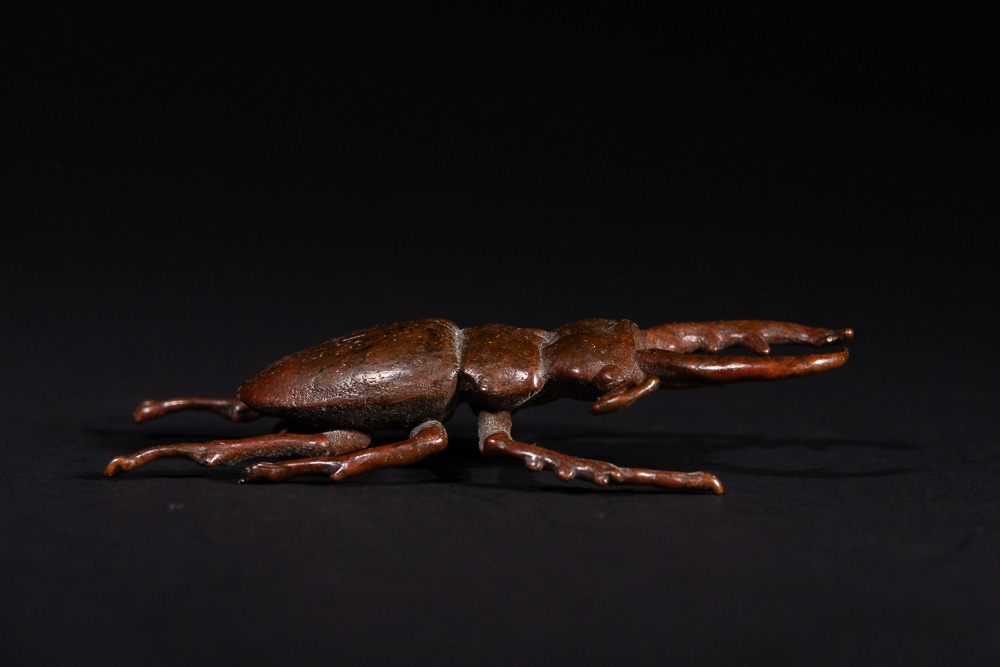A naturalistic sculpture of a stag beetle, cast in a patinated bronze, exhibiting a reddish-brown hue. The piece accurately depicts the insect’s segmented body, six legs, antennae, and prominent mandibles with intricate detail.