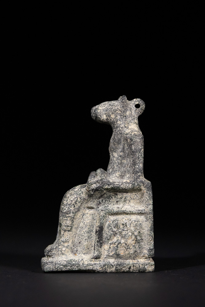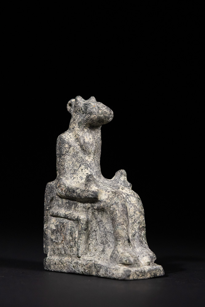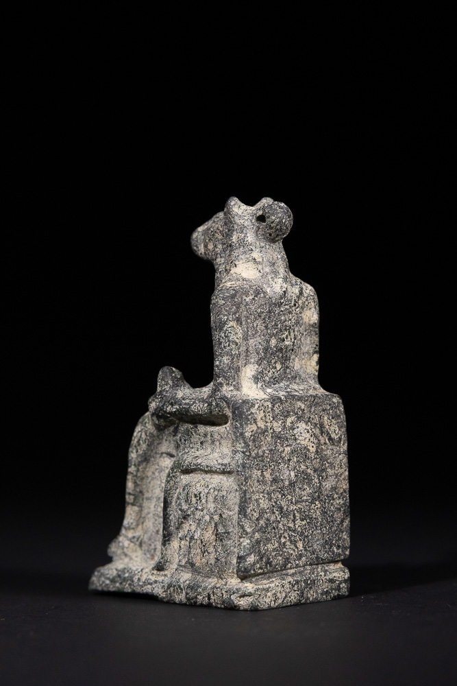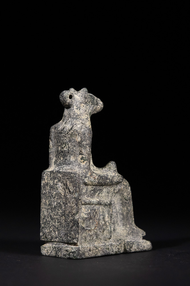 An Ancient Egyptian stone figurine depicting a seated, animal-headed figure on a block-like throne with an integrated rectangular base. The figure has a humanoid body, appearing to wear a long garment, with hands resting in its lap. The animal head features distinct ears or horns and a small loop or perforation at the back of the neck. Fashioned from a dark grey, dense stone, possibly schist or basalt.