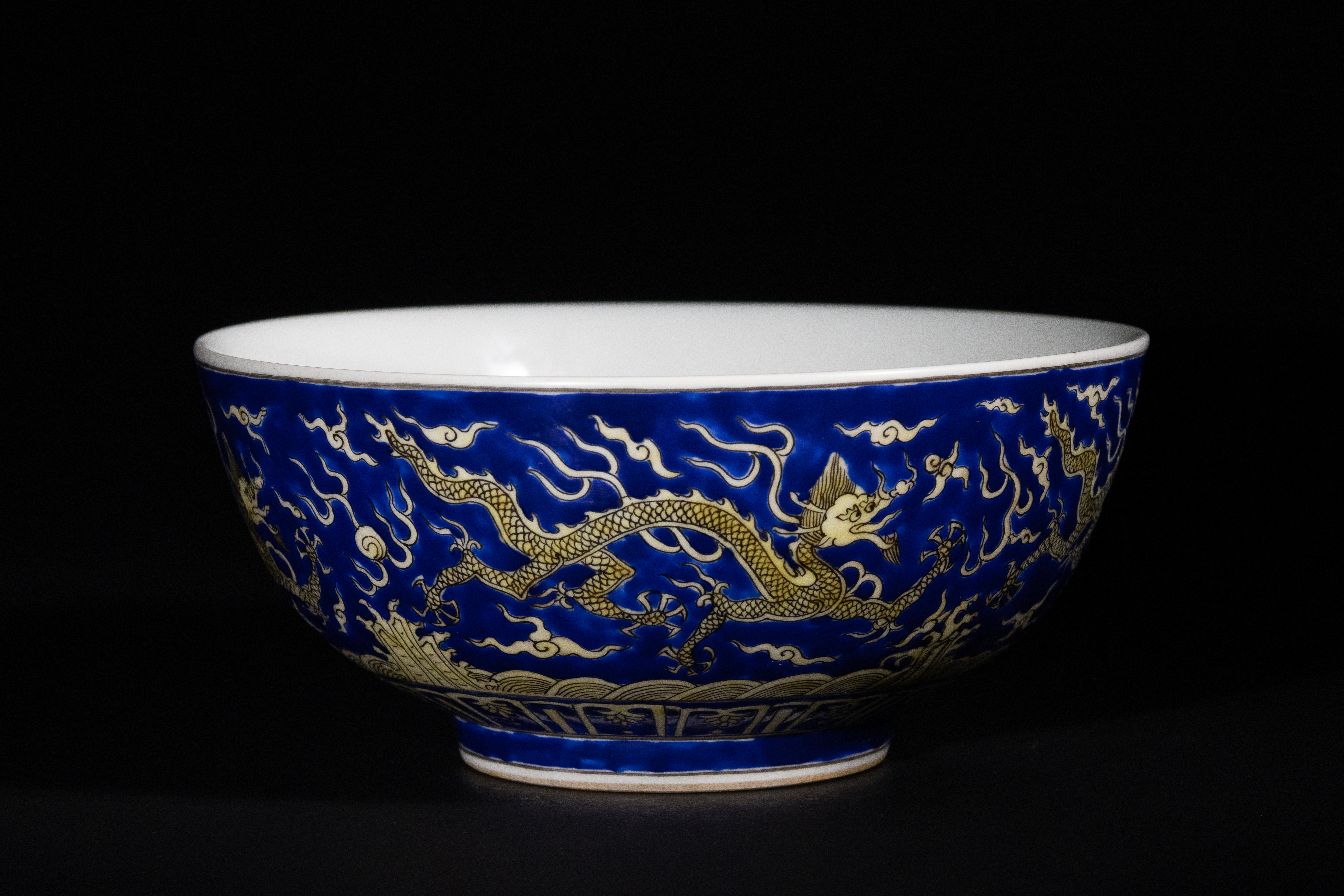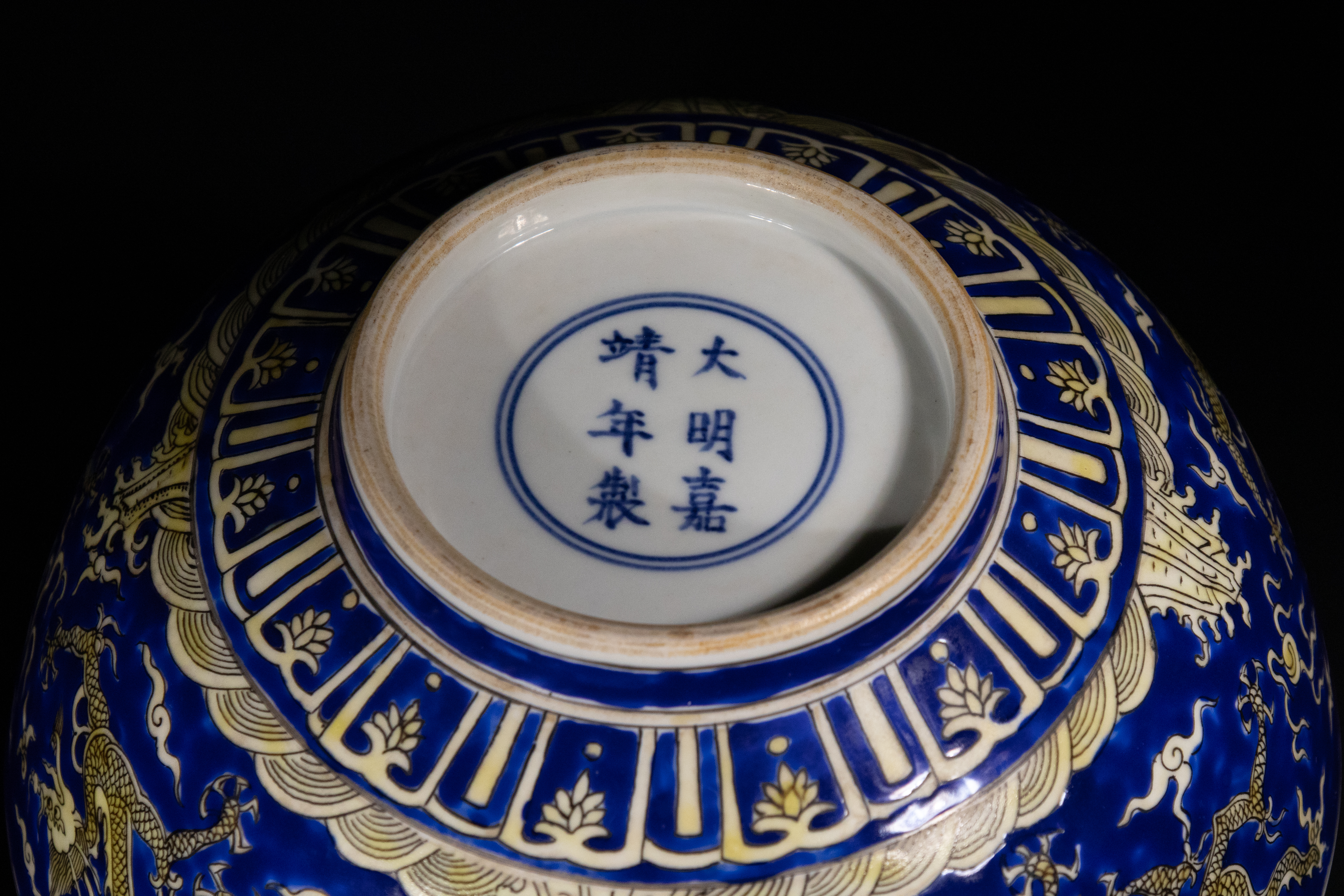 A Chinese blue and yellow enamelled ‘dragon’ bowl, Jiajing mark. The exterior is decorated with two five-clawed dragons amidst stylized clouds and flames, all set against a deep cobalt blue ground, above a band of crashing waves and rocks, with a patterned border near the rim. The decoration is executed in overglaze yellow enamel, outlined in black. The interior features a central medallion depicting two five-clawed dragons pursuing a flaming pearl on a matching blue ground, while the remainder of the interior is glazed white. The base bears an underglaze blue six-character reign mark, "大明嘉靖年製" (Dà Míng Jiājìng Nián Zhì), translating to "Made in the Great Ming Jiajing reign."