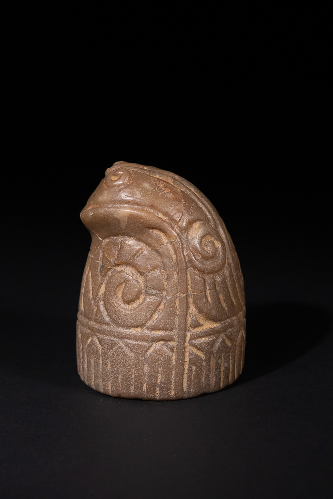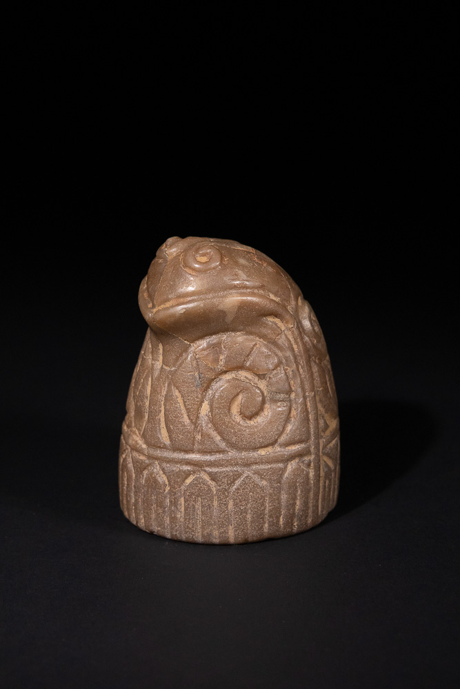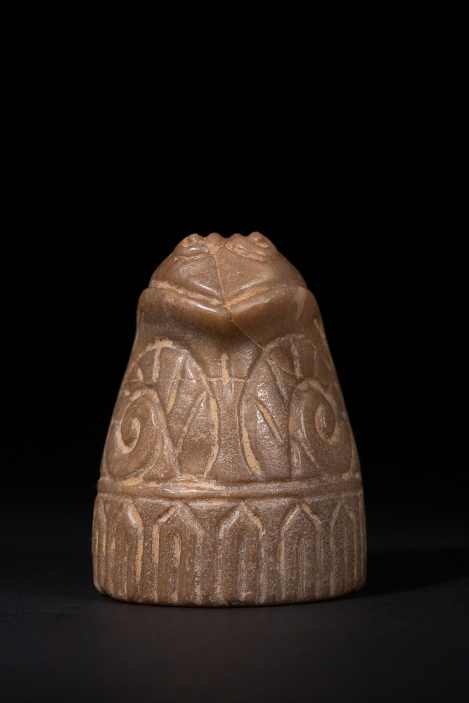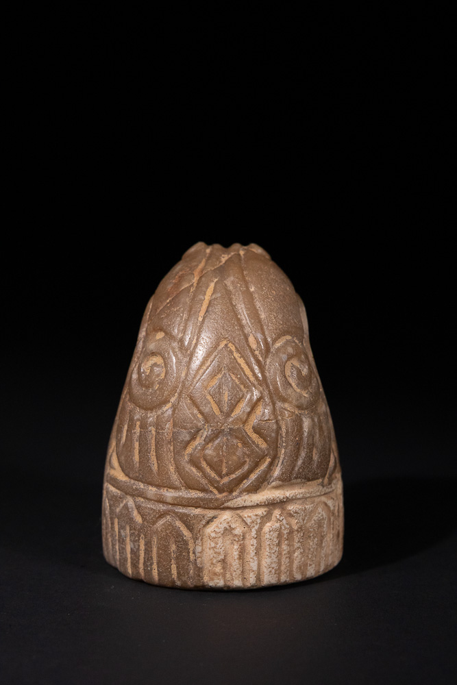 A medieval Norwegian chess piece, carved from a dull brownish-tan or greyish-brown stone. The object is conical or bell-shaped, with a stylized animal head, possibly a frog or toad, depicted at its apex, featuring prominent eyes and a ridged forehead. The main body is deeply incised with large, symmetrical spiral or scroll motifs in an upper register, transitioning to a band of repeating arched or trapezoidal geometric designs around the base.