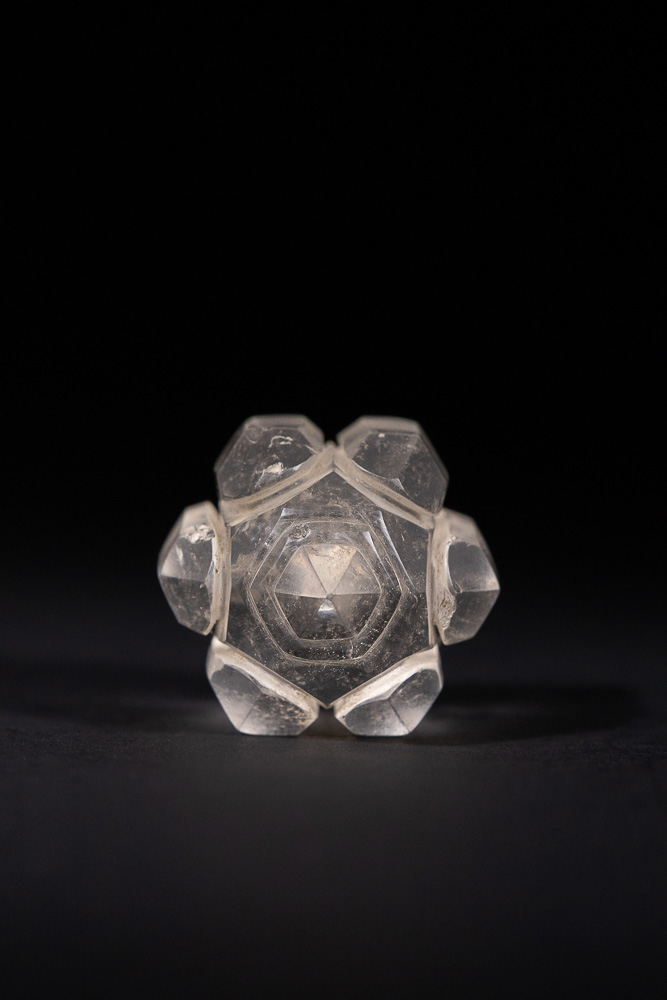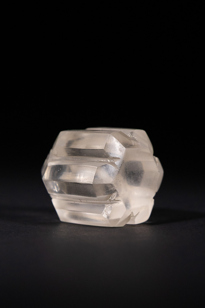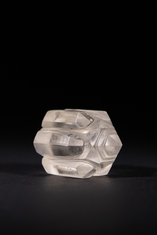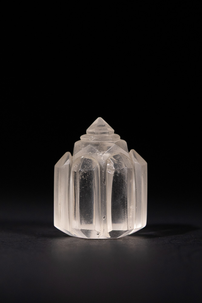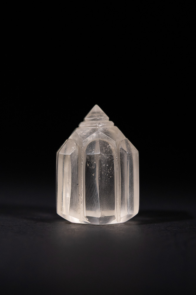 A Mughal rock crystal chess piece, fashioned from translucent, colorless rock crystal. Its intricate geometric form suggests an architectural inspiration, featuring a multi-faceted body with vertical fluting or panels, tapering upwards to a similarly faceted, tiered section that culminates in a pointed finial.