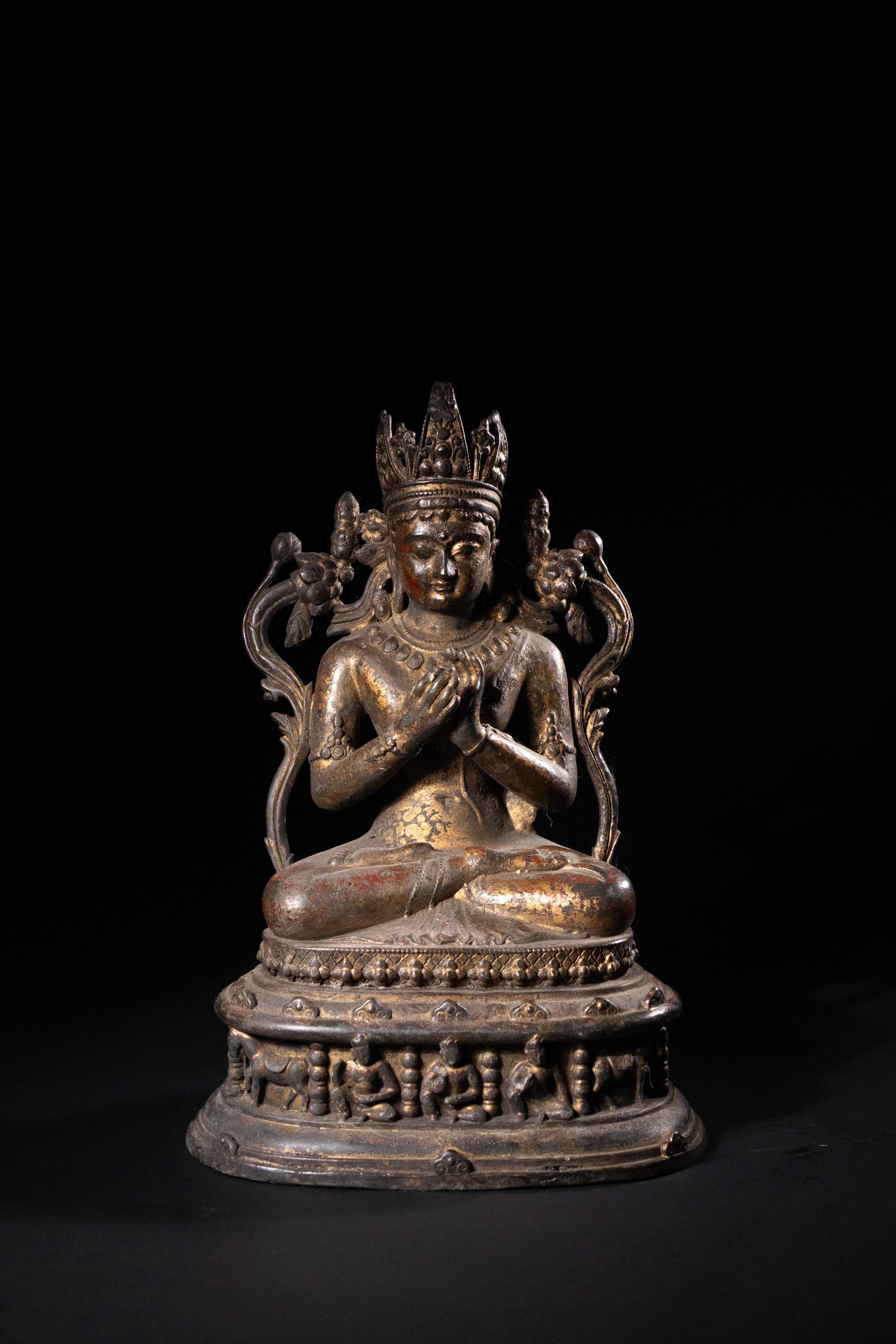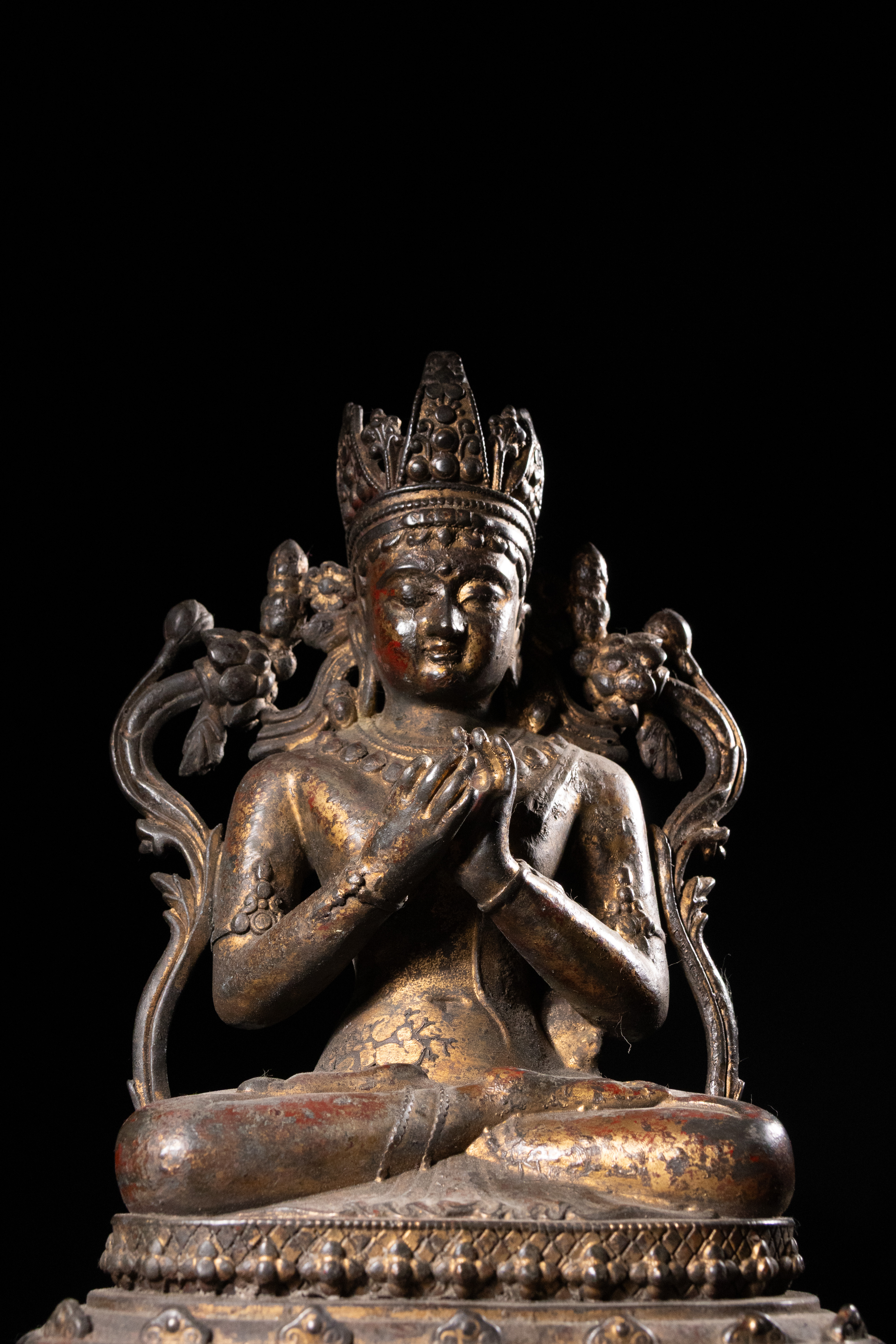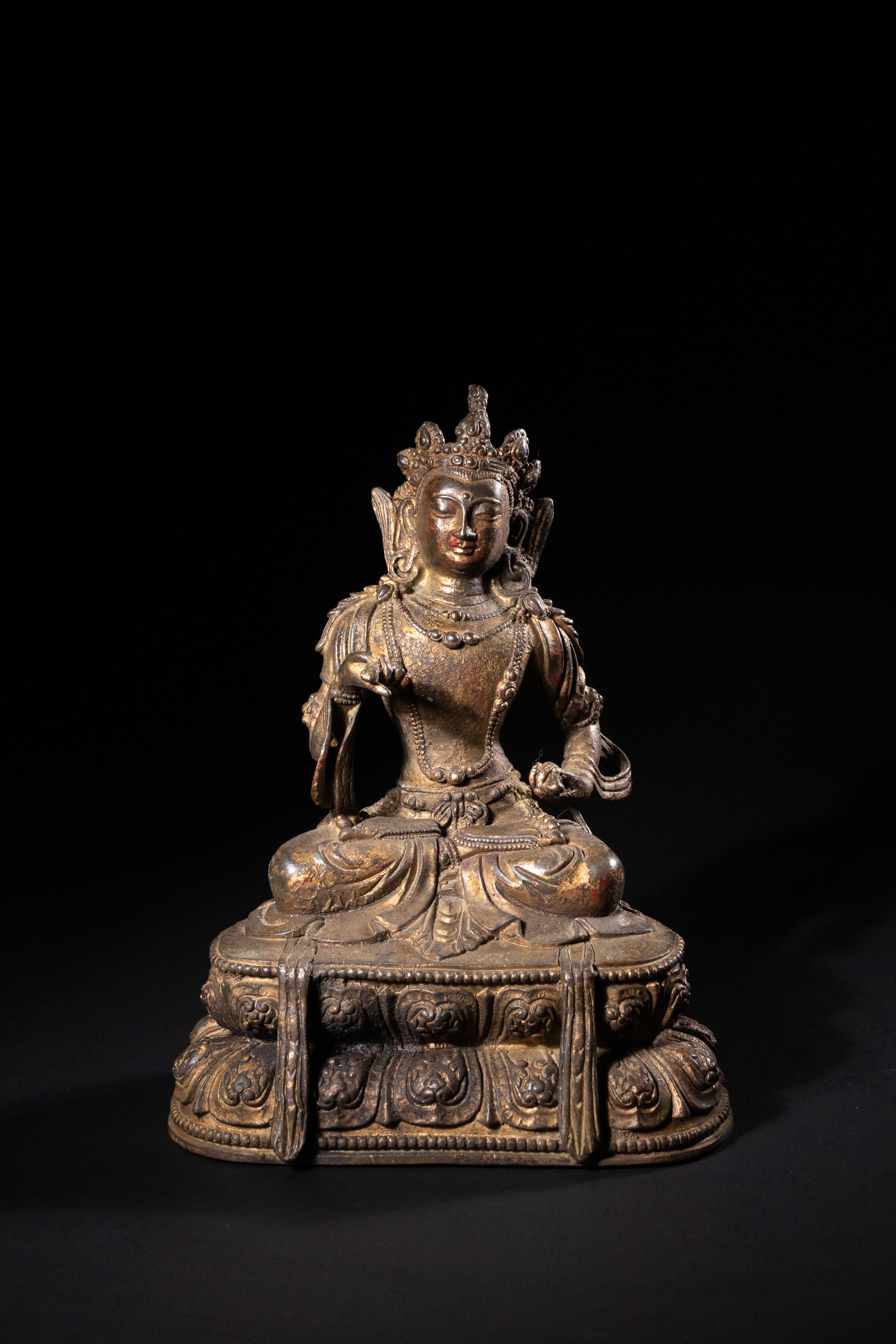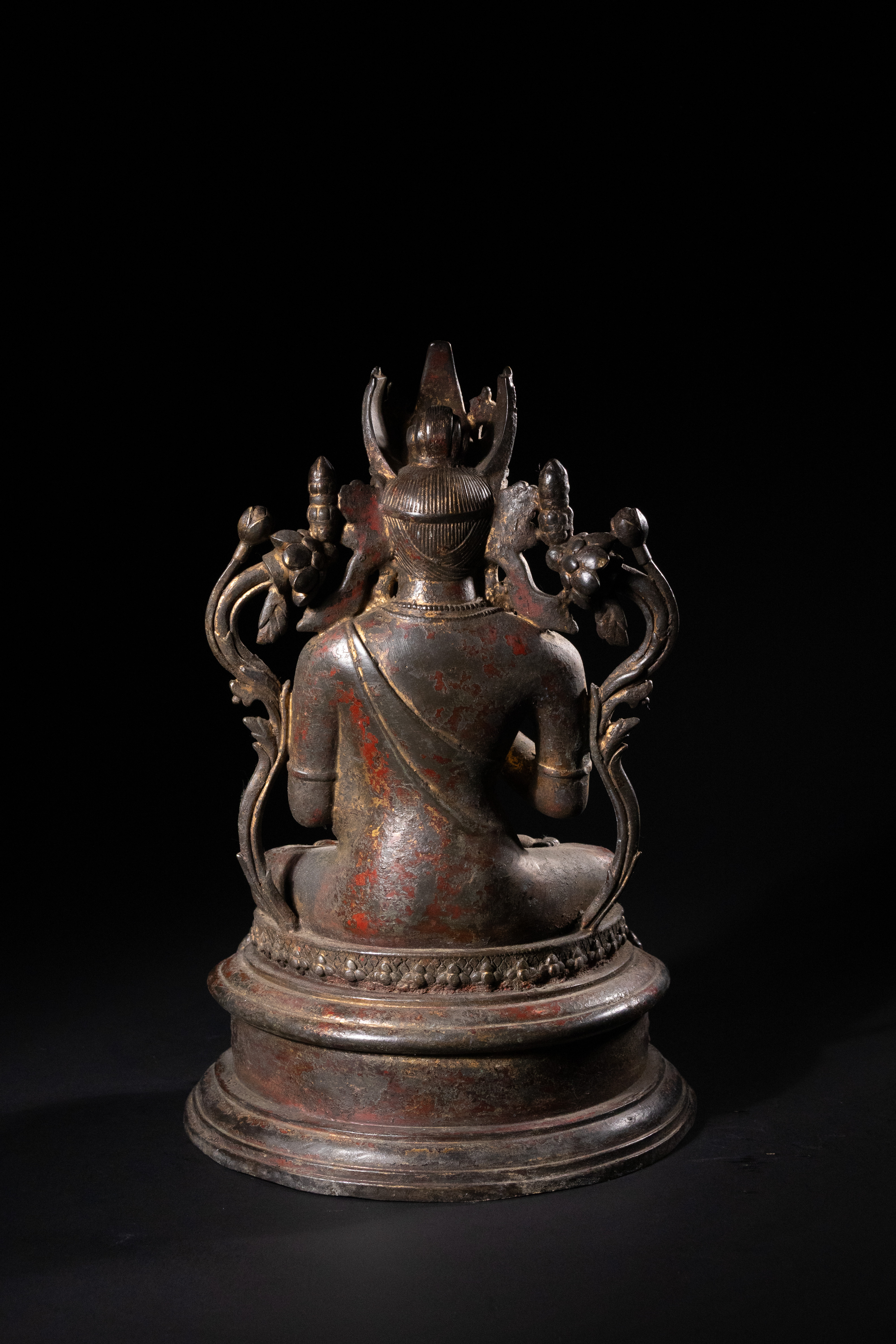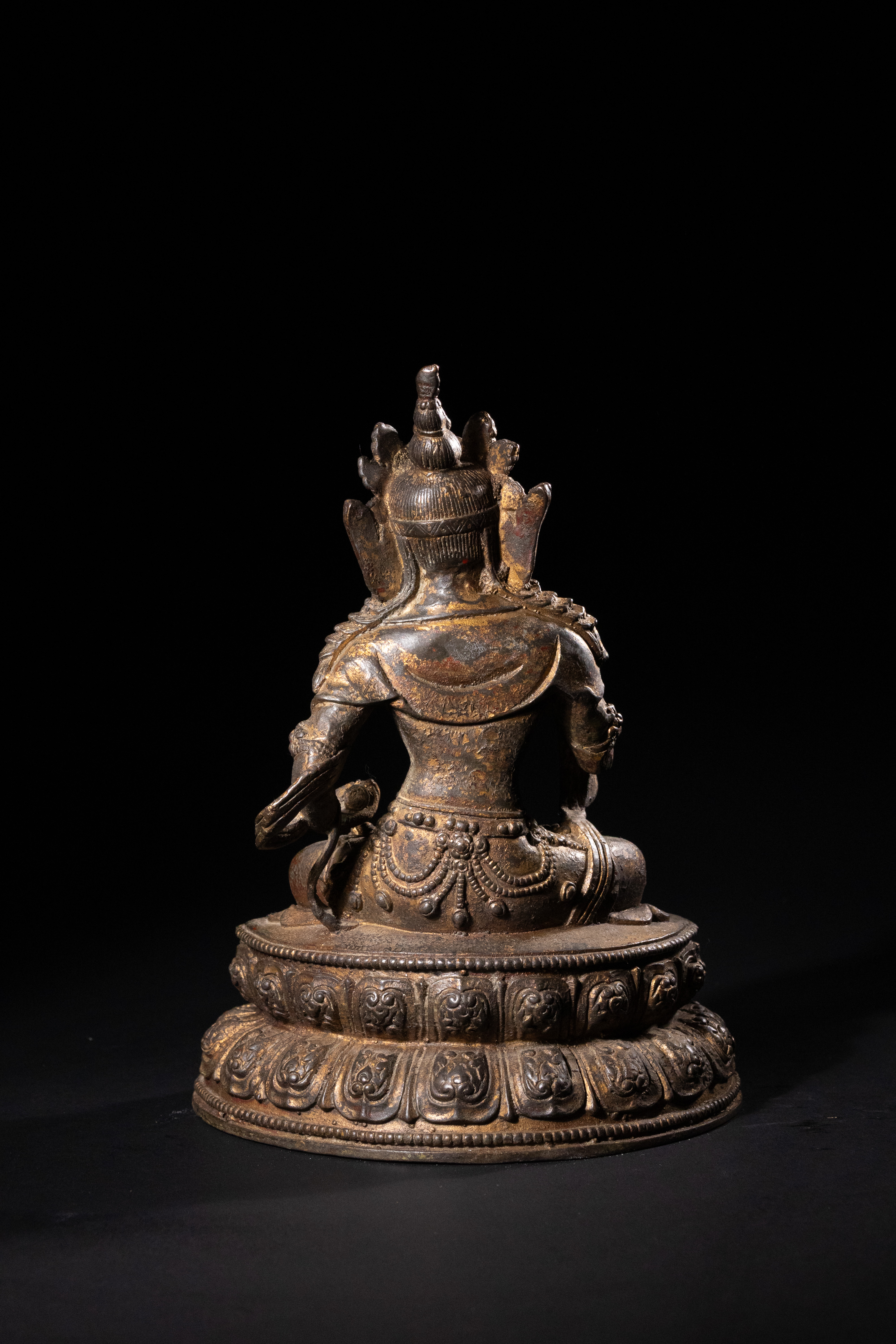 Both items exhibit a dark, well-developed patination, significant loss to their original gilding revealing the underlying metal, and traces of red pigment, consistent with considerable age and handling. No discernible text or specific maker\'s marks are visible. Both appear structurally sound despite surface wear.
