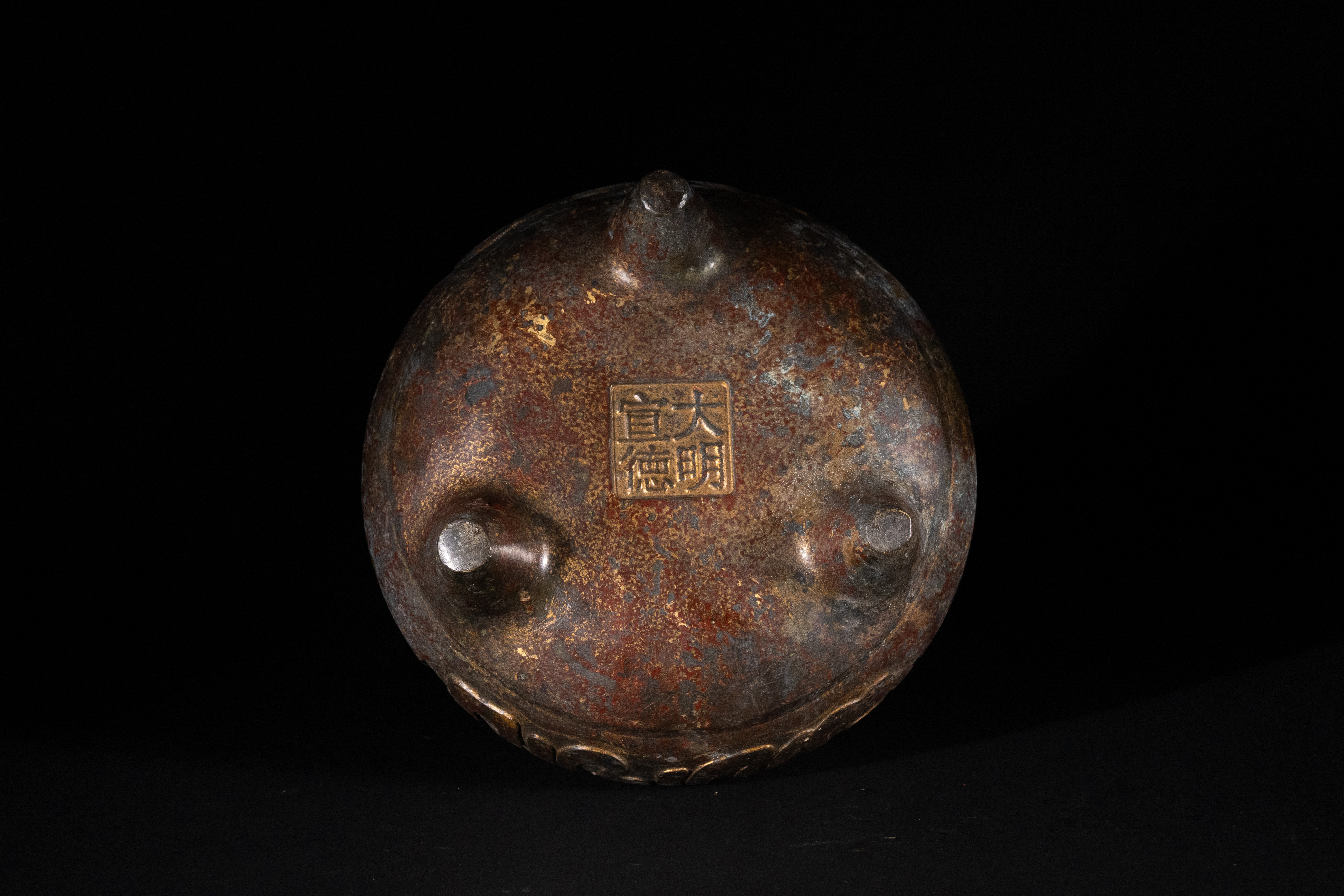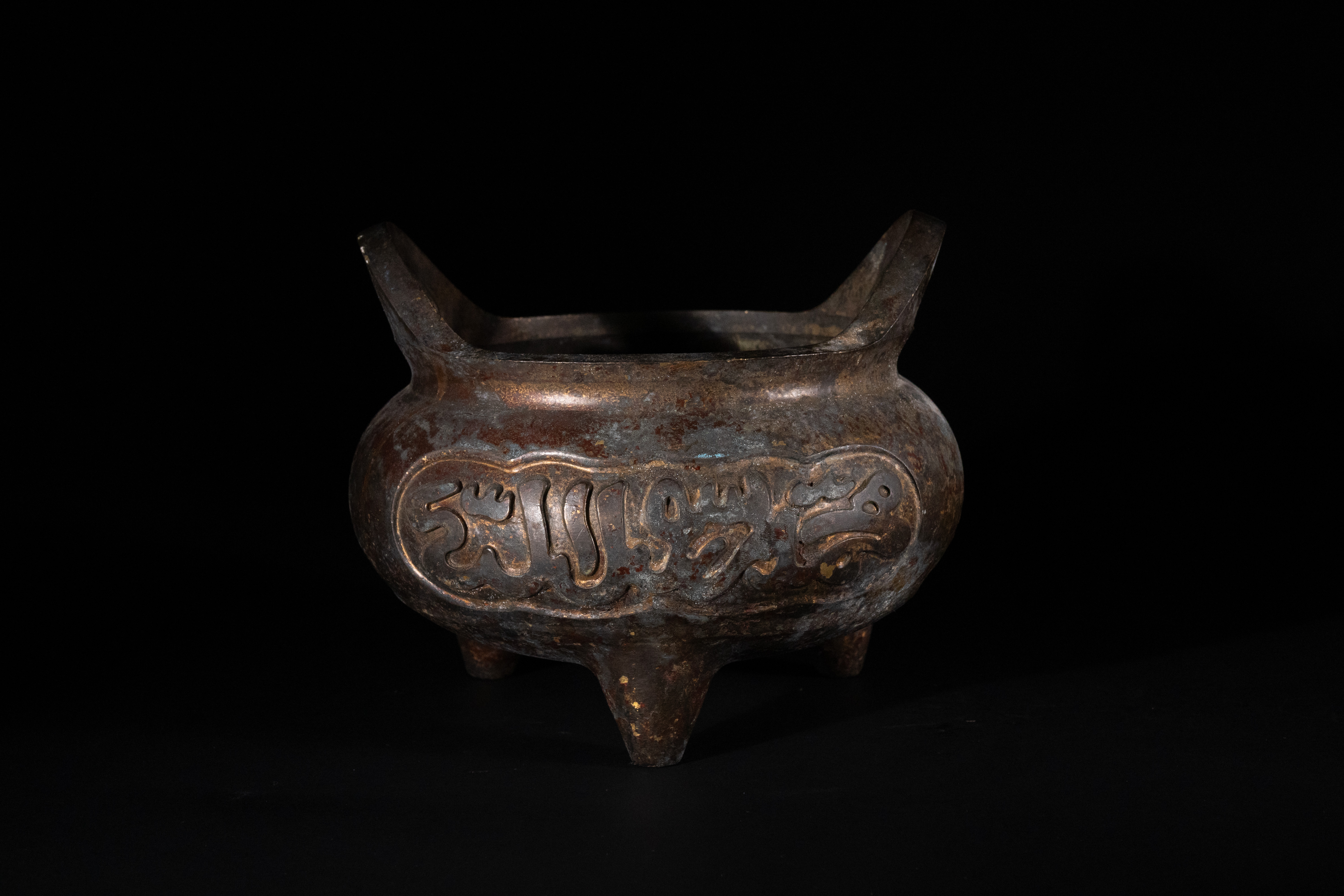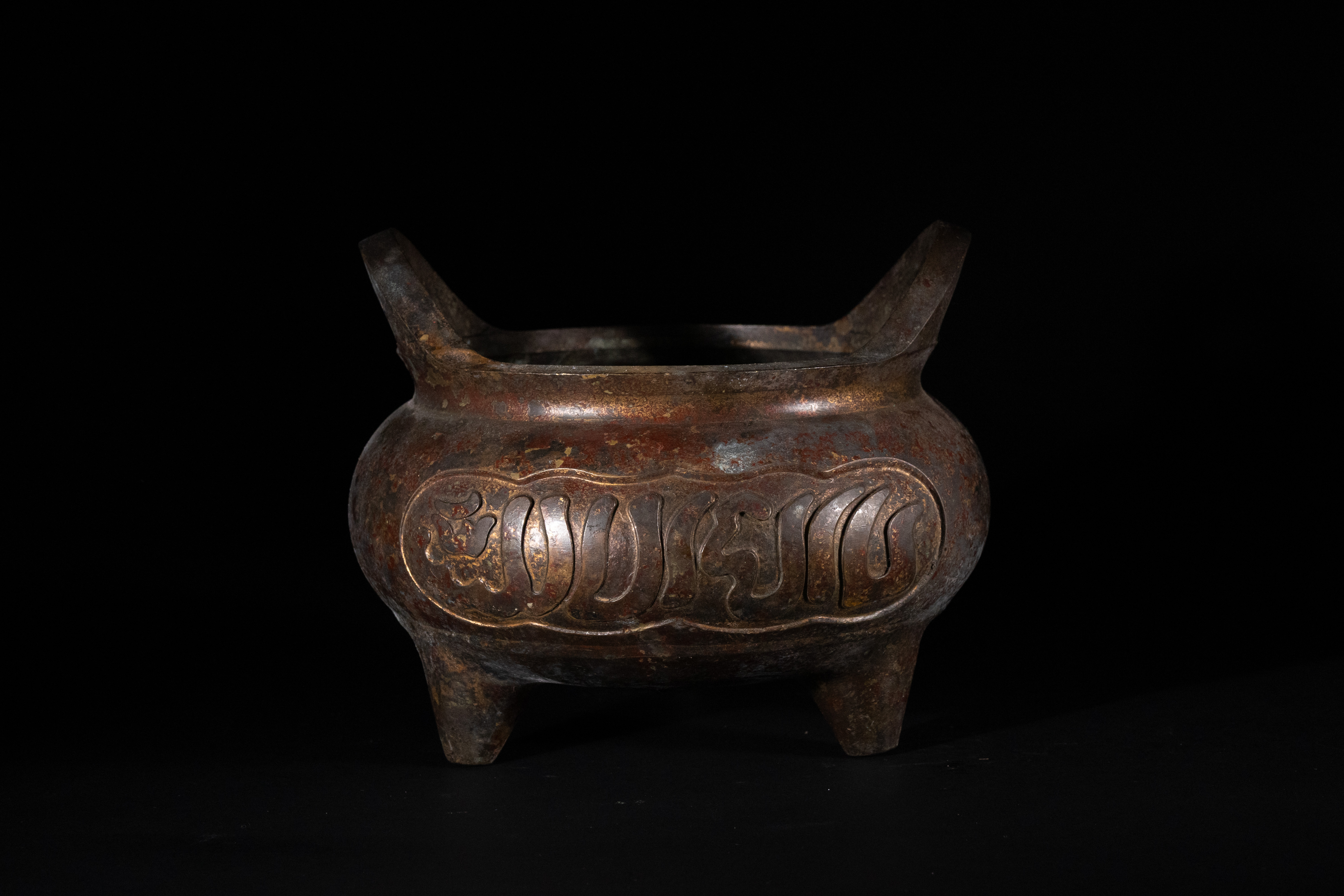 A Chinese bronze ‘Islamic market’ handled tripod censer, bearing a four-character ‘大明宣德’ (Dà Míng Xuāndé) Xuande reign mark. The censer features a bulbous body supported by three tapering legs and flanked by two upright loop handles. The body is decorated with raised, stylized script or calligraphic characters, consistent with Islamic market pieces. The underside features a recessed rectangular cartouche prominently displaying the ‘Great Ming Xuande’ mark.