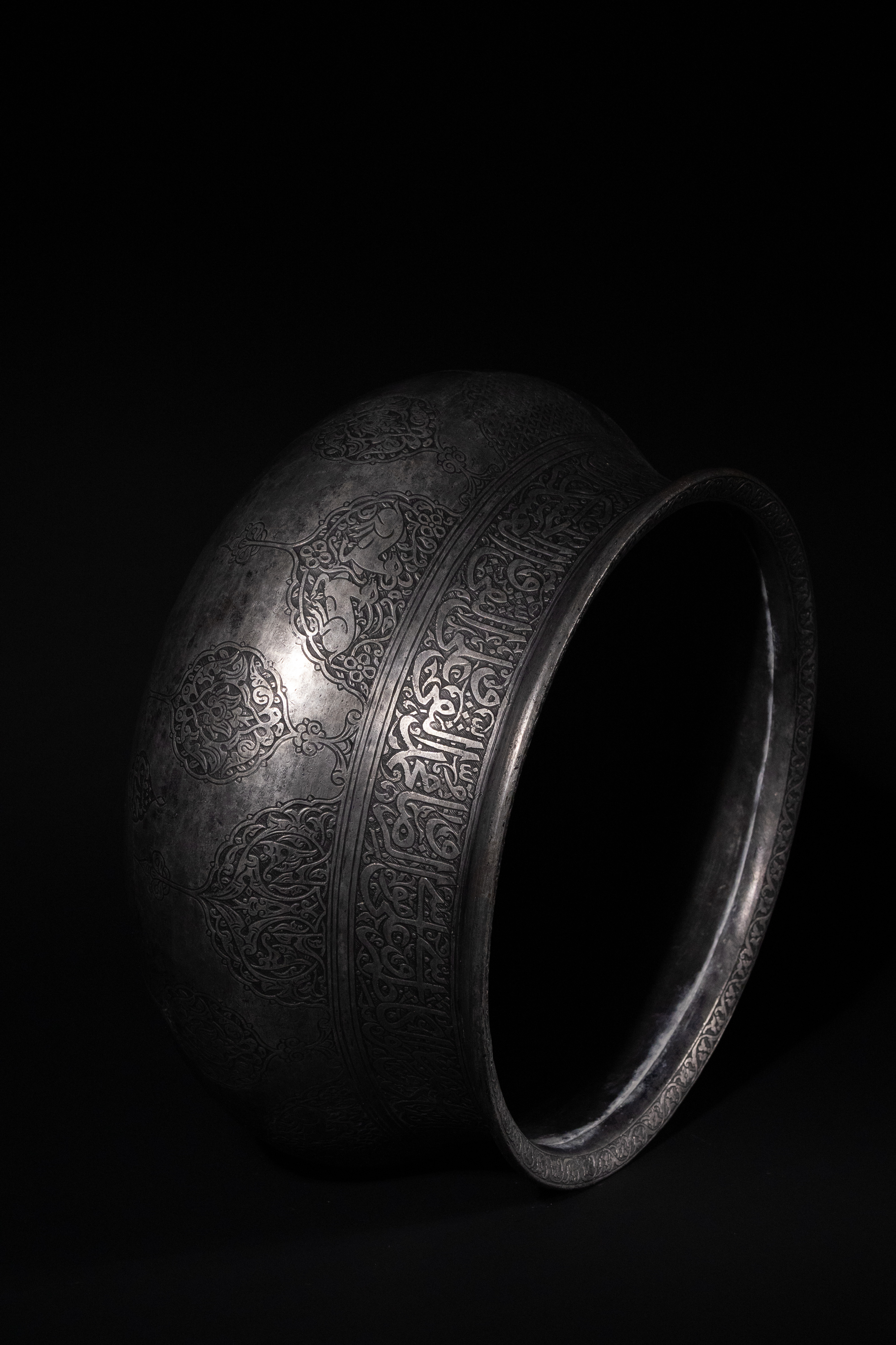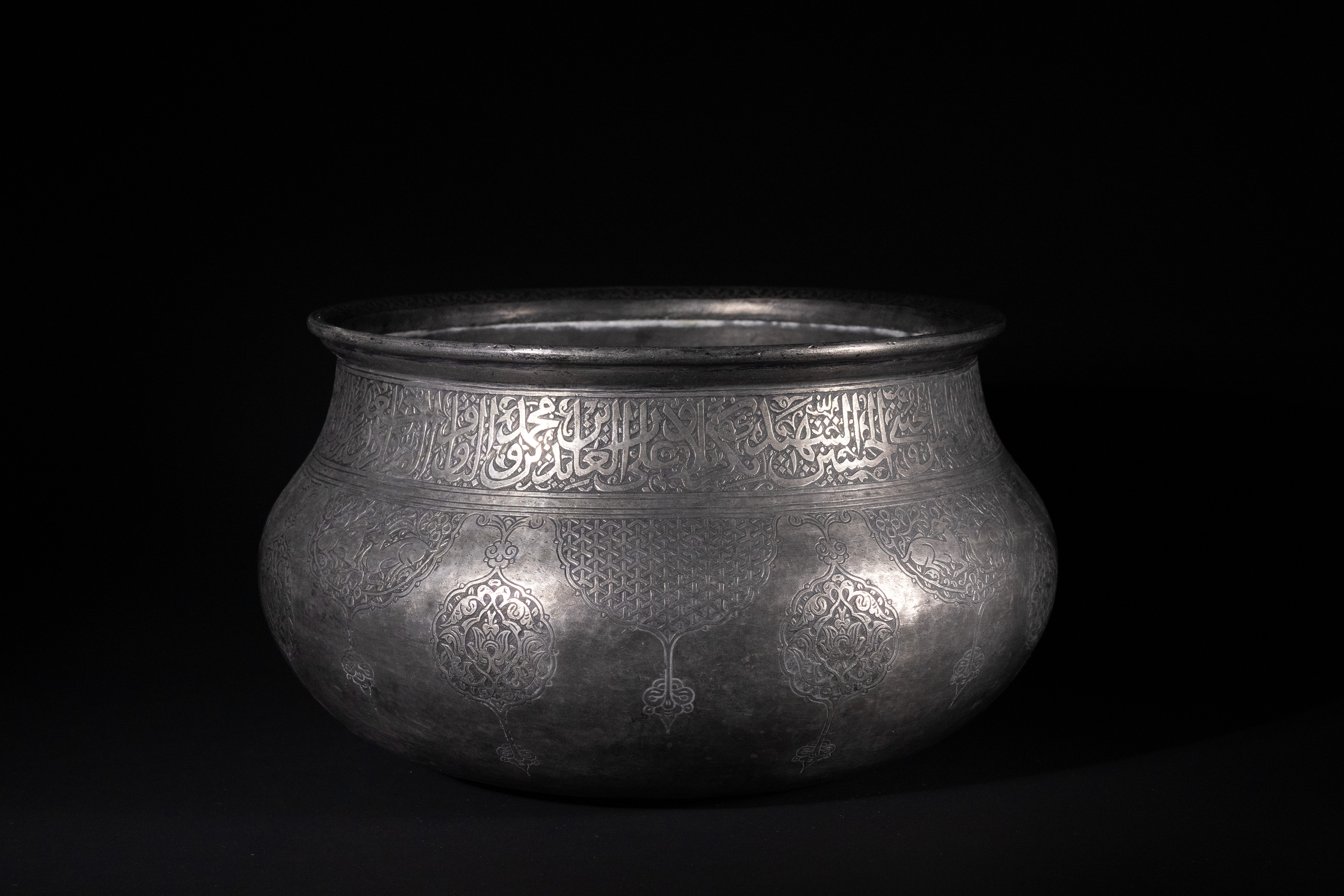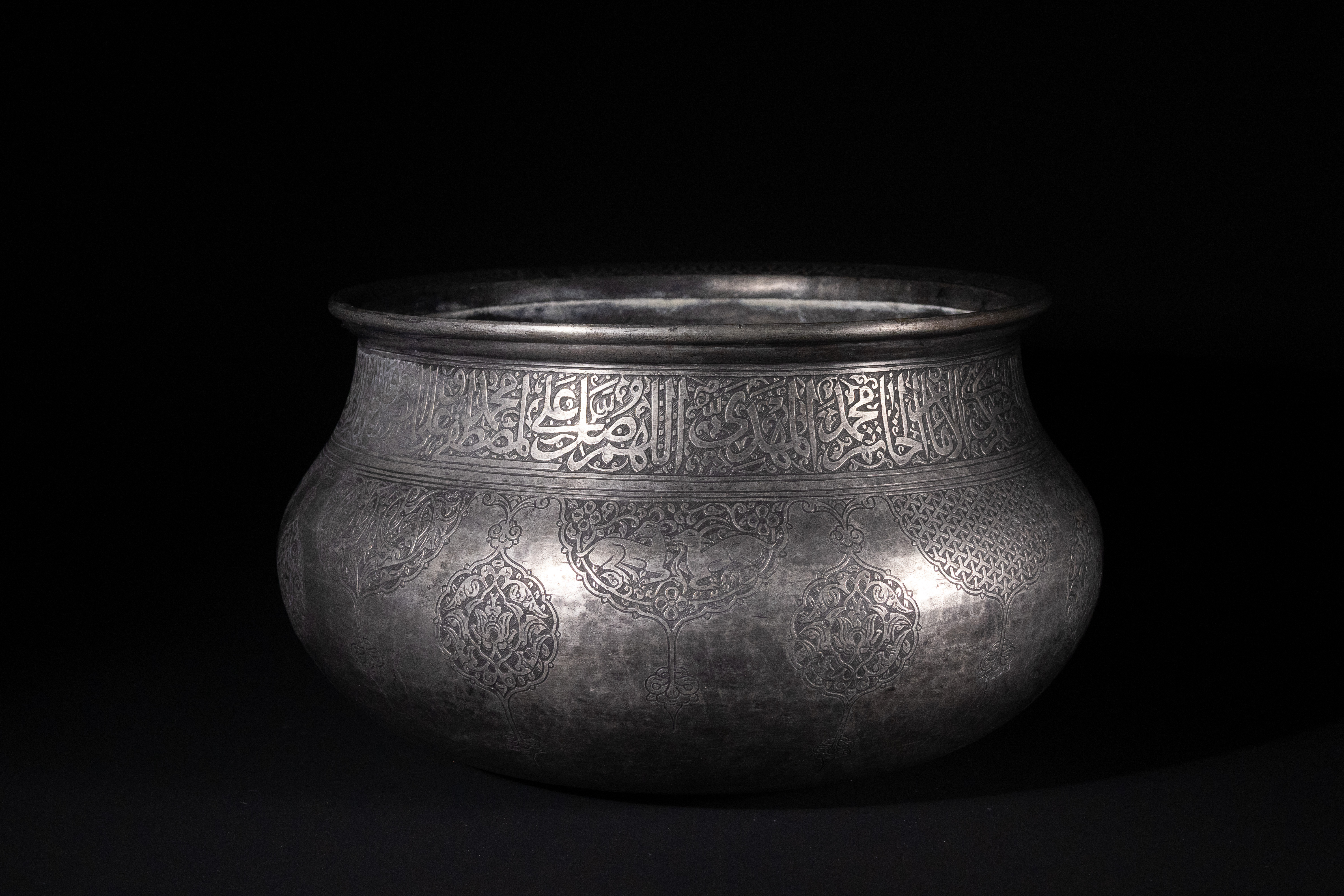 A Safavid tinned copper bowl, Persia, 17th Century. This wide, shallow, and rounded basin-form bowl is crafted from silver-toned metal, exhibiting a visible hammered texture. The upper body features a prominent band of intricate Arabic calligraphy, which translates to "Perpetual glory, increasing prosperity, lasting dominion, lofty grace, good fortune, happiness, glad tidings, and well-being." Below this inscription, the body is adorned with engraved medallions containing arabesque foliate motifs interspersed with geometric patterns.