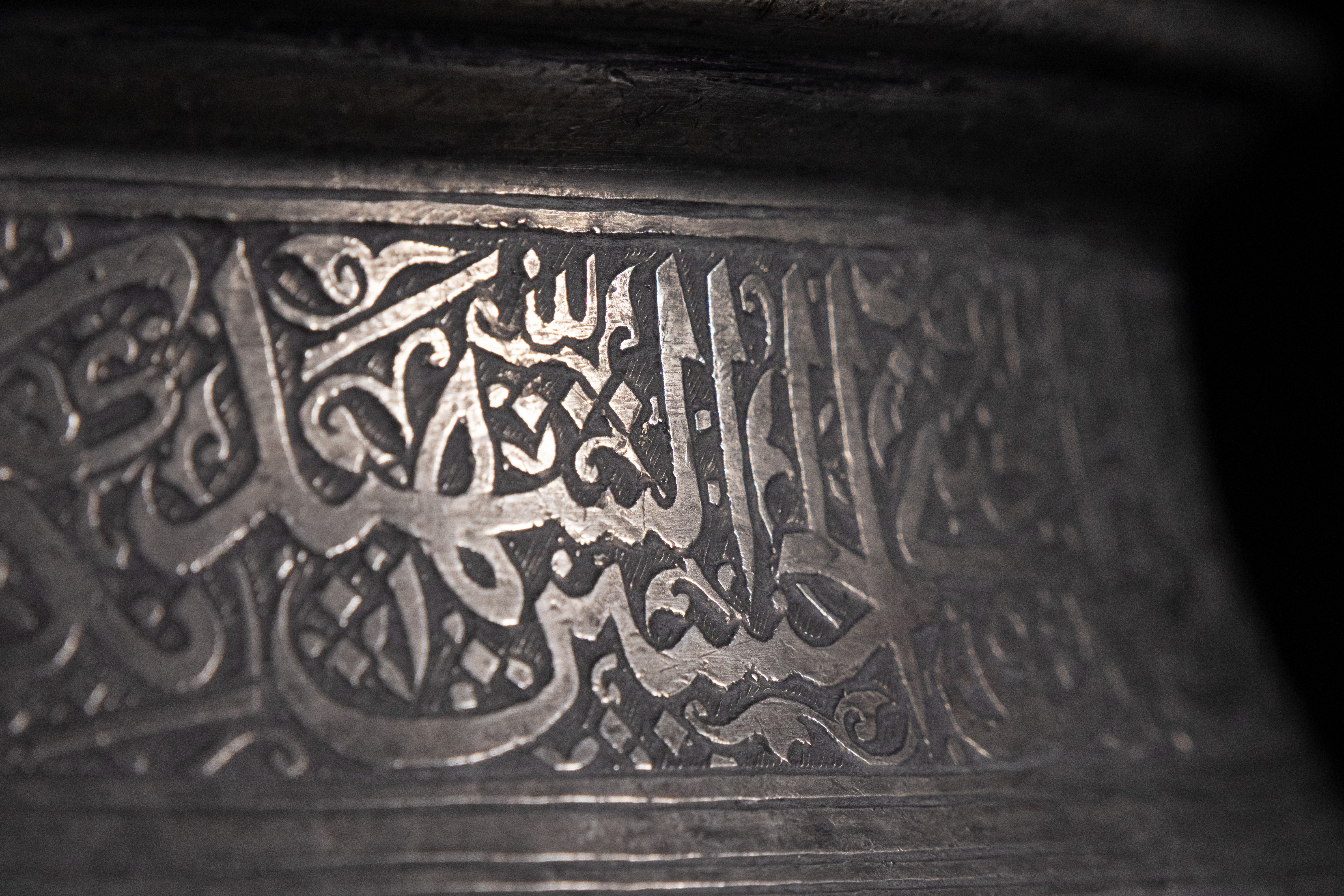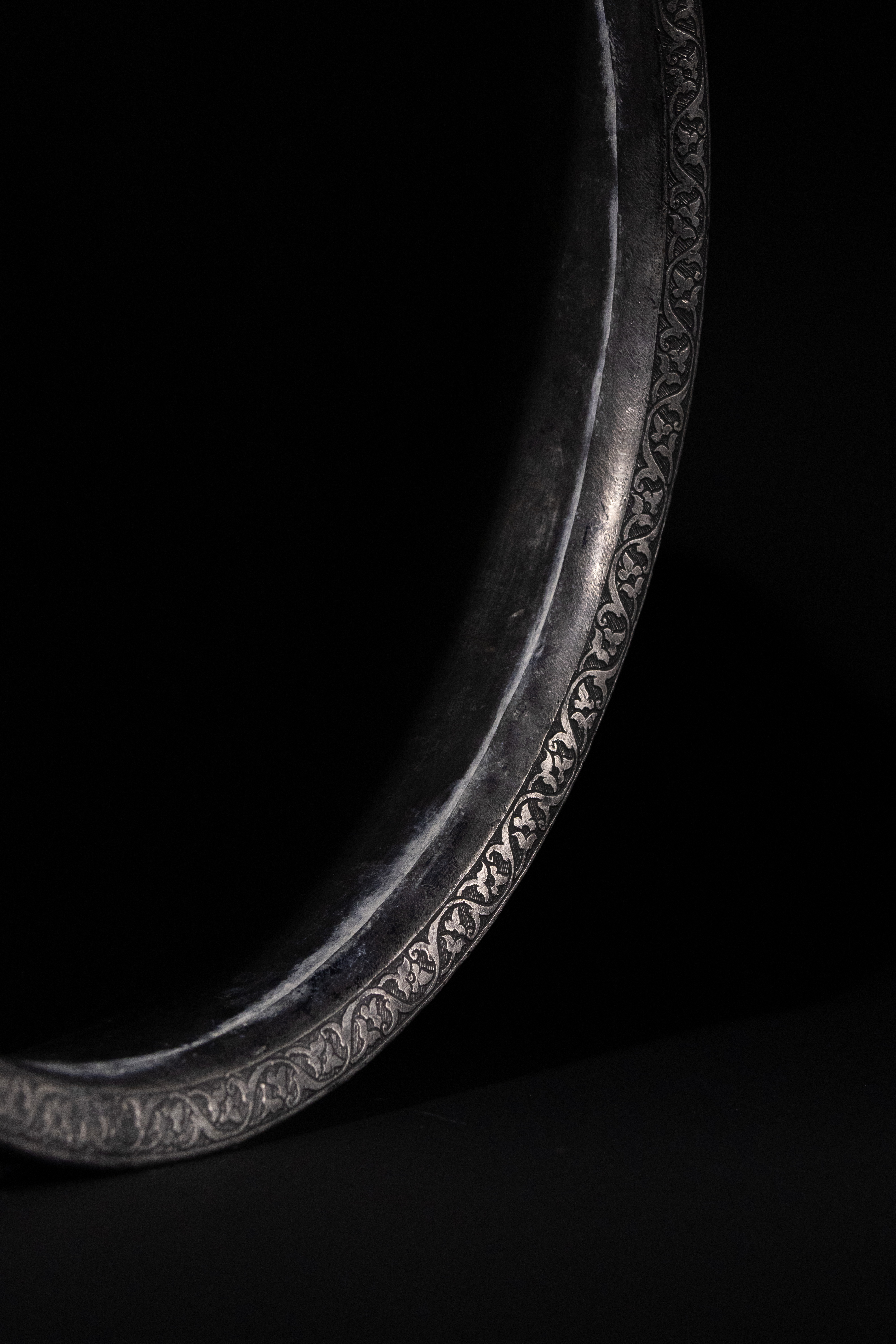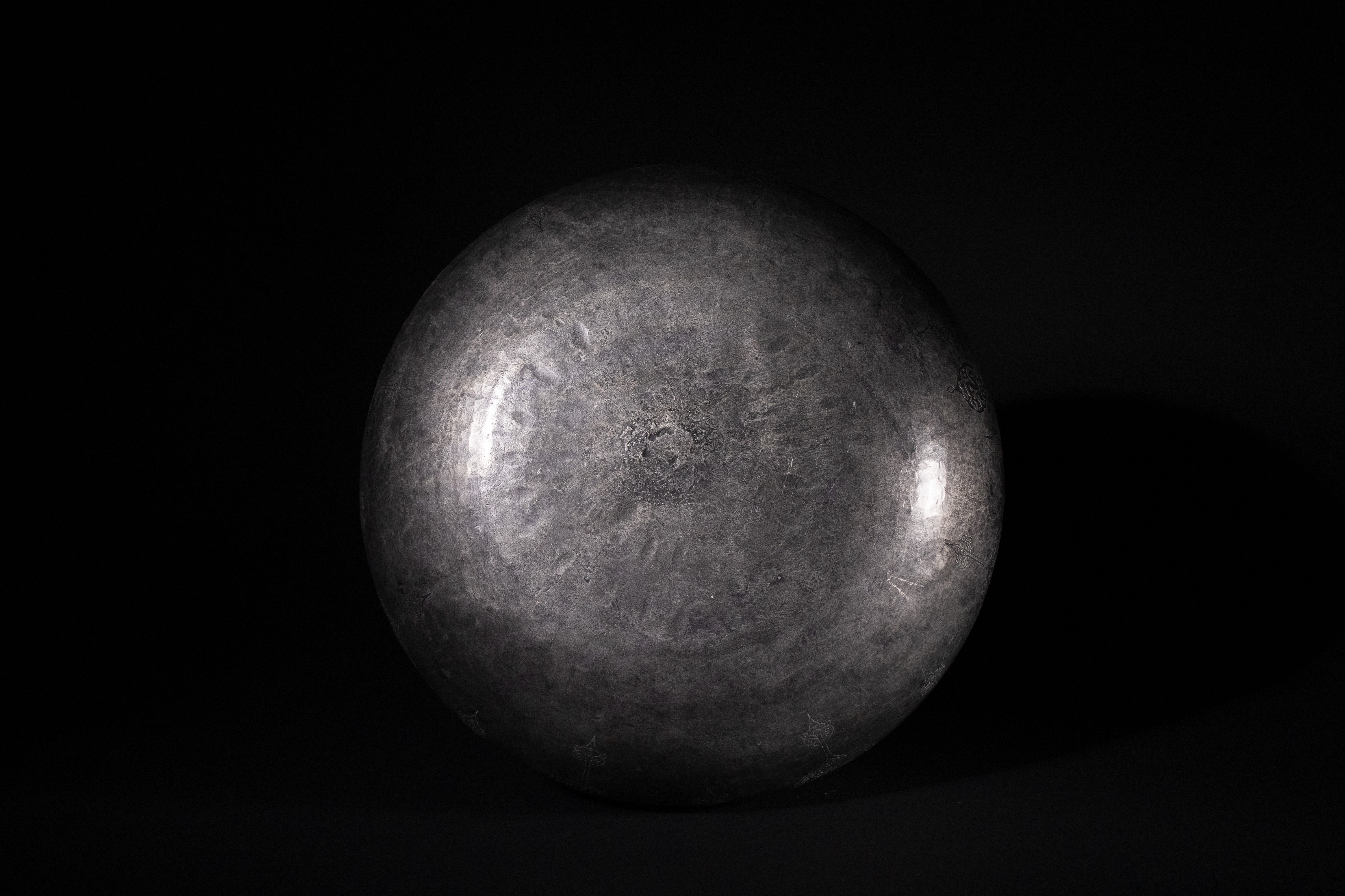 A Safavid tinned copper bowl, Persia, 17th Century. This wide, shallow, and rounded basin-form bowl is crafted from silver-toned metal, exhibiting a visible hammered texture. The upper body features a prominent band of intricate Arabic calligraphy, which translates to "Perpetual glory, increasing prosperity, lasting dominion, lofty grace, good fortune, happiness, glad tidings, and well-being." Below this inscription, the body is adorned with engraved medallions containing arabesque foliate motifs interspersed with geometric patterns.