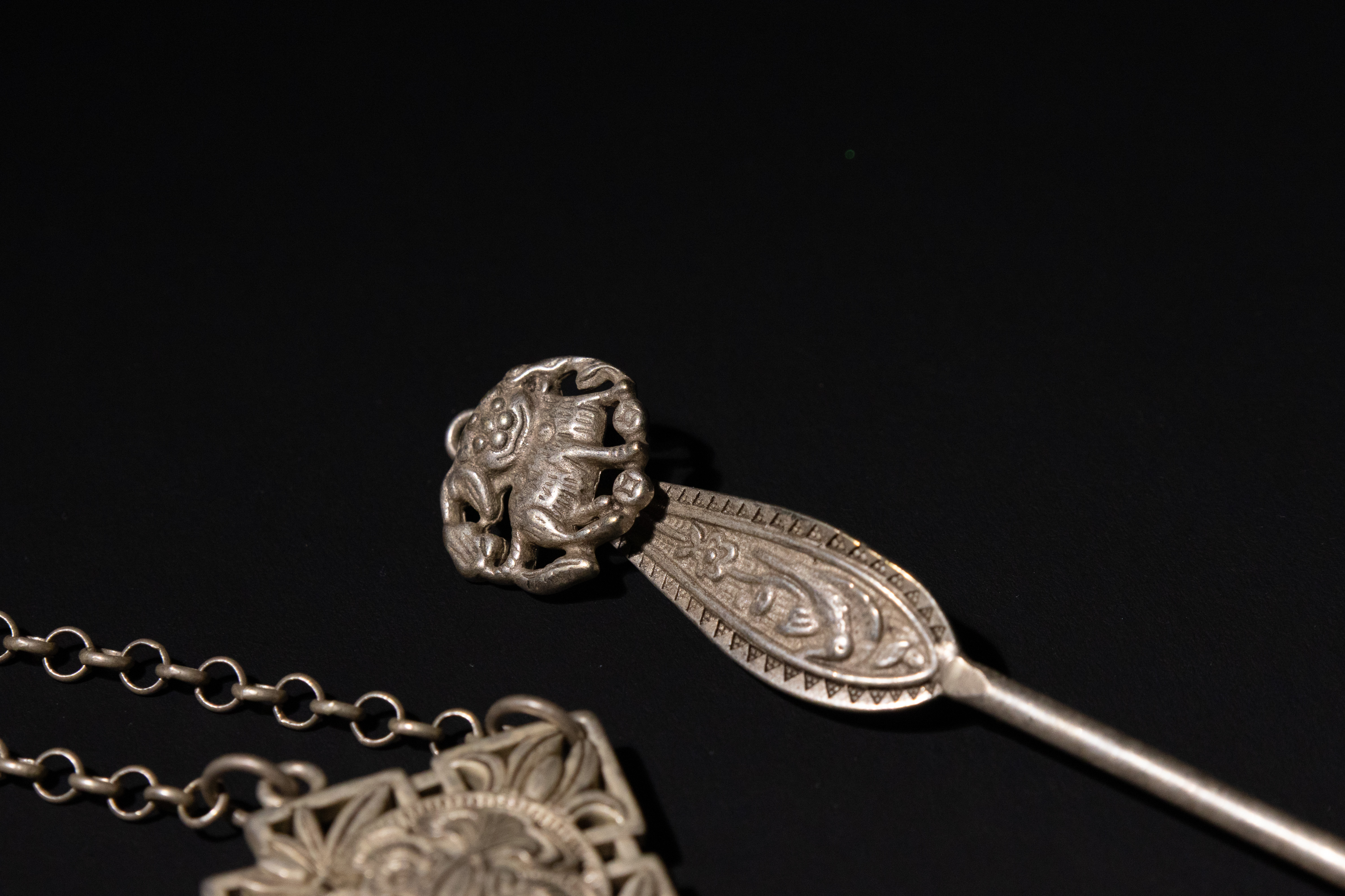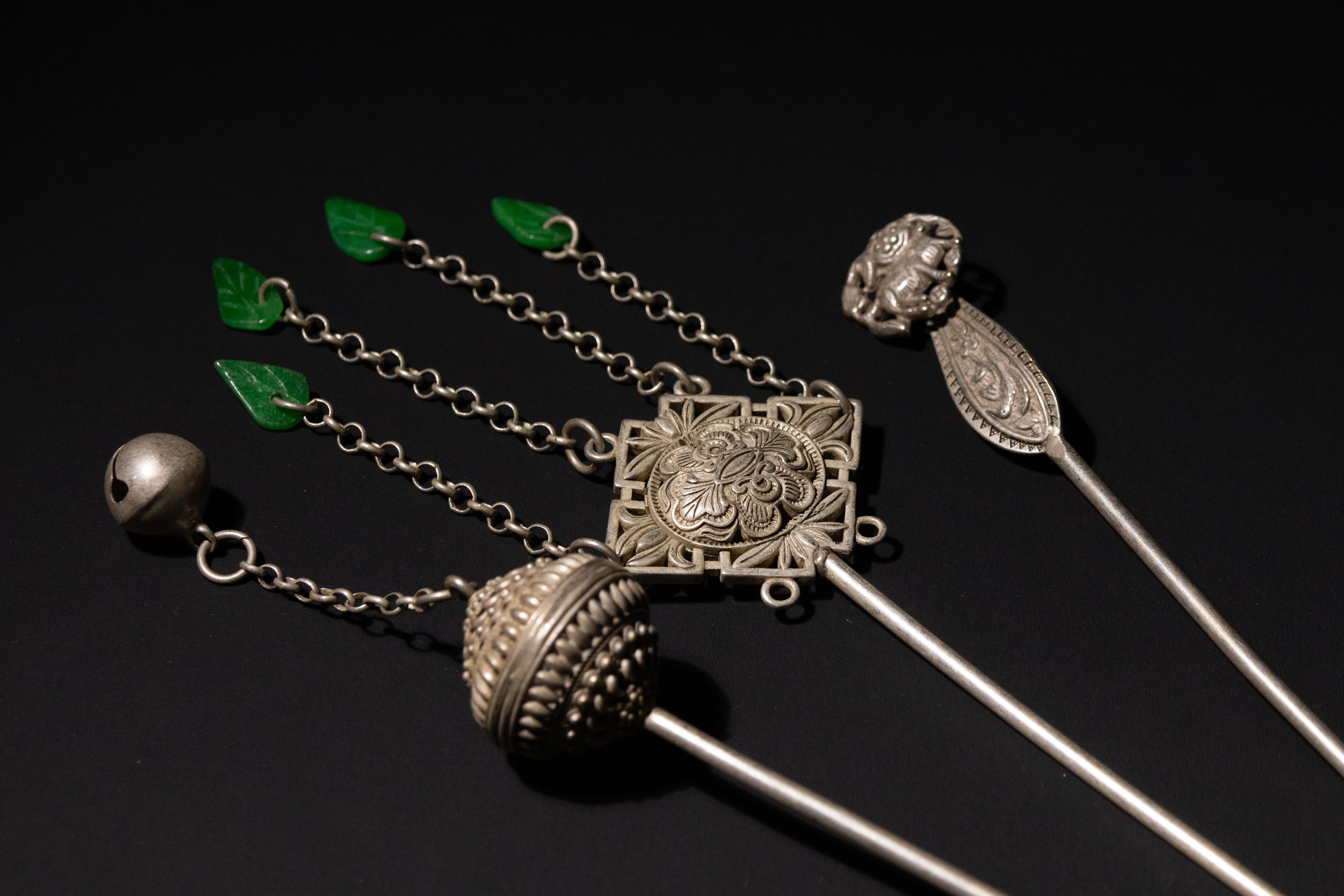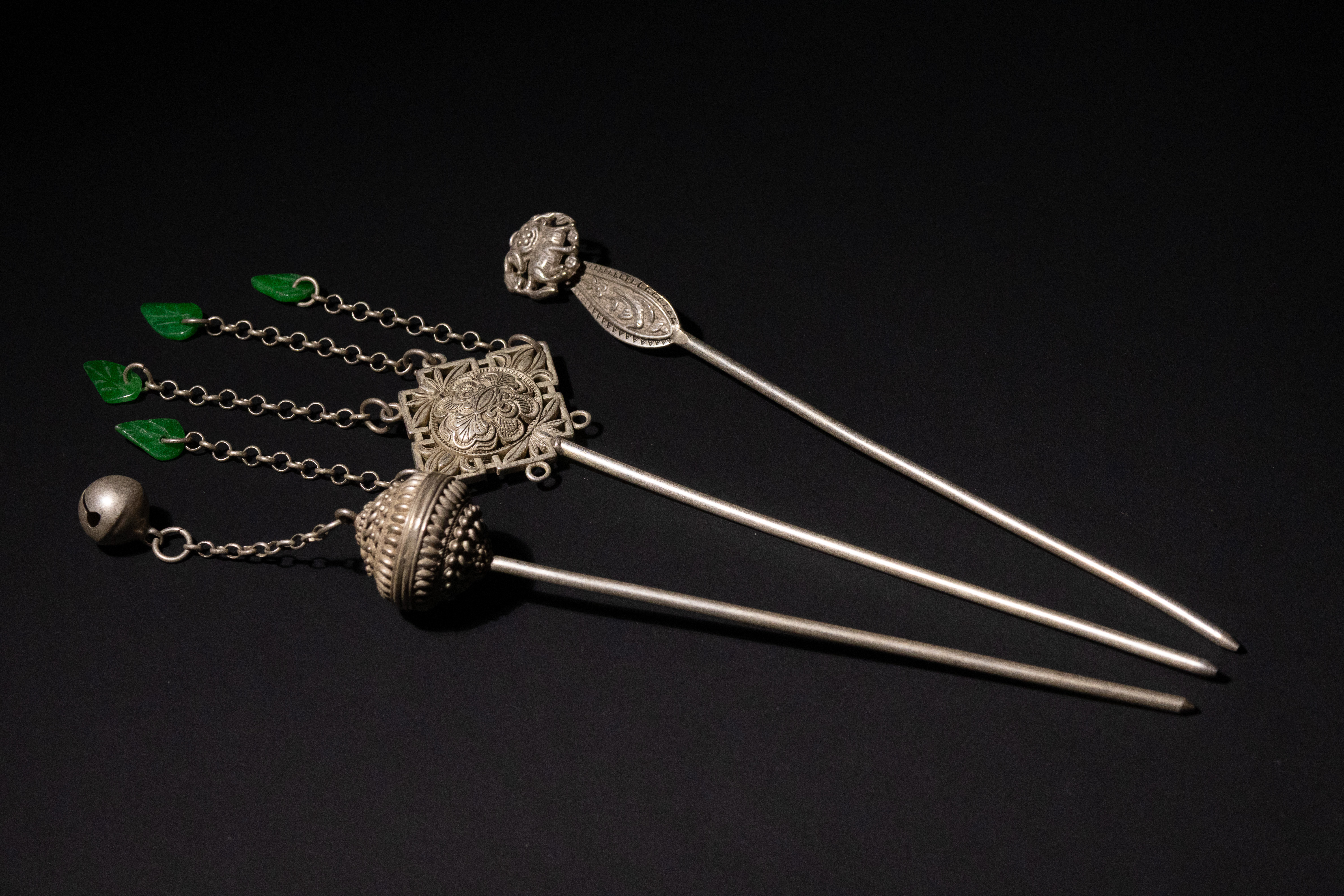 A lot of three antique Chinese white metal hairpins. The most elaborate hairpin features a prominent spherical finial with intricate wirework, connected by chains to a central square panel adorned with a repoussé floral motif; four additional chains extend from this panel, each terminating in a carved green jade leaf. A small bell also hangs from the spherical finial. The second hairpin has a paddle-shaped finial extensively engraved with foliate patterns, surmounted by a three-dimensional mythical creature, possibly a foo dog or similar auspicious animal. The third hairpin displays a simpler elongated finial decorated with engraved floral and scroll patterns.