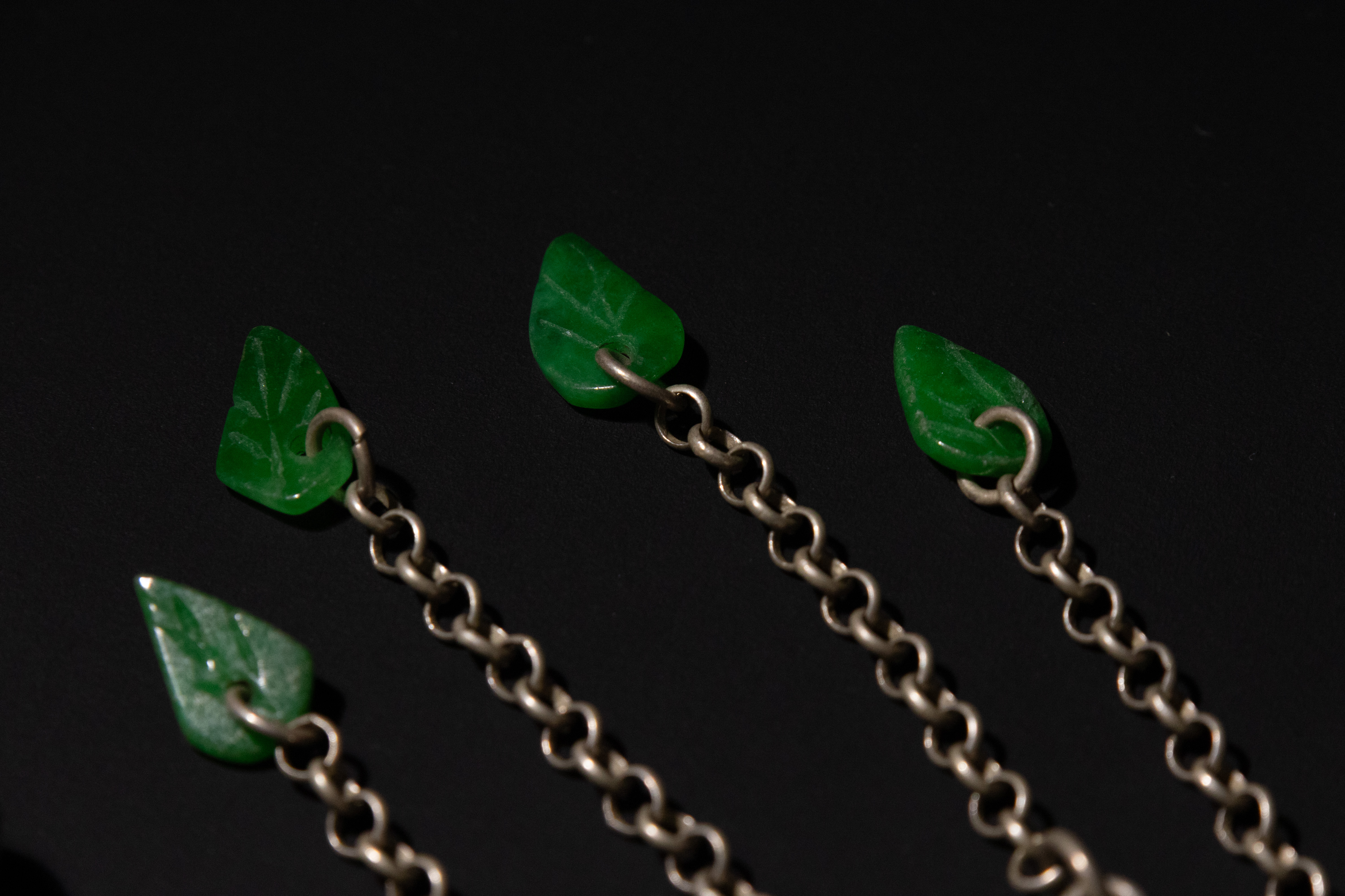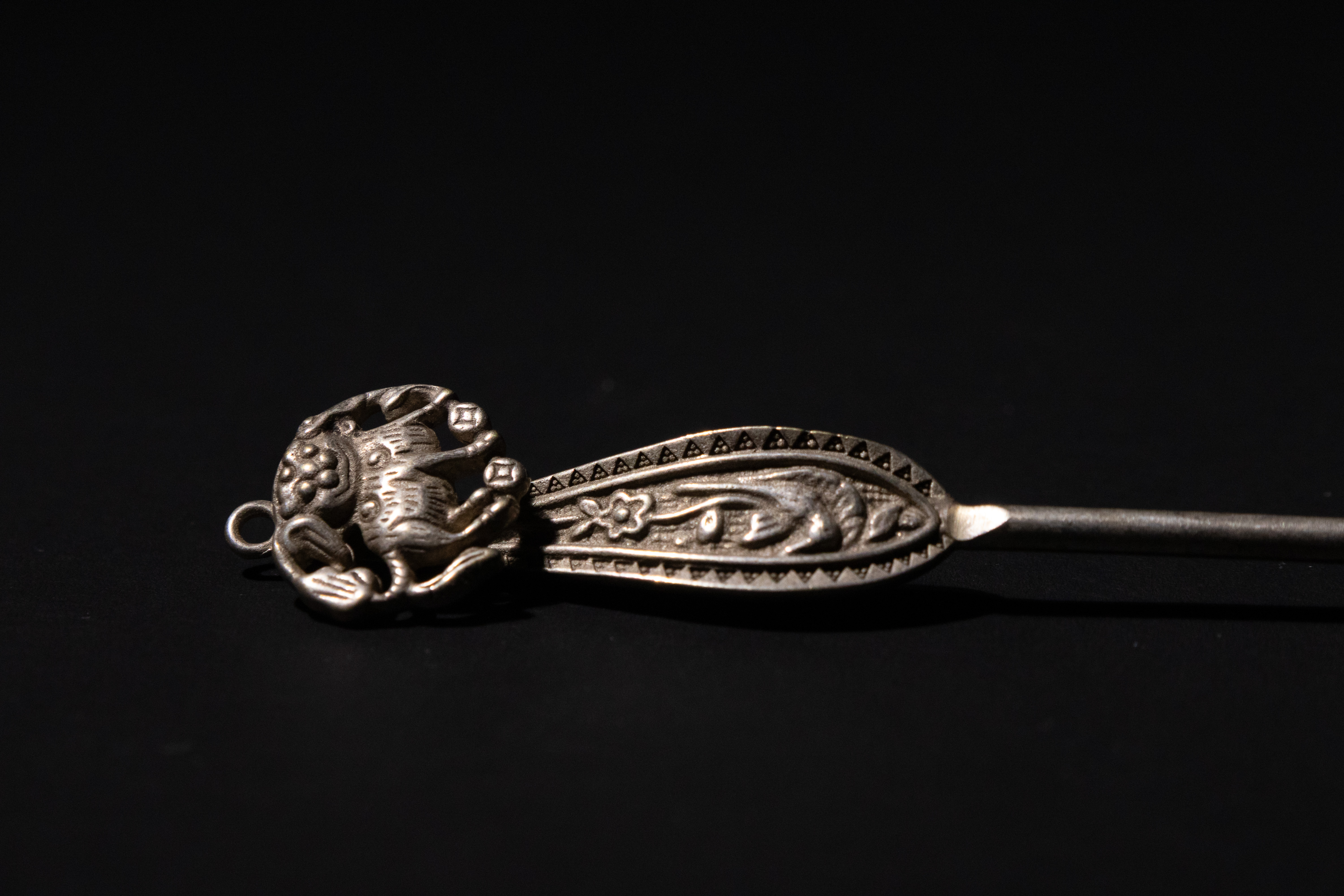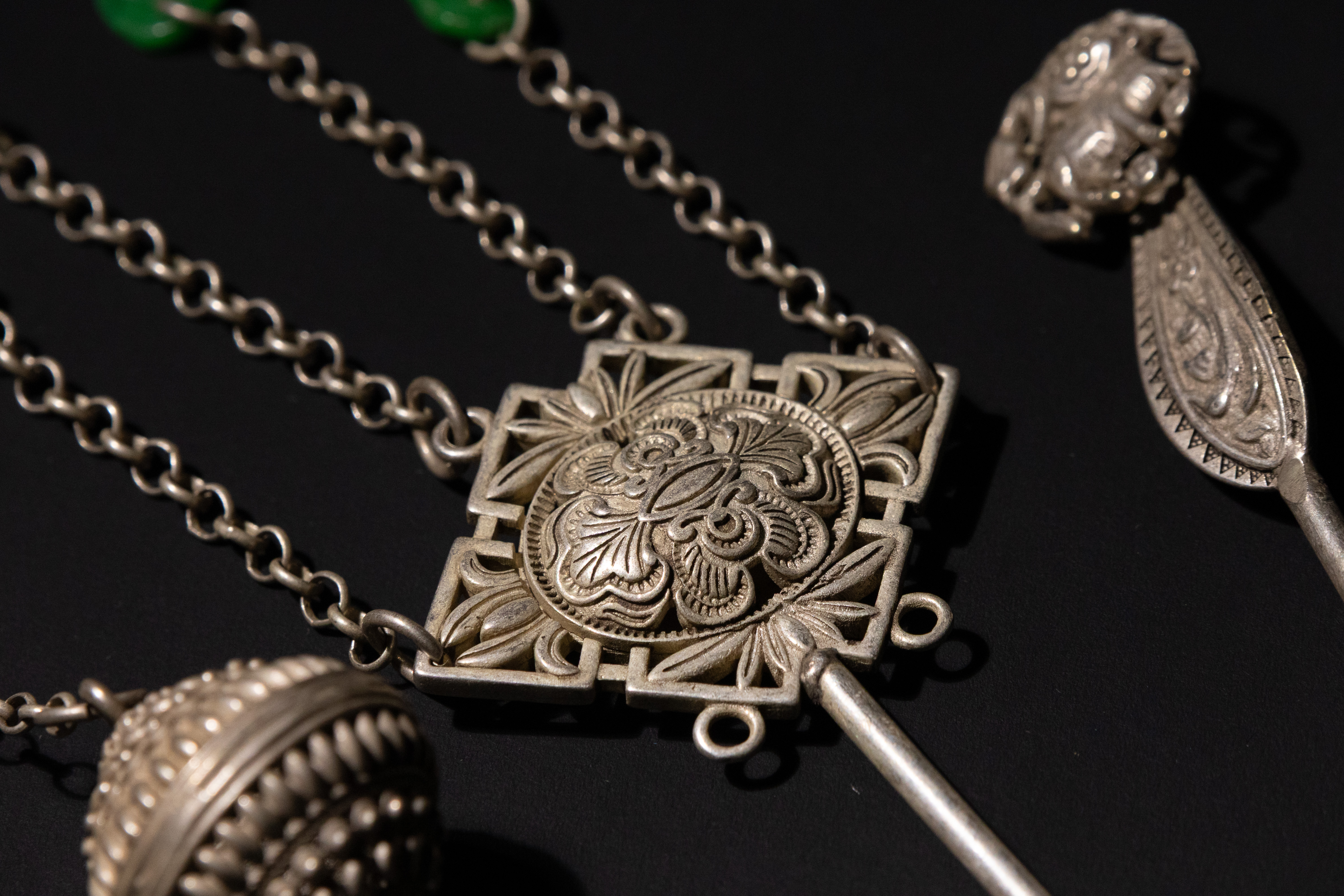A lot of three antique Chinese white metal hairpins. The most elaborate hairpin features a prominent spherical finial with intricate wirework, connected by chains to a central square panel adorned with a repoussé floral motif; four additional chains extend from this panel, each terminating in a carved green jade leaf. A small bell also hangs from the spherical finial. The second hairpin has a paddle-shaped finial extensively engraved with foliate patterns, surmounted by a three-dimensional mythical creature, possibly a foo dog or similar auspicious animal. The third hairpin displays a simpler elongated finial decorated with engraved floral and scroll patterns.
