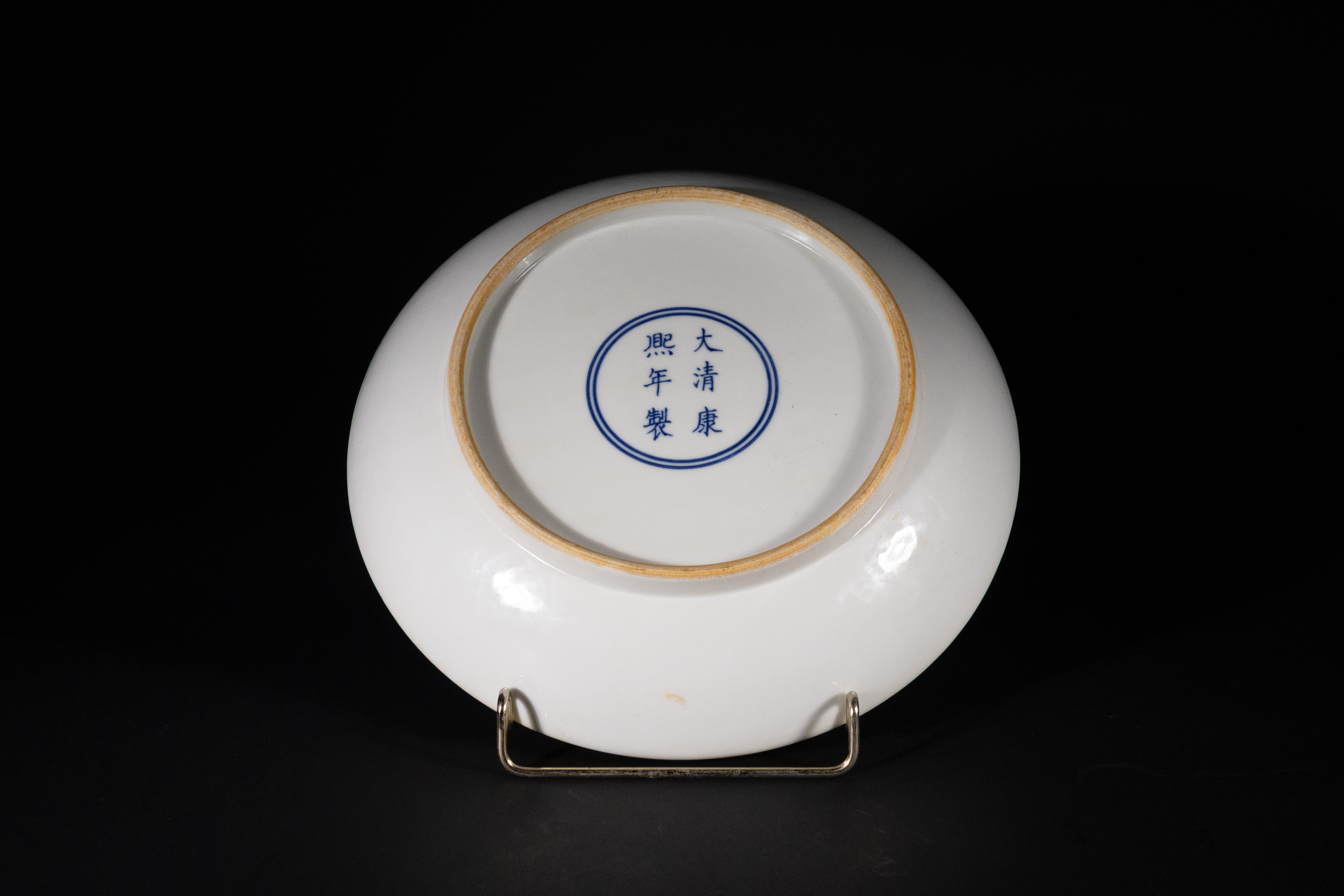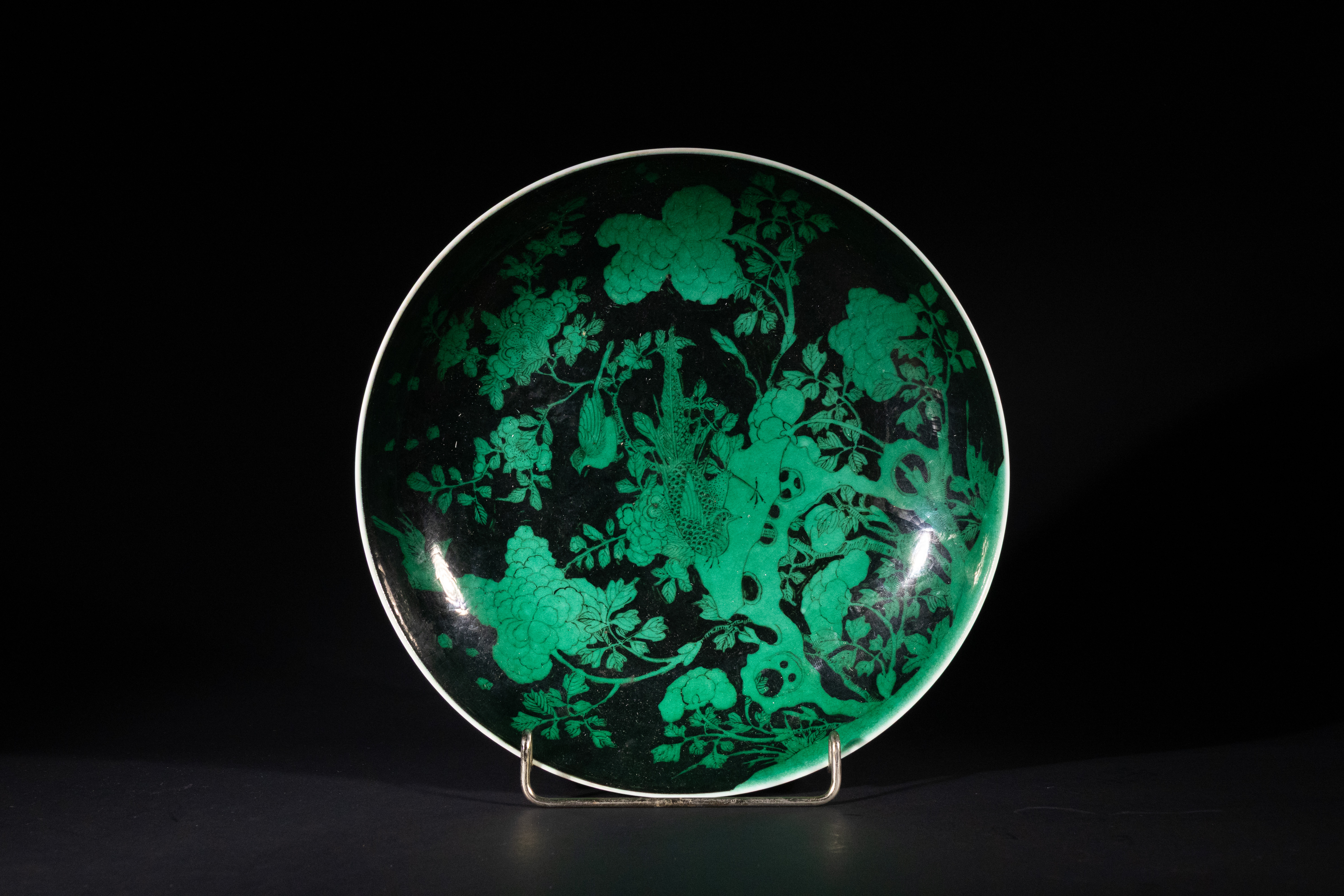 A black-ground green-enamelled dish, bearing a six-character underglaze blue Kangxi reign mark. The circular porcelain dish is decorated on the obverse with vibrant green enamel on a dark (likely black) ground, depicting an intricate design of flowering plants, primarily peonies, and a bird (possibly a phoenix) amidst dense foliage, all within a thin white rim. The reverse features a plain white glazed surface with an unglazed footrim, centering the blue underglaze six-character reign mark which translates to ‘大清康熙年製’ (Made in the Kangxi reign of the Great Qing Dynasty).