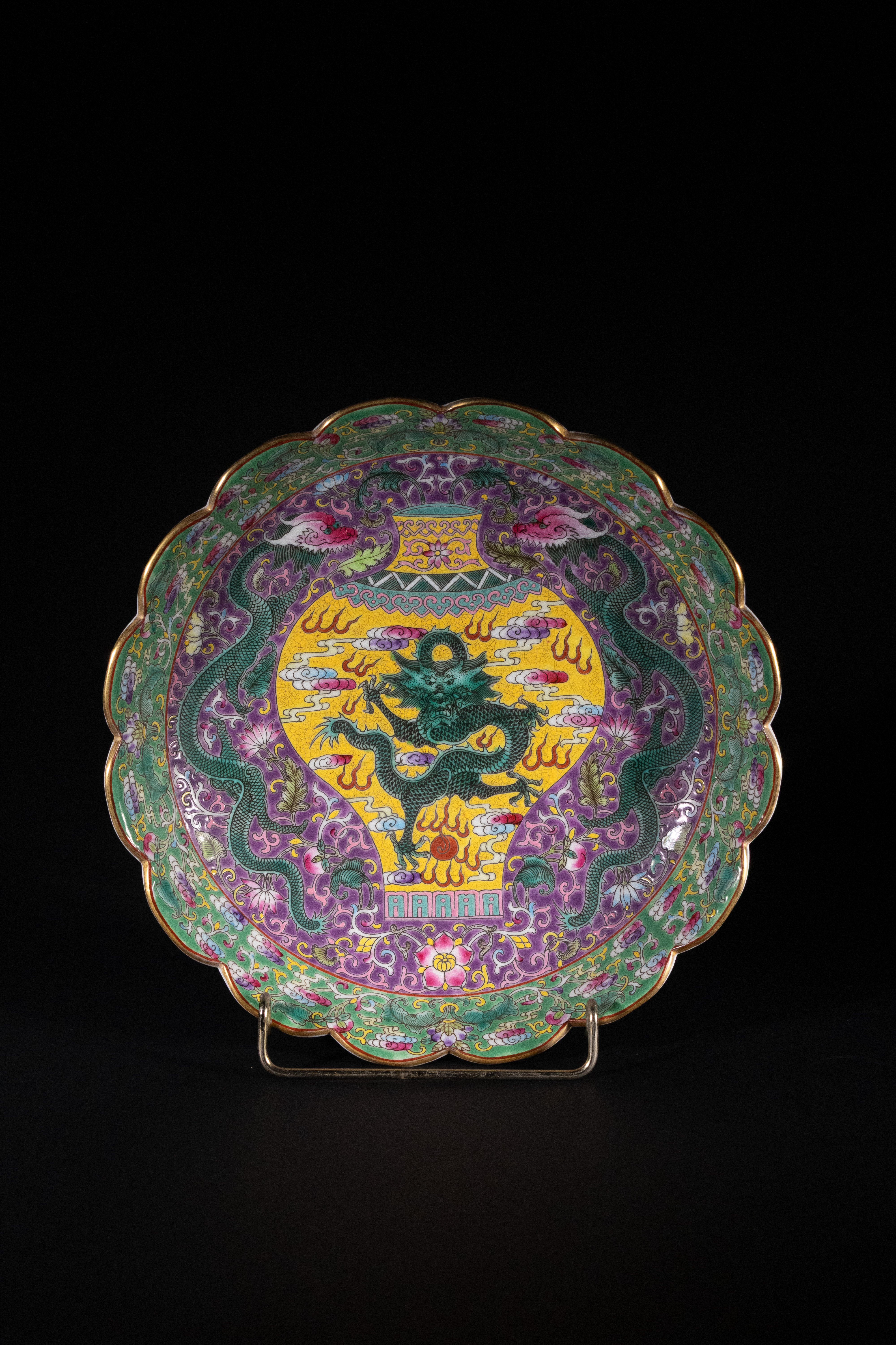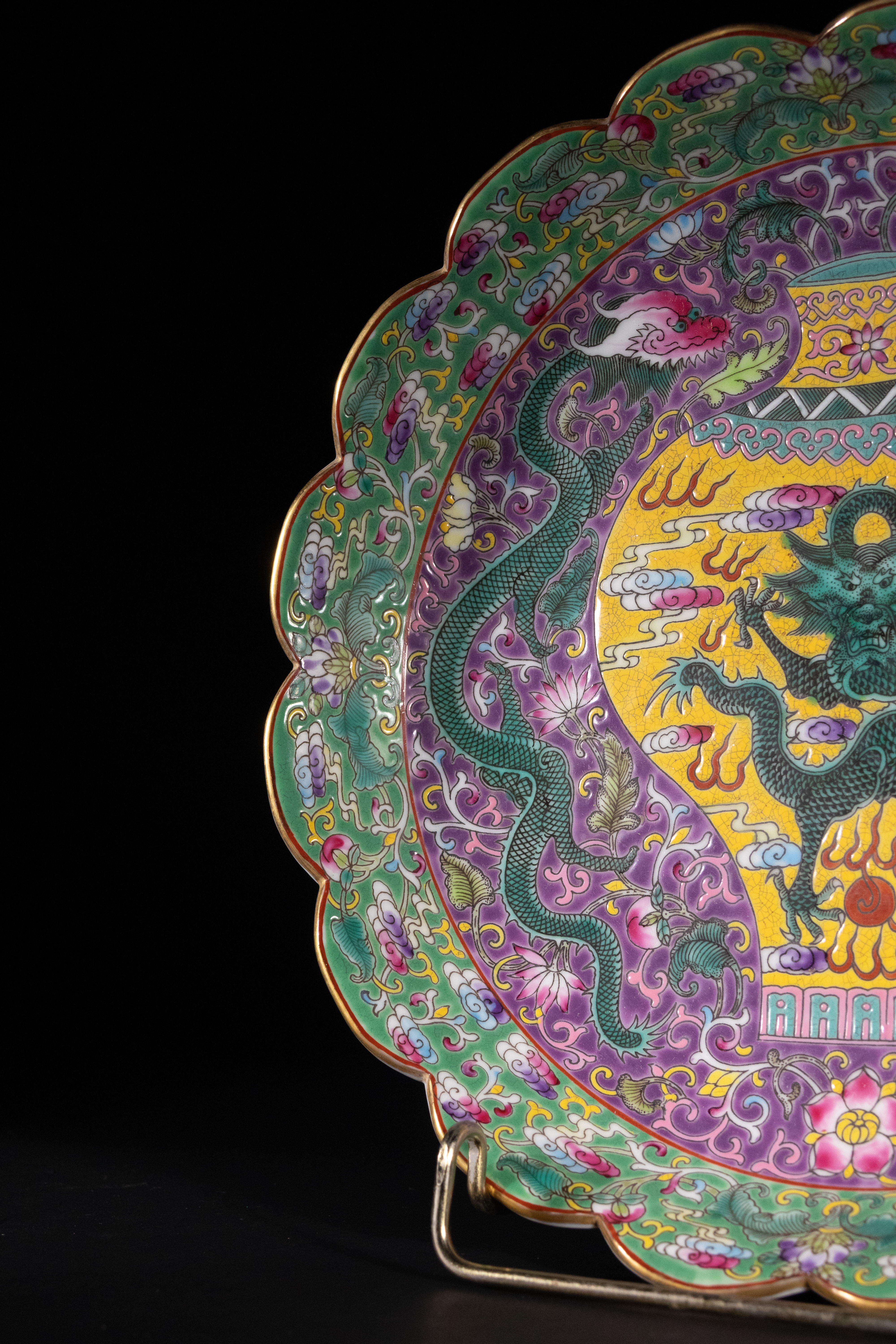 A Chinese yellow ground dragon dish, crafted from elaborately enameled porcelain with a scalloped, gilded rim. The central decoration features a prominent five-clawed green dragon amidst stylized clouds and flames within a bright yellow ground. This central motif is framed by a rich purple band adorned with intricate scrolling lotus and other floral patterns, further encircled by a green band with two additional green dragons coiling amidst similar foliate designs. The extensive polychrome enamel decoration employs a vivid palette including greens, purples, yellows, pinks, and blues, typically outlined in black.
