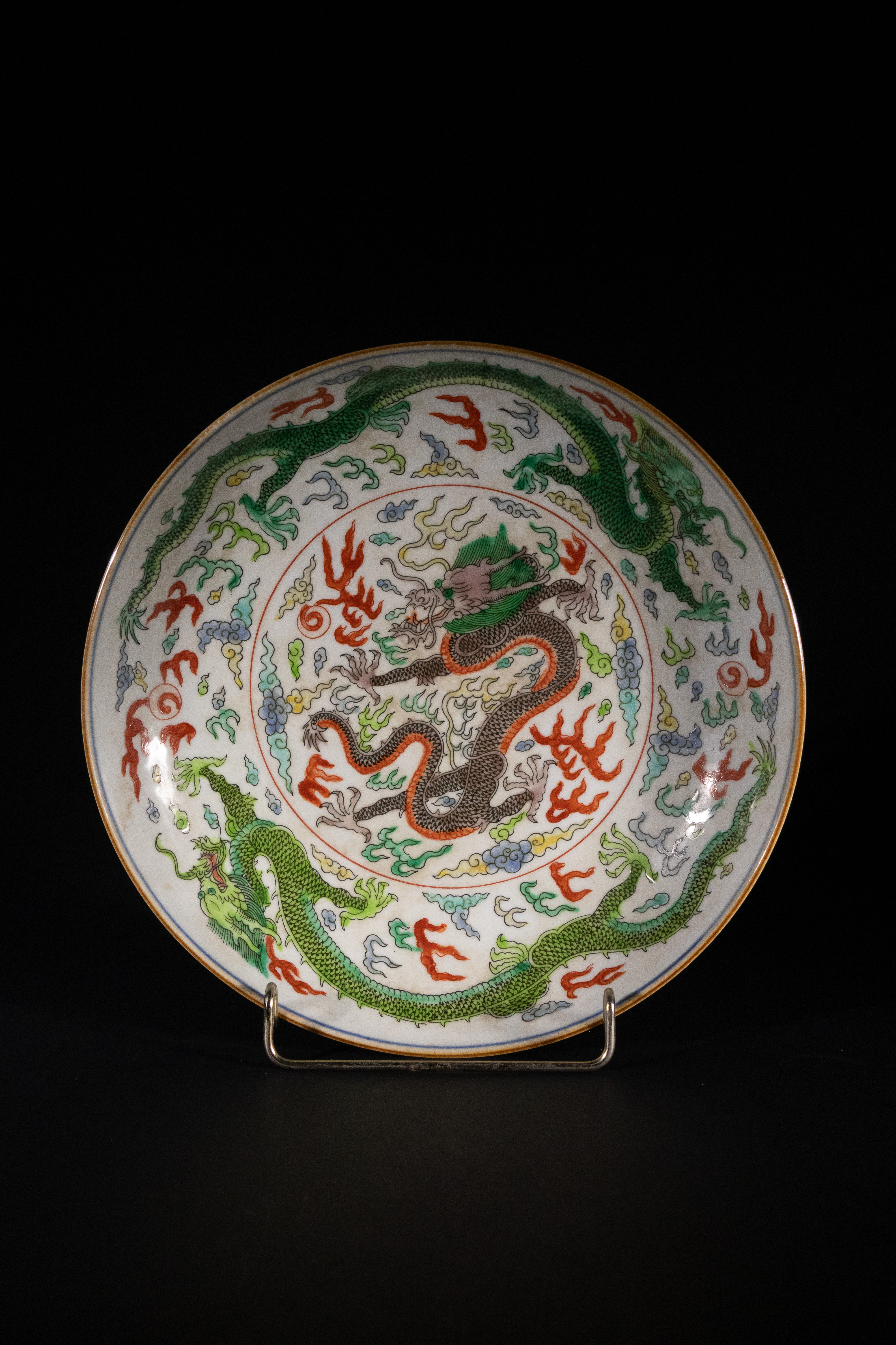 Lot 143: A Chinese Polychrome Enamel 'Dragon and Bat' Porcelain Dish, Yongzheng Mark