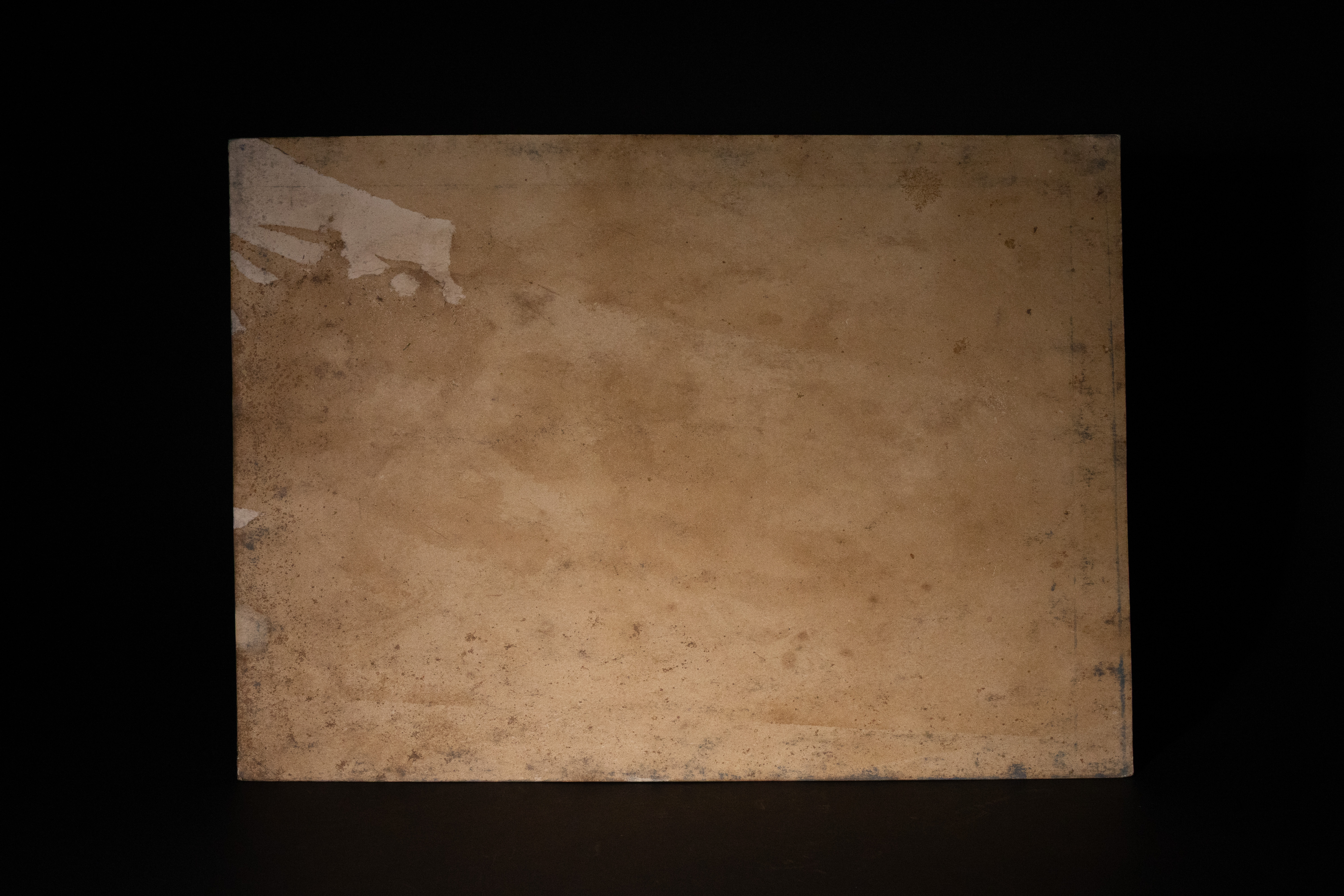 The artwork shows signs of age, including overall paper toning and minor surface wear. The reverse is heavily discolored, stained, and shows evidence of possible adhesive damage.