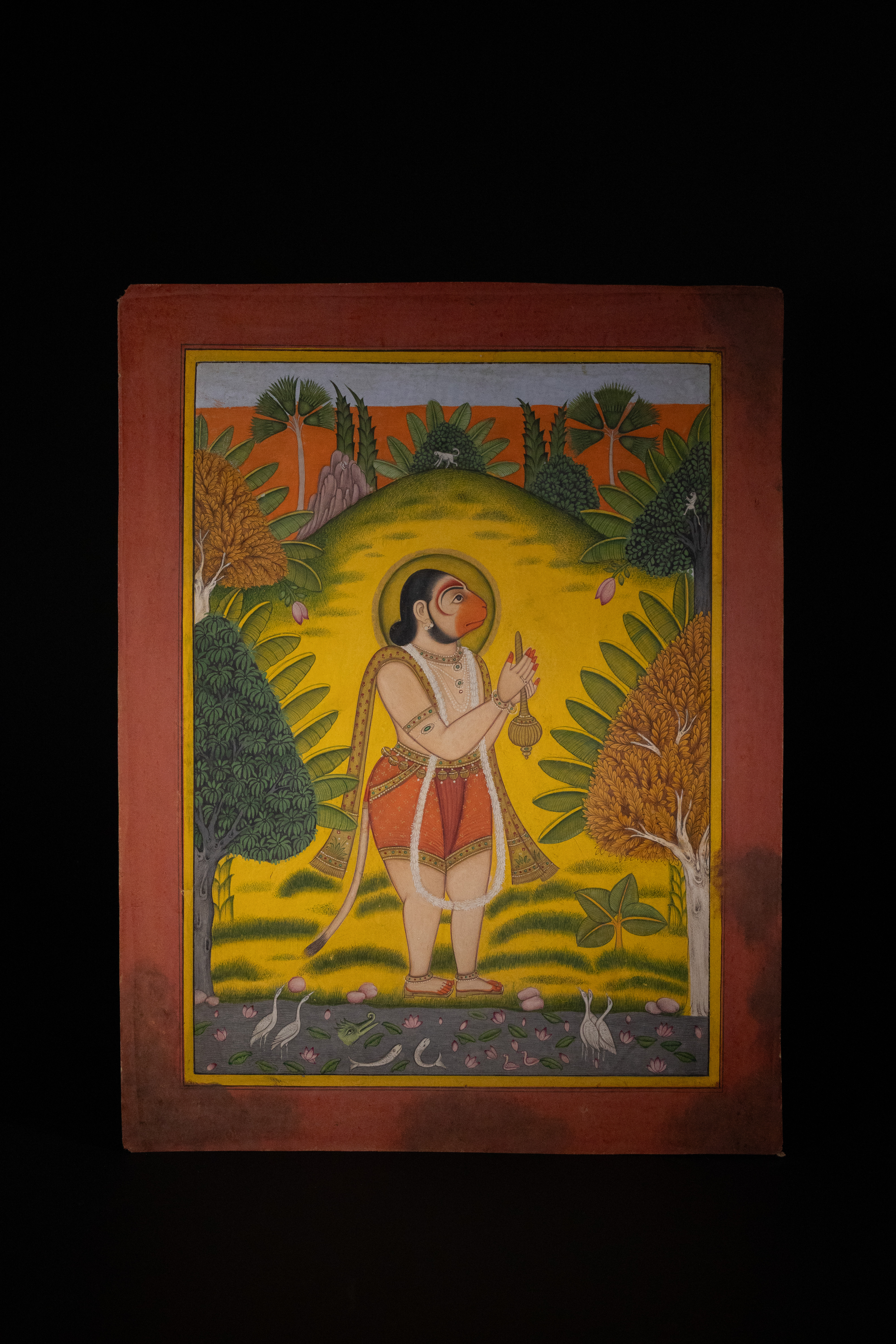 An Indian miniature painting executed in opaque pigments on paper, depicting the Hindu deity Hanuman. The central figure is shown with a reddish-orange monkey-like face and a human body, adorned with traditional jewelry. Hanuman holds a mace in one hand and another unidentified object in the other, set within a radiant yellow aura. The figure is positioned amidst a stylized, vibrant landscape featuring various trees, rolling green hills, and a grey foreground panel illustrating aquatic life and birds. The artwork is framed by a thin yellow inner border and a wider, plain reddish-brown outer margin.