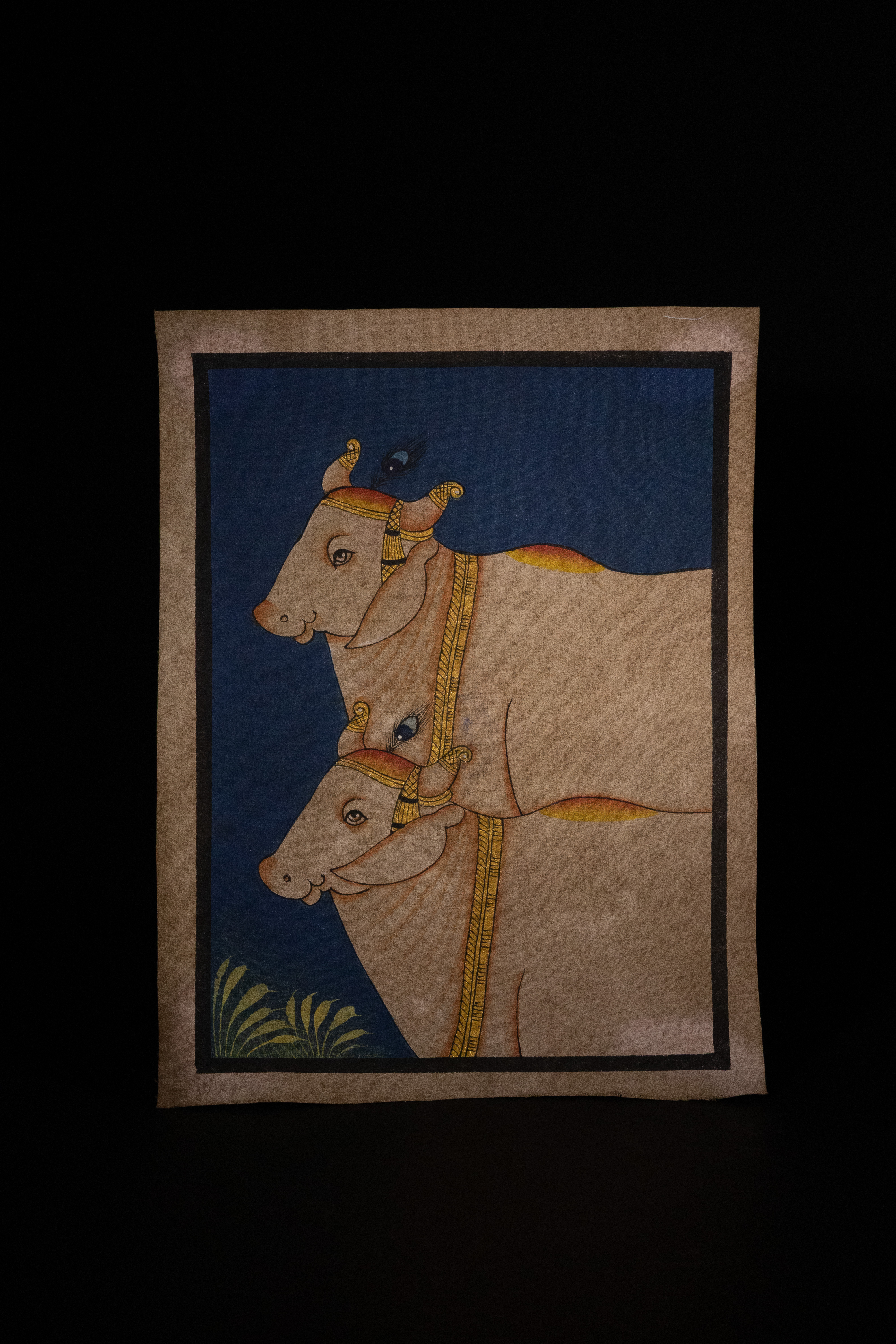 An Indian Pichwai painting executed in a traditional style, featuring two stylized white cattle adorned with gold-colored ornamentation. The upper animal is depicted with a peacock feather. The scene is set against a deep blue ground with a hint of green foliage. The artwork is rendered with pigment and includes an integral dark inner border.