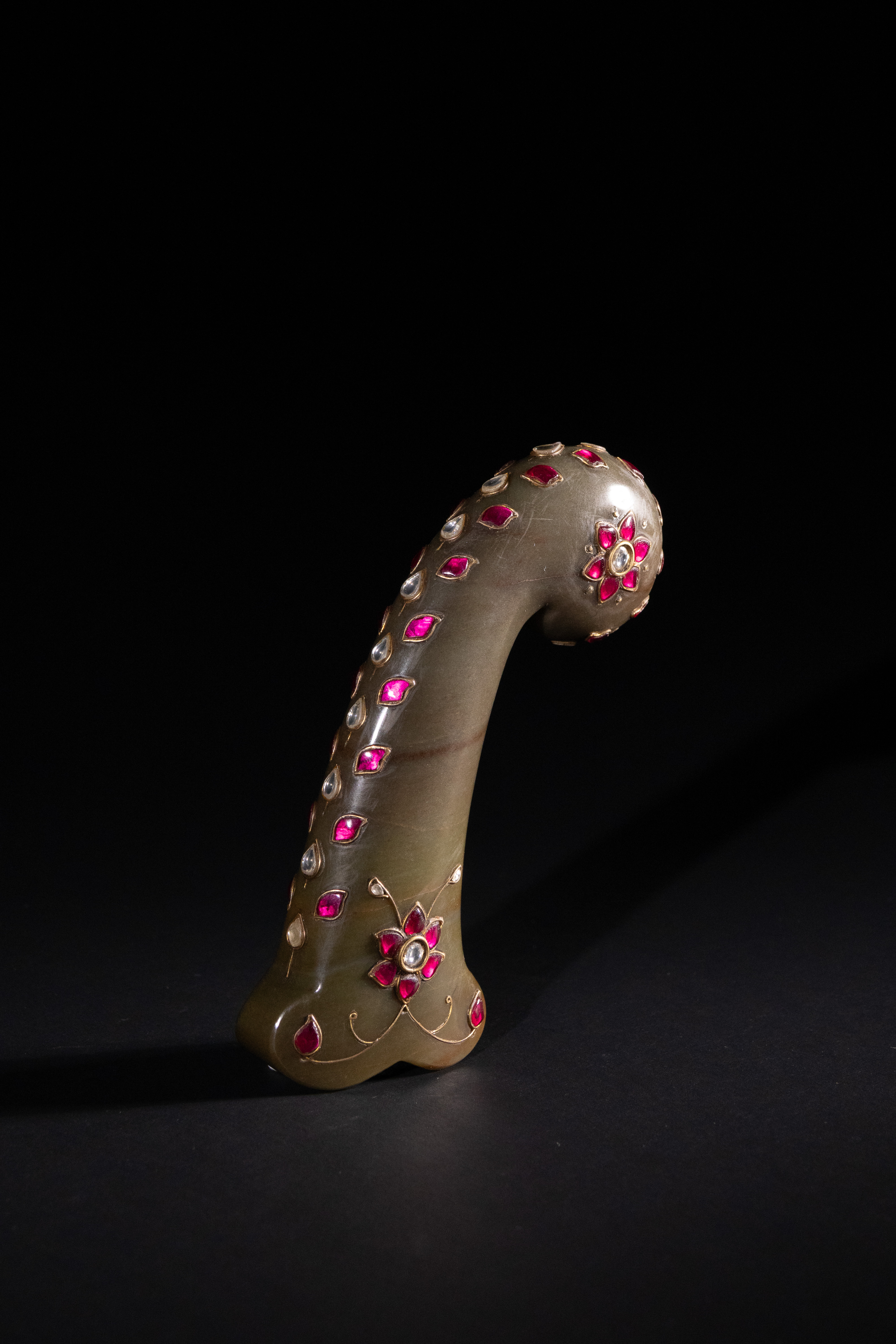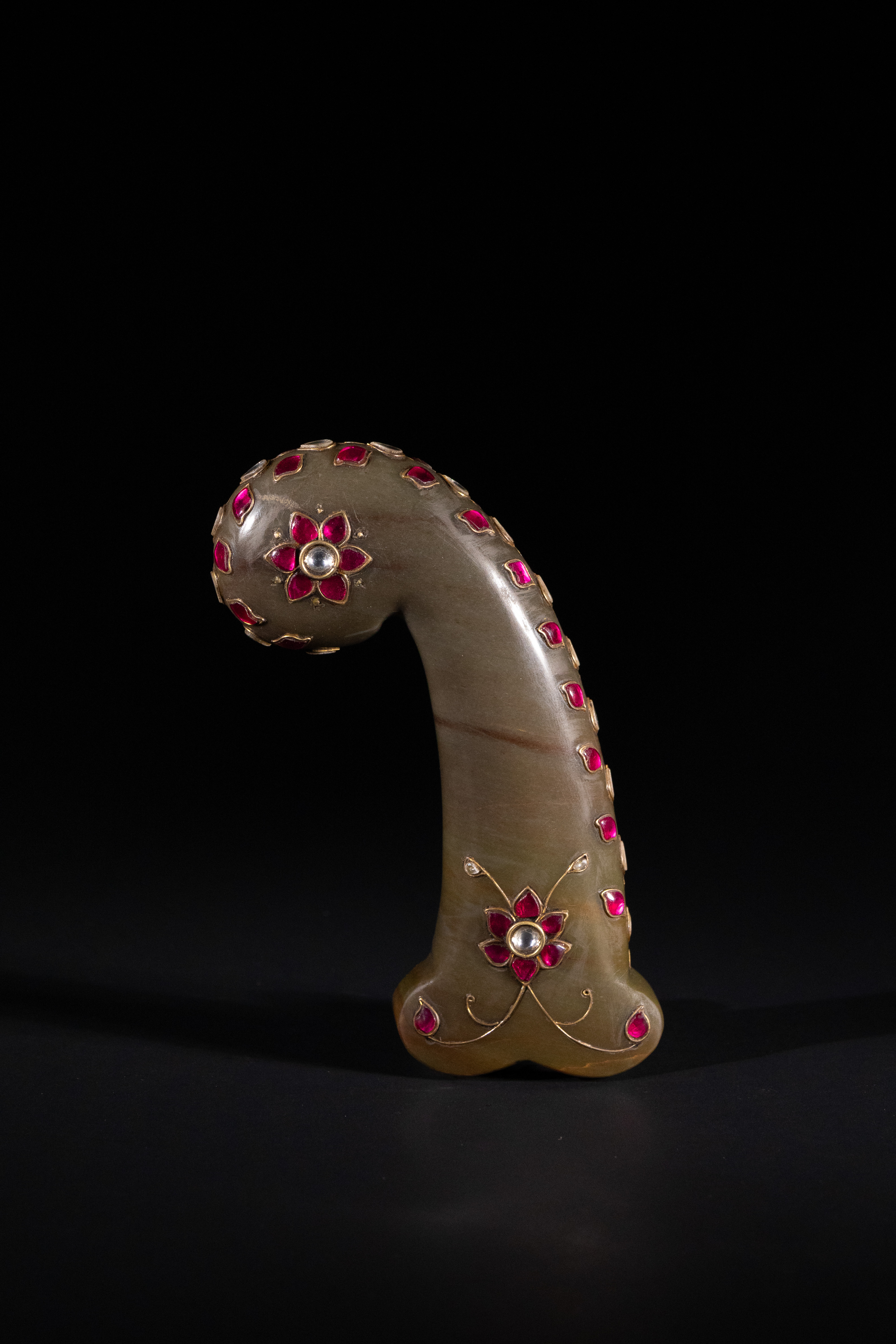 Lot 161: A Mughal Indian Gilt and Glass-Set Jade Dagger Hilt, 18th/19th Century