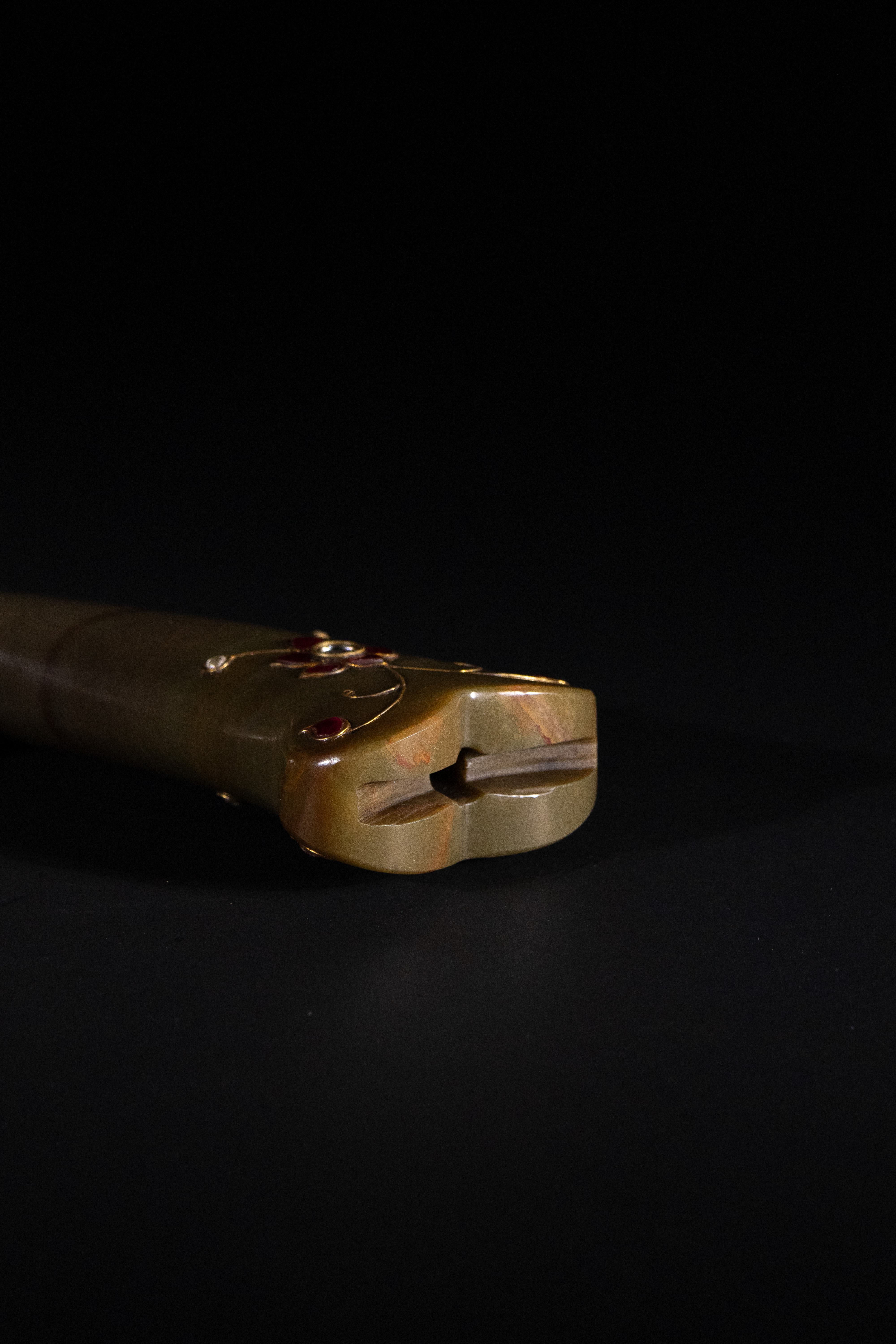 A Mughal Indian gilt and glass-set jade dagger hilt, dating to the 18th or 19th Century. Carved from a mottled olive-green/brown jade. The hilt features extensive inlay work comprising numerous small, faceted red glass, and a few clear/white faceted cabochons all set in gilt bezels. These inlays are arranged in floral motifs and line the grip’s spine. Delicate scrolling patterns rendered in fine wire inlay are also present. The distal end of the handle features a narrow, rectangular slot for blade insertion.