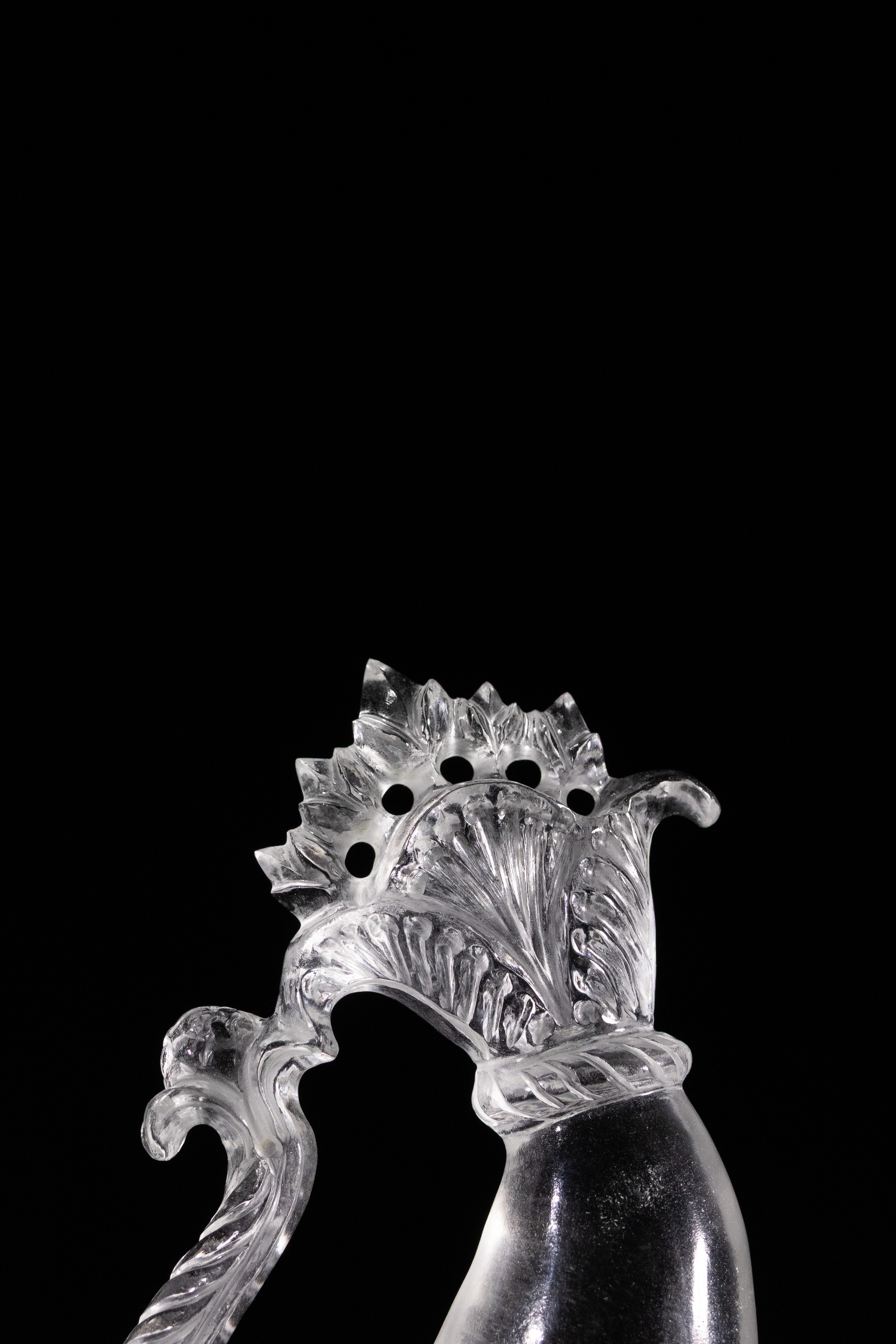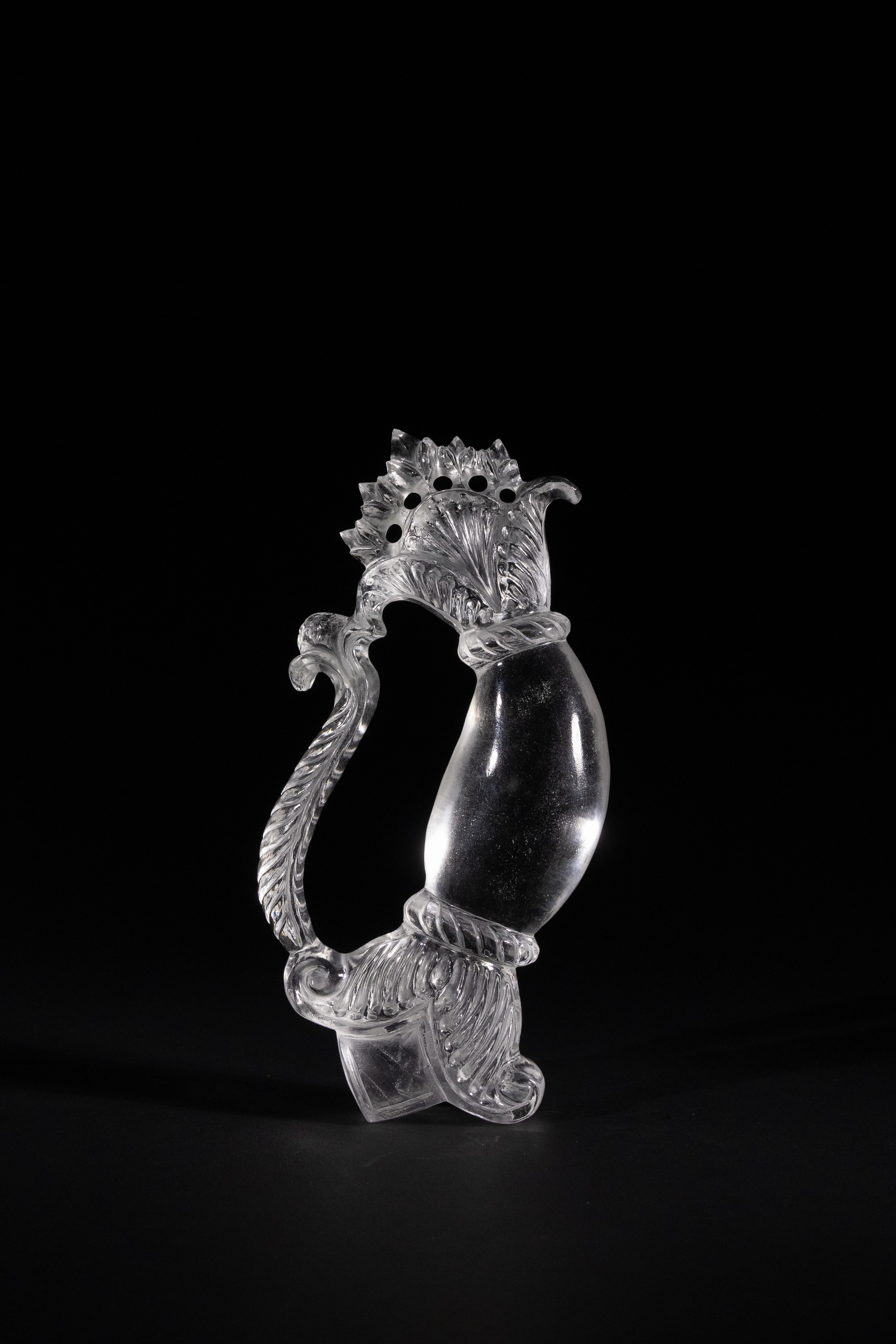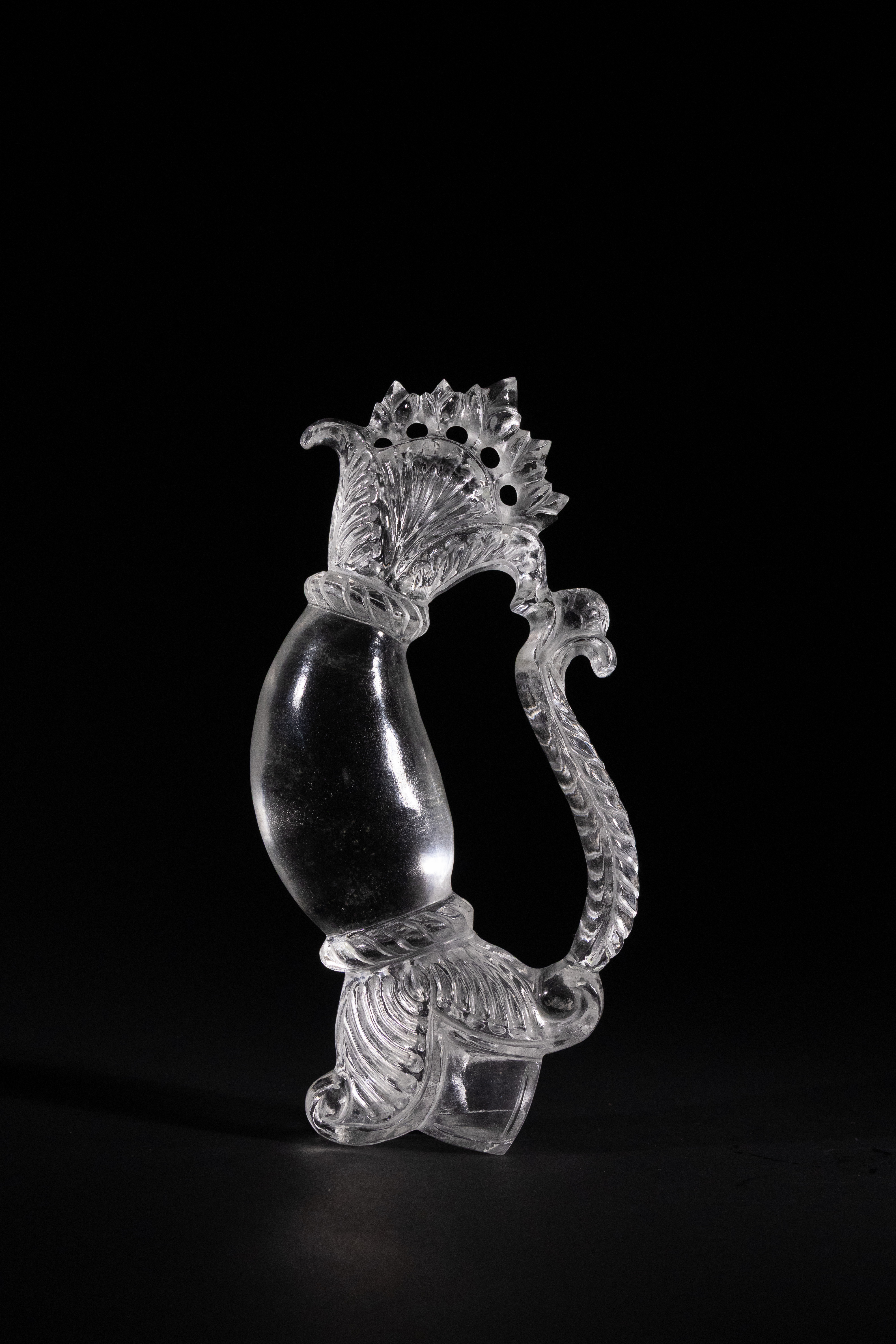 A 19th Century Indian Mughal rock crystal dagger hilt. Crafted from a clear, colorless material, the hilt features a central smooth ovoid body flanked by deeply carved foliate scrollwork and acanthus motifs, evoking a Baroque or Rococo aesthetic. An ornate, scrolling C-shaped element, also intricately carved, connects the upper and lower sections, with the apex displaying a multi-perforated, crown-like embellishment. No visible text or markings are apparent.