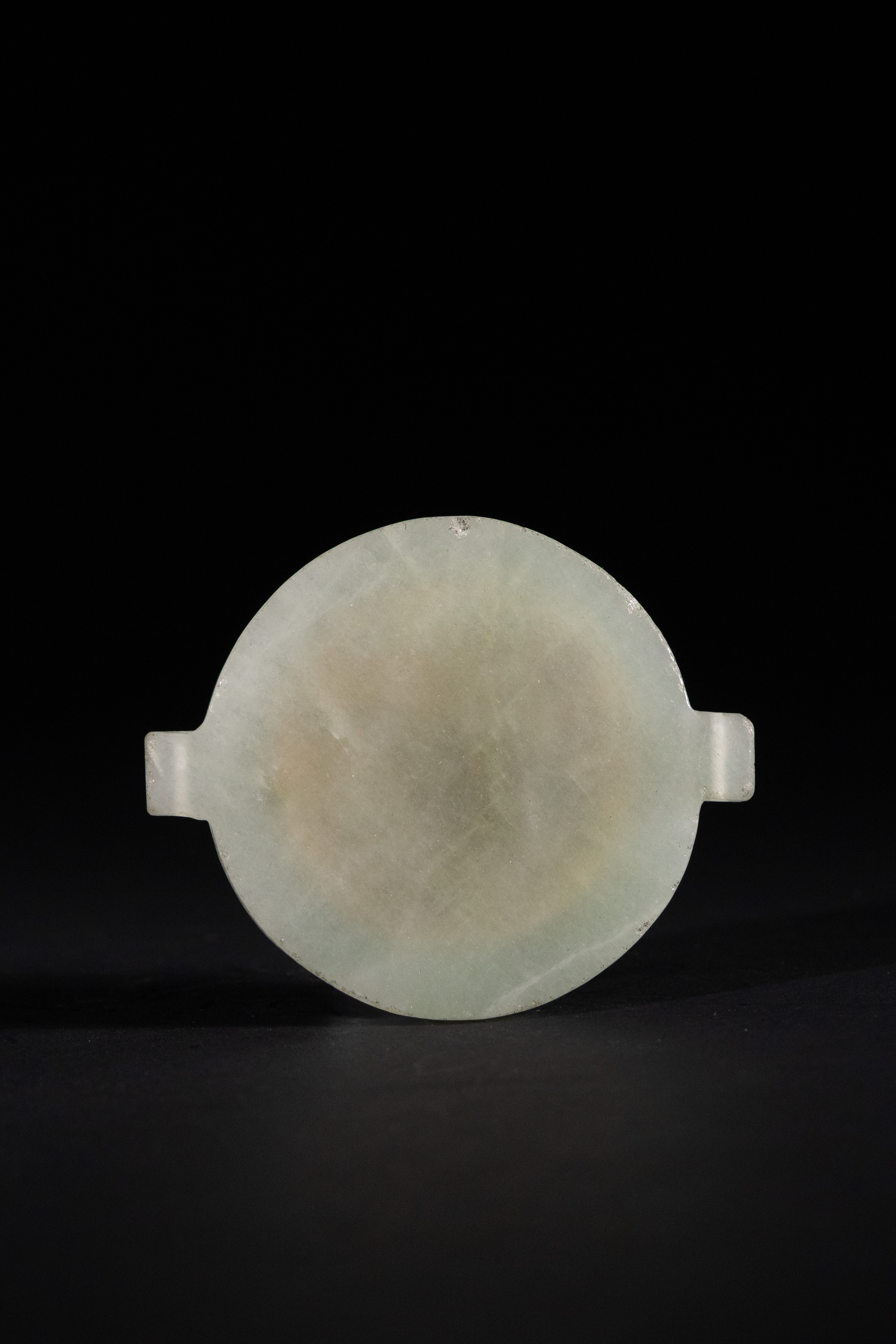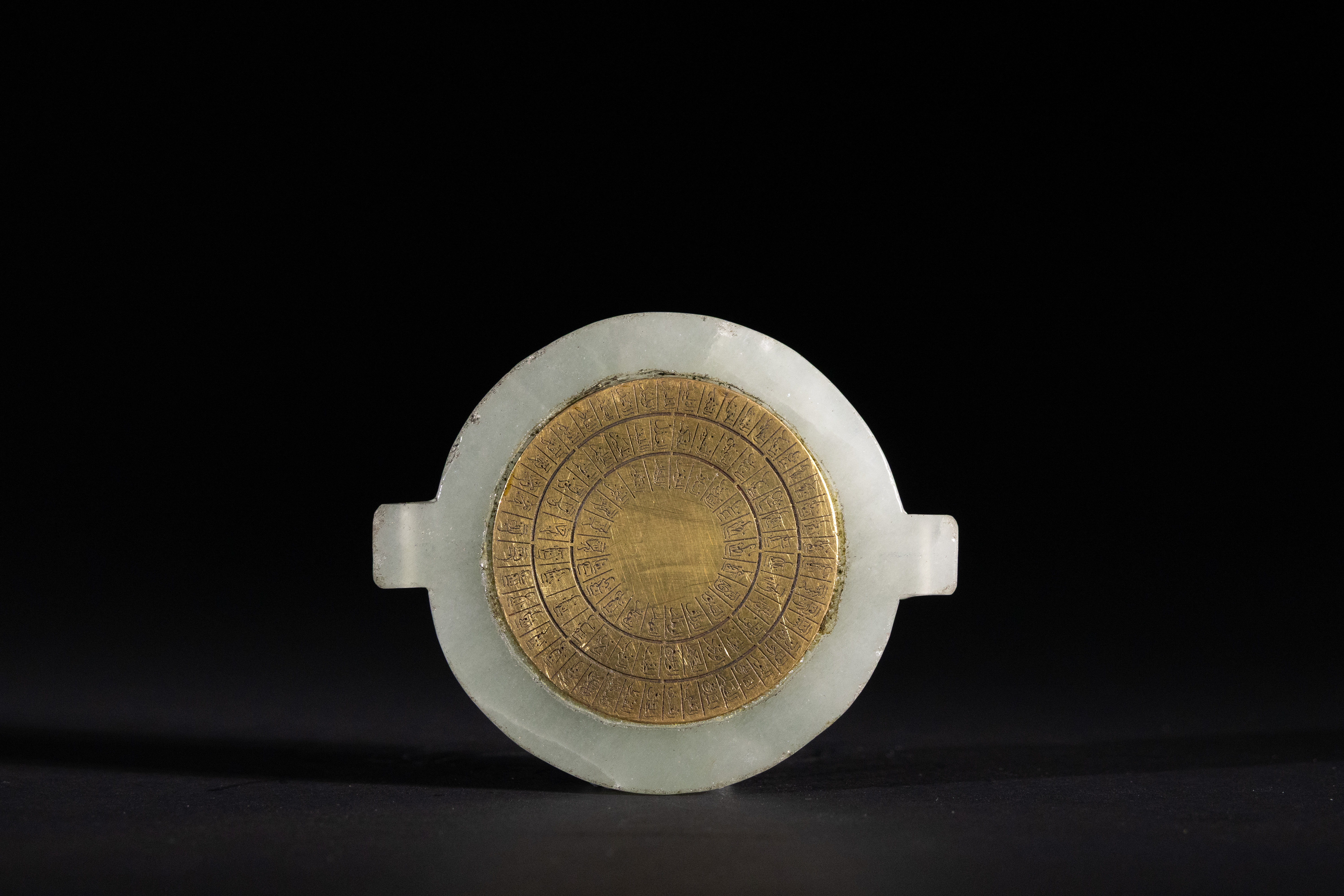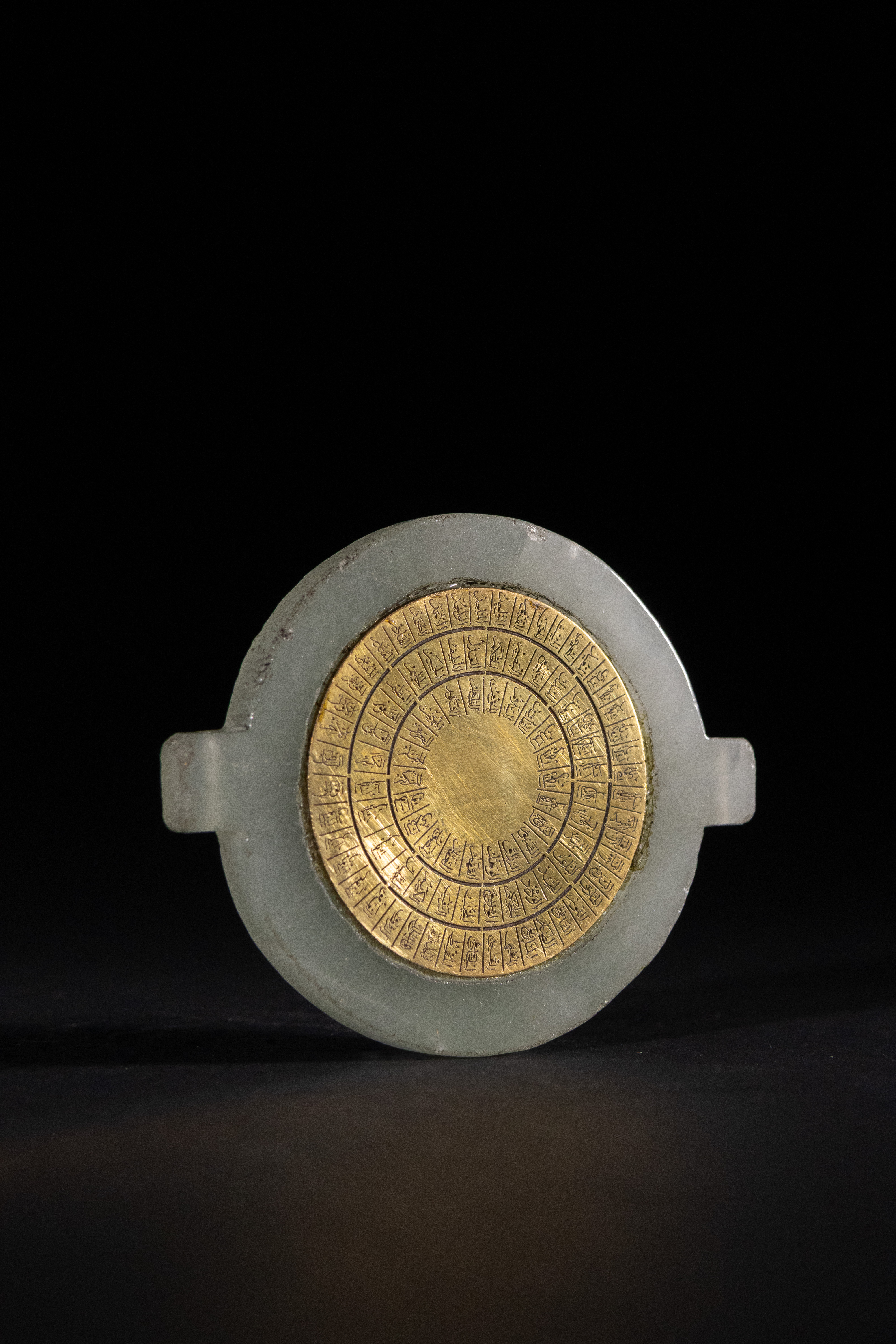 An Indo-Persian talismanic jade and brass bazuband disc. This circular, pale greenish-white jade disc features two short rectangular protrusions on opposite sides of its circumference. One side is prominently inlaid with a central brass metallic disc, which is intricately engraved with multiple concentric rings of small Islamic calligraphy, suggestive of a calendrical or divinatory function.