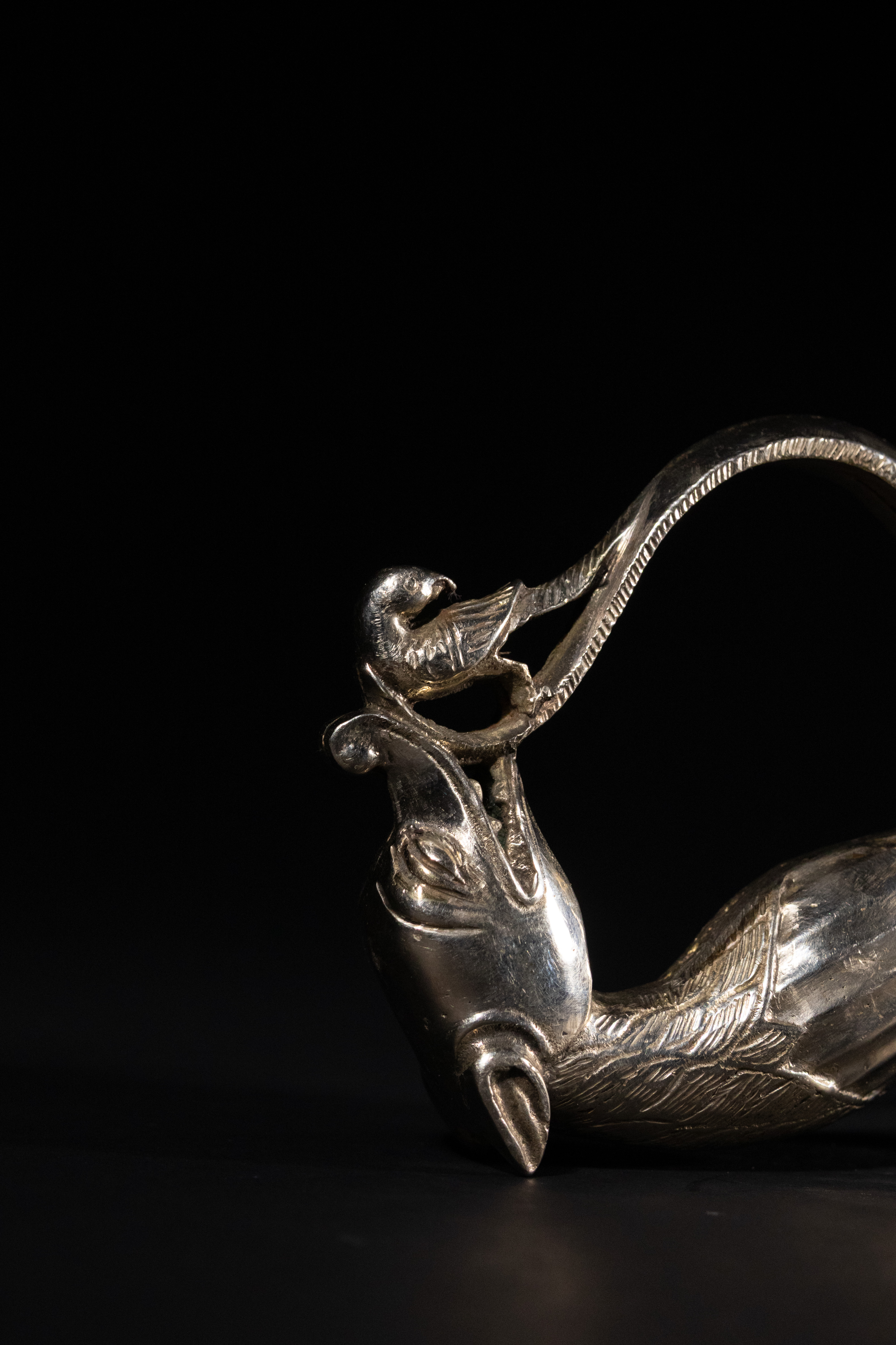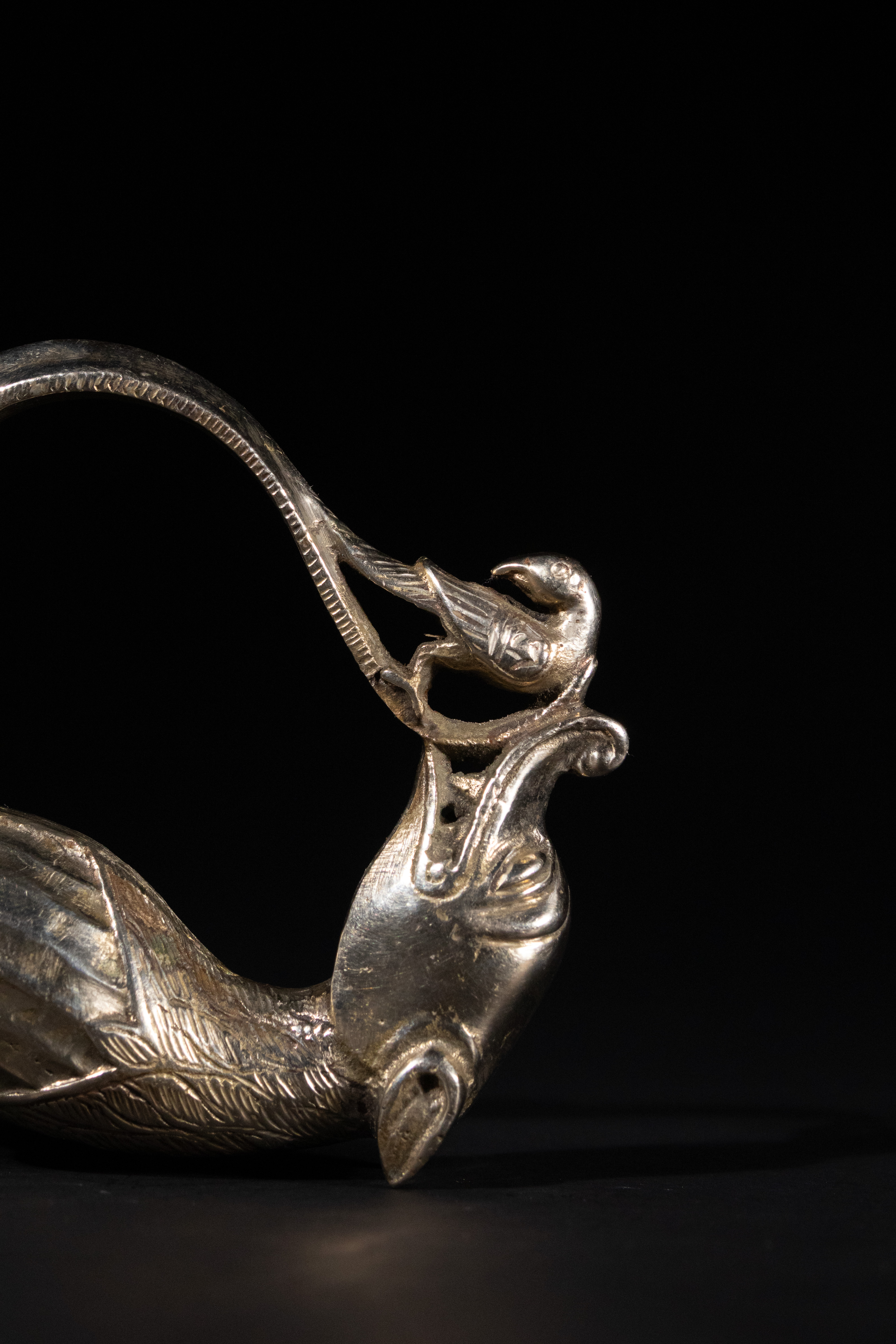 An Indian Mughal iron sword hilt. This ornate piece features a distinct D-guard configuration. The main guard is formed by a large, stylized bird or mythical creature detailed with feathering, its head serving as the lower terminal. A smaller bird is perched on its back, completing the curved guard. The pommel end is adorned with another intricately detailed animal head, possibly a dragon or bird.