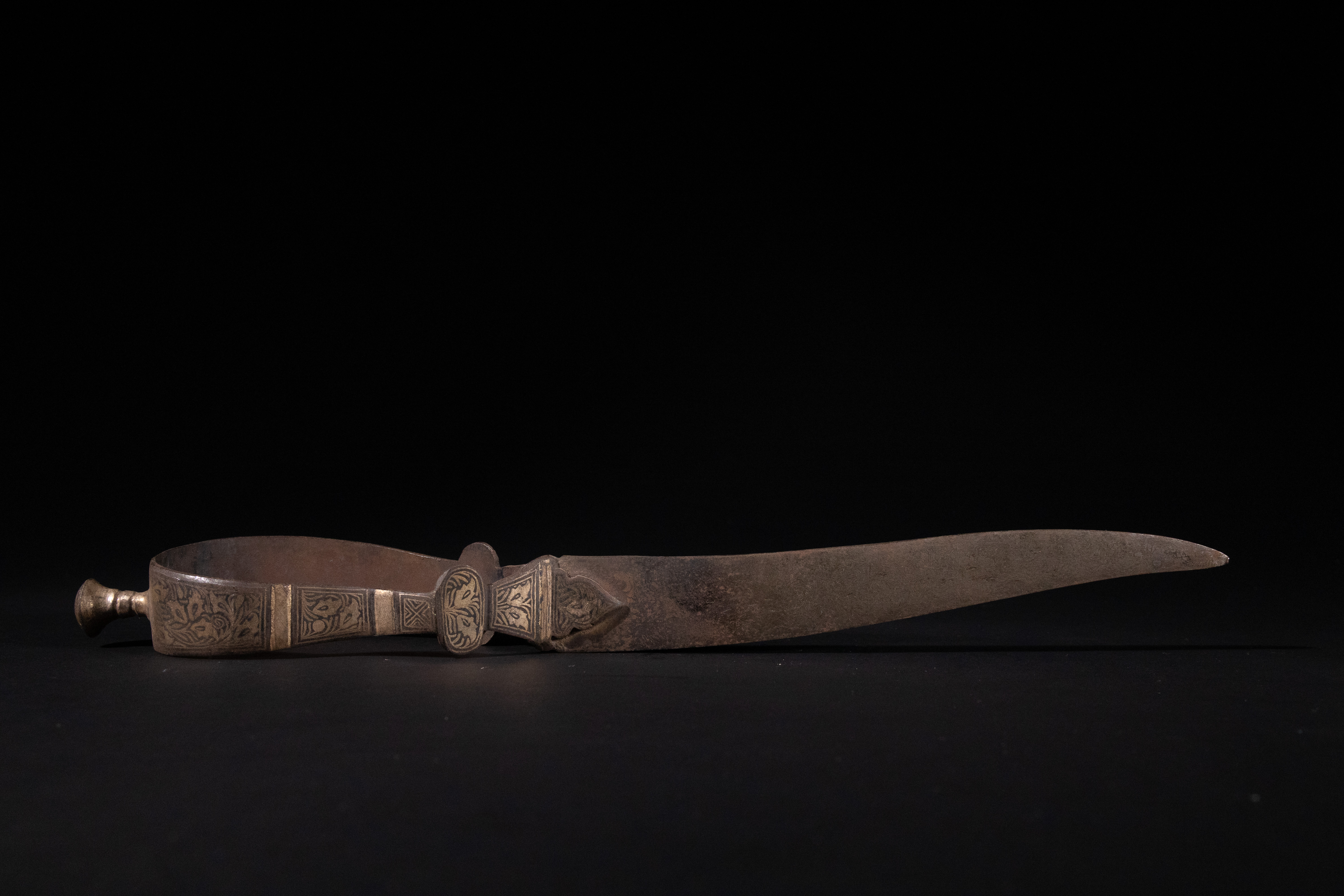 A historical dagger or knife, featuring a single-edged, slightly curved steel blade that exhibits significant patination, pitting, and discoloration. The handle and distinct quatrefoil-shaped guard are constructed from a yellow-toned metal, possibly brass or gilded metal, intricately decorated with fine floral and foliate engravings against a darkened silver nielloed, background. The hilt terminates in a rounded, bulbous metal pommel.