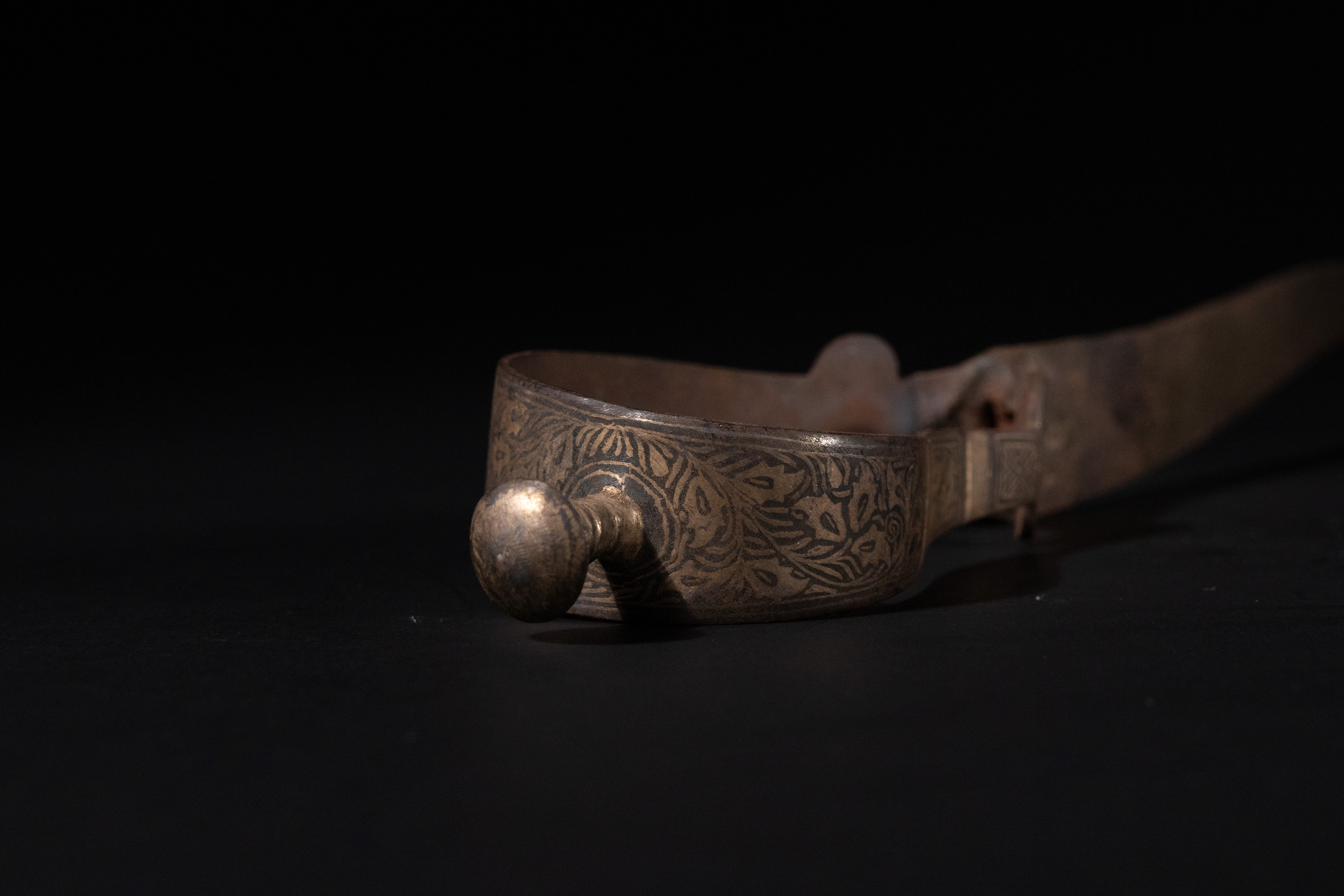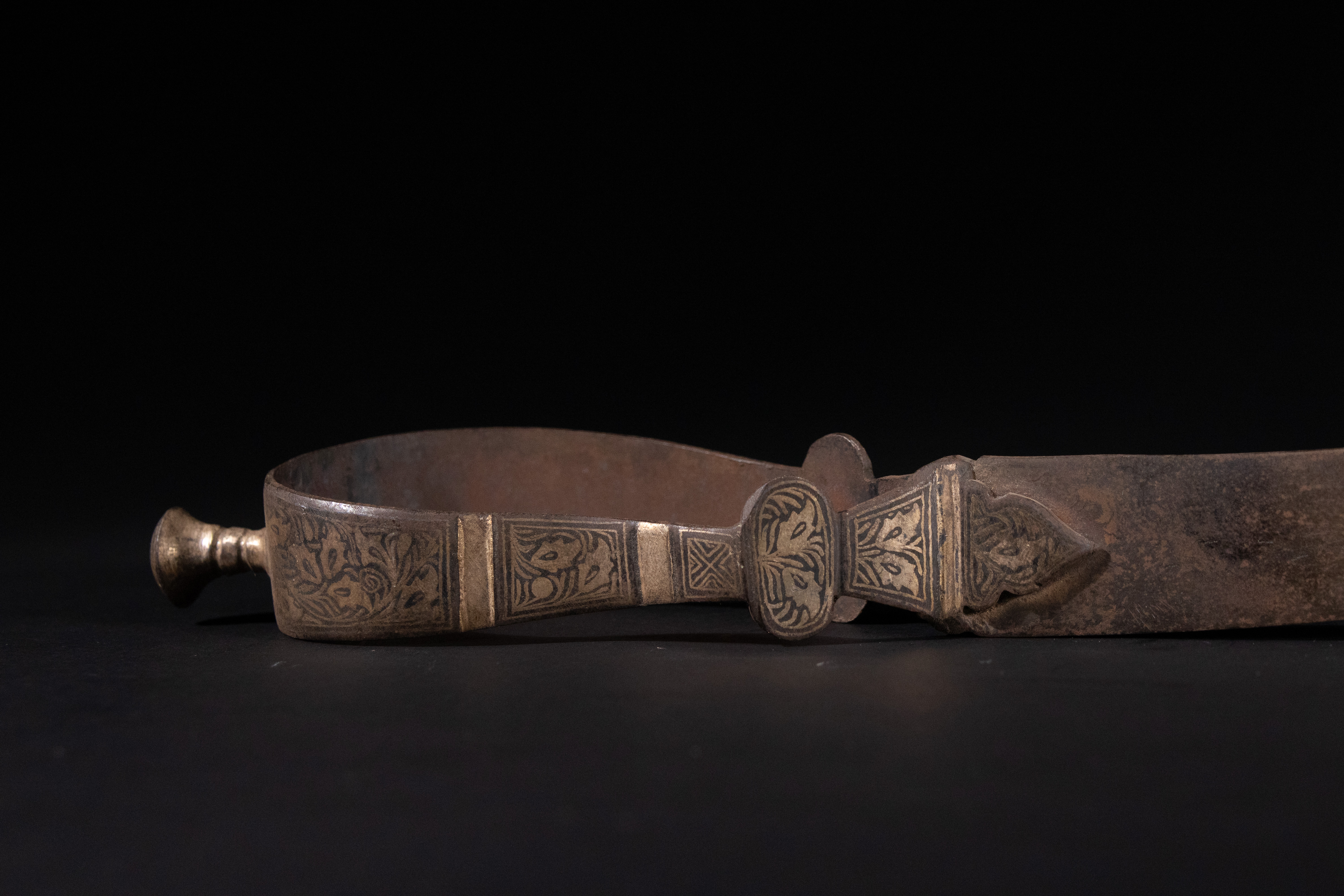 The item shows considerable age and use, with expected wear, tarnishing, and oxidation across all components. The steel blade has significant patination, pitting, and discoloration consistent with its age. The yellow-toned metal hilt exhibits tarnishing and minor surface wear to the decorative engravings. No major losses or repairs are immediately apparent.