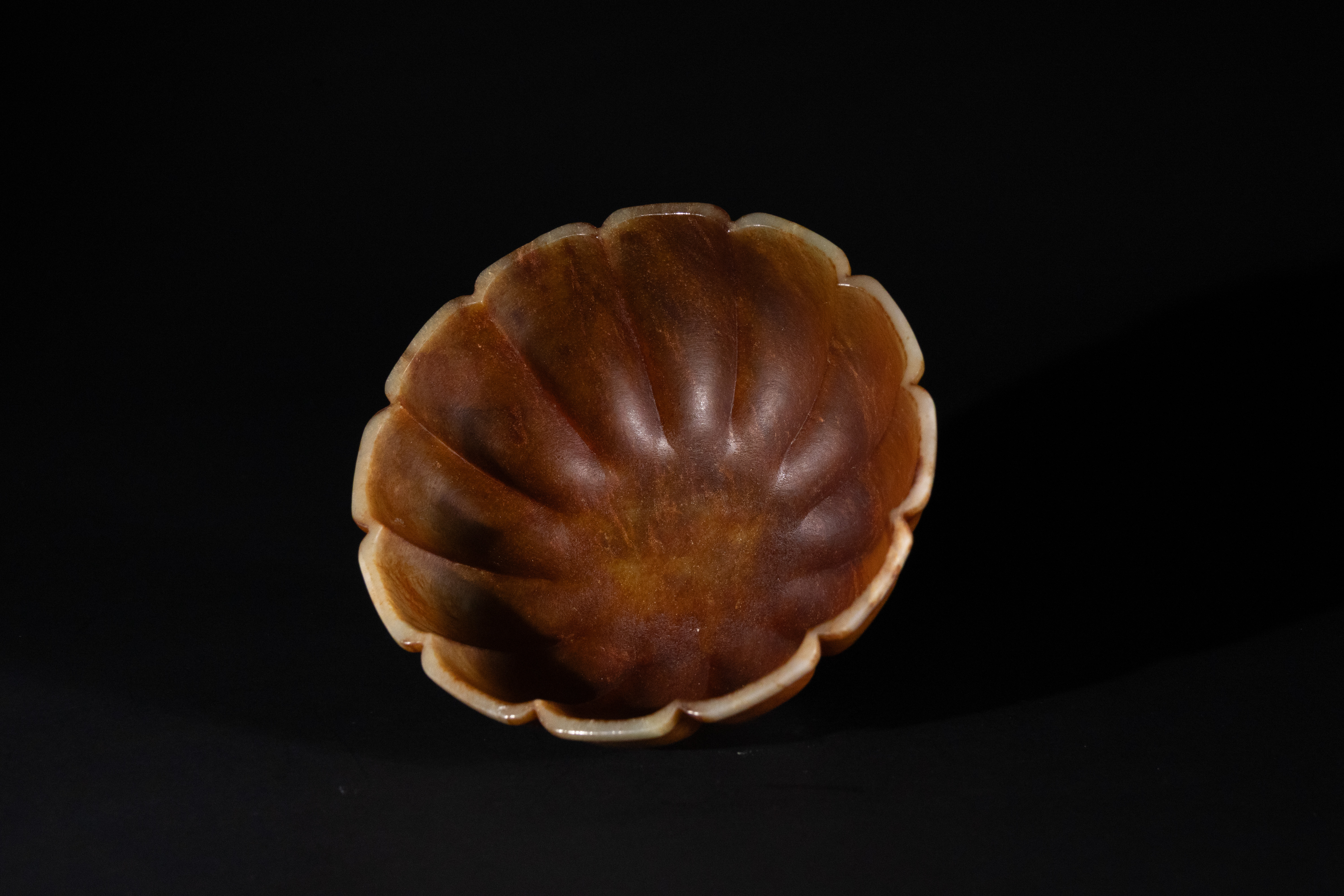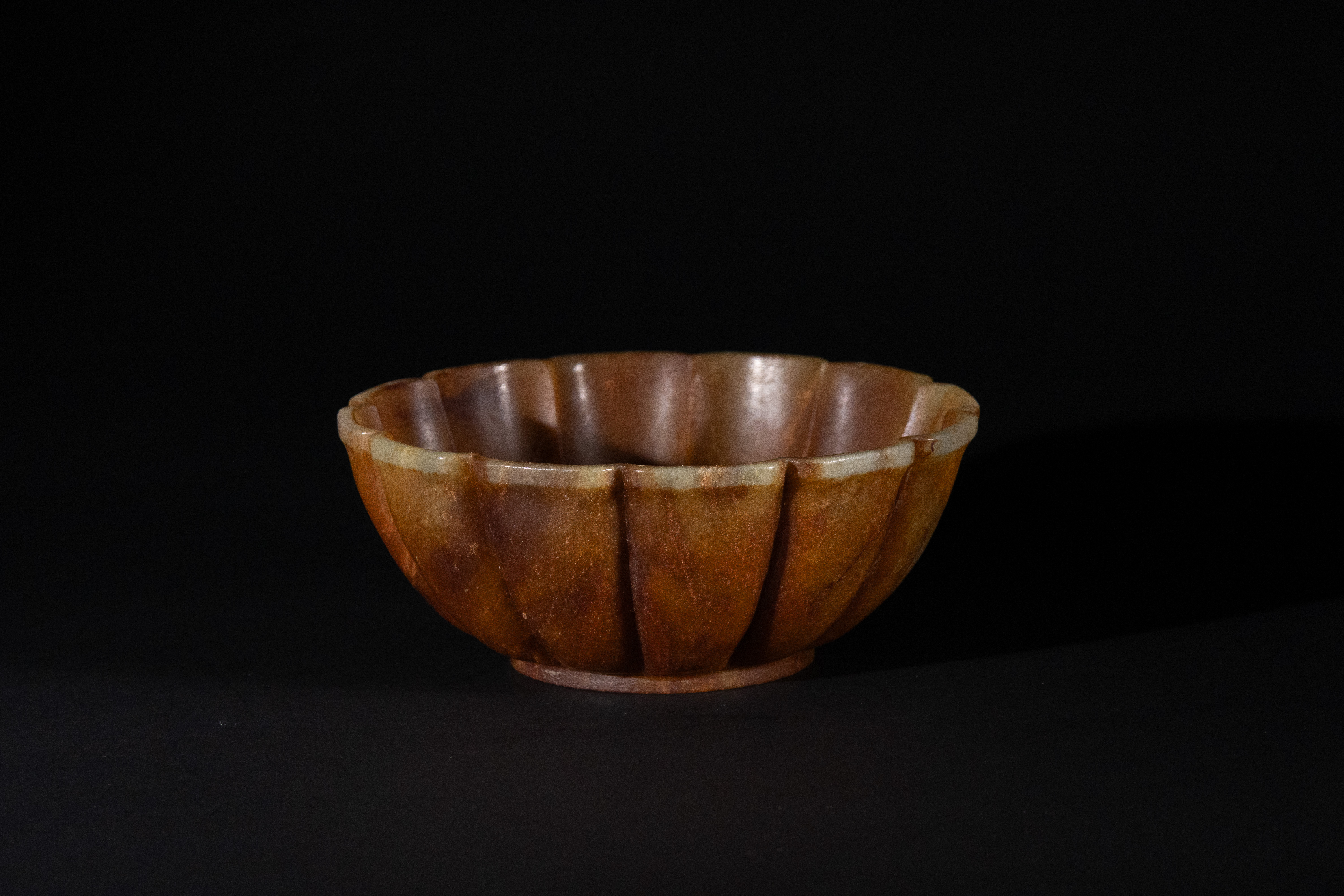 A lobed bowl carved from jade displaying a spectrum of earthy tones including brown, amber, and areas of lighter celadon or grey. The object features a fluted, melon-form body with an undulating, scalloped rim, consistent with a lobed foliate rim form. The surface appears polished, and the item presents with a natural patina and inherent stone variations.