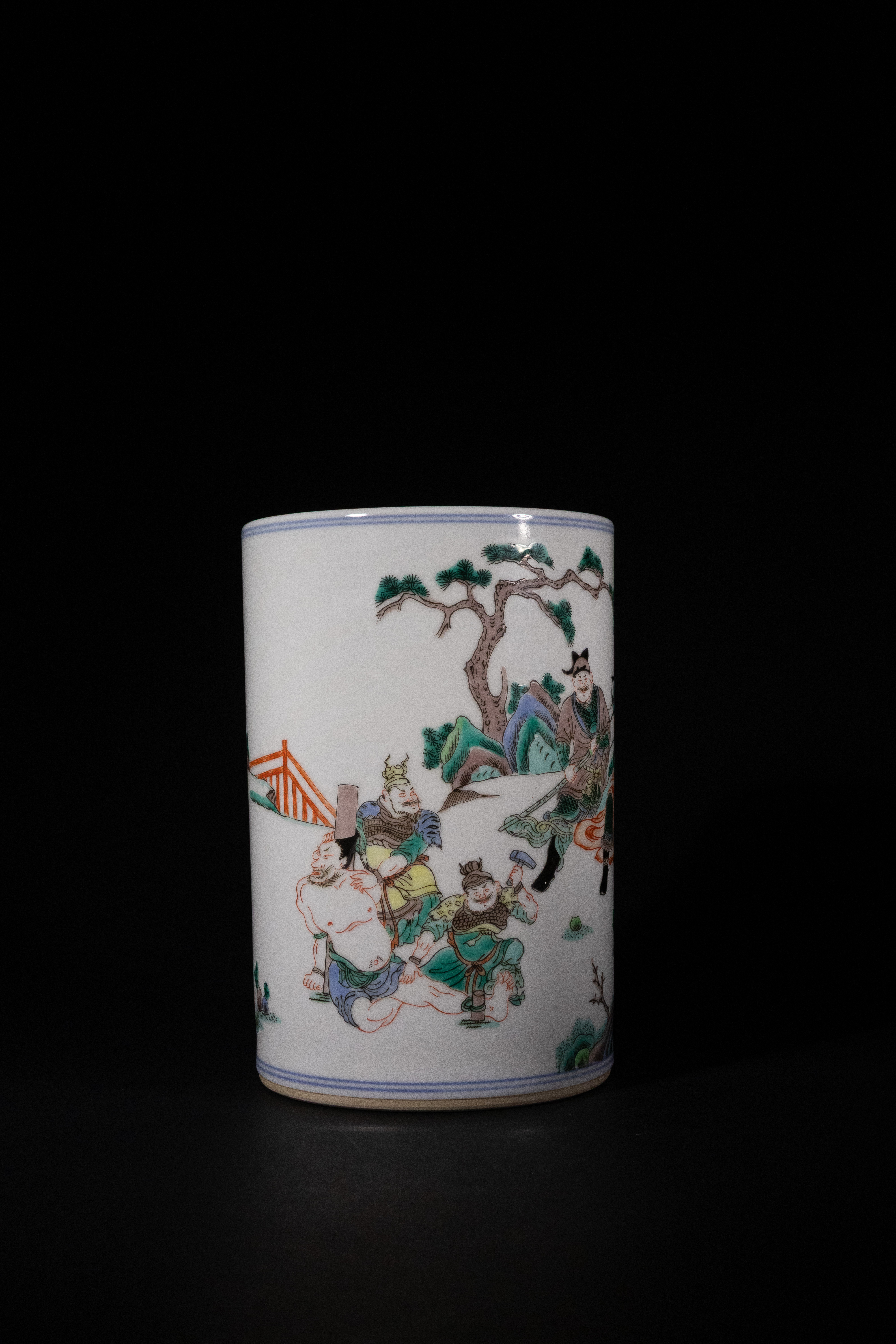 A Chinese Famille Verte brush pot, bearing a Kangxi mark. This cylindrical porcelain vessel is adorned with polychrome enamel decoration, depicting a vibrant narrative scene featuring several male figures in traditional attire, possibly warriors or immortals, positioned within a landscape of trees, rocks, and architectural elements including a bridge. Double underglaze blue lines border the rim and foot. The recessed base bears a six-character imperial mark in underglaze blue, reading "大清康熙年製" (Dà Qīng Kāngxī Nián Zhì), which translates to "Made in the Kangxi reign of the Great Qing dynasty."