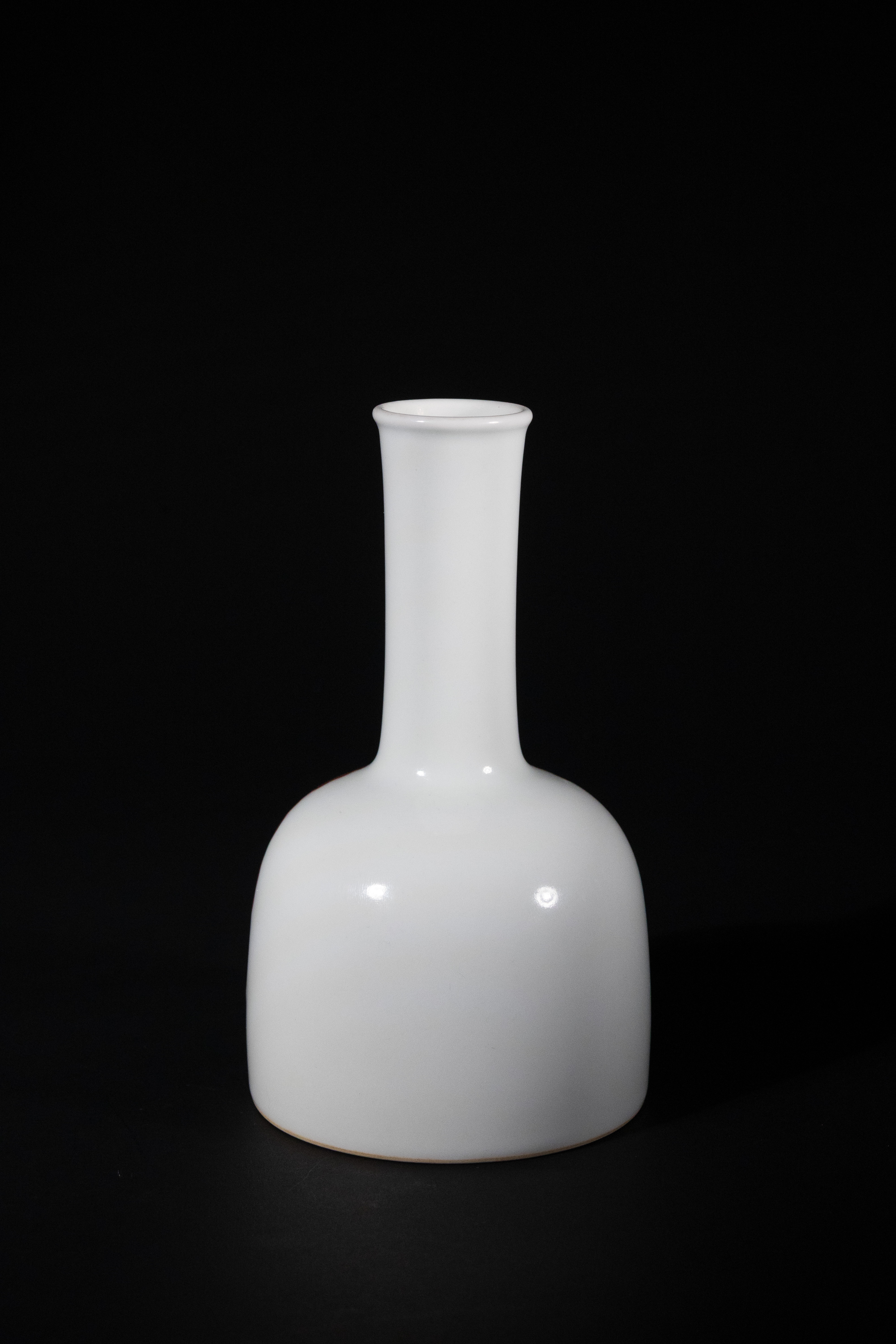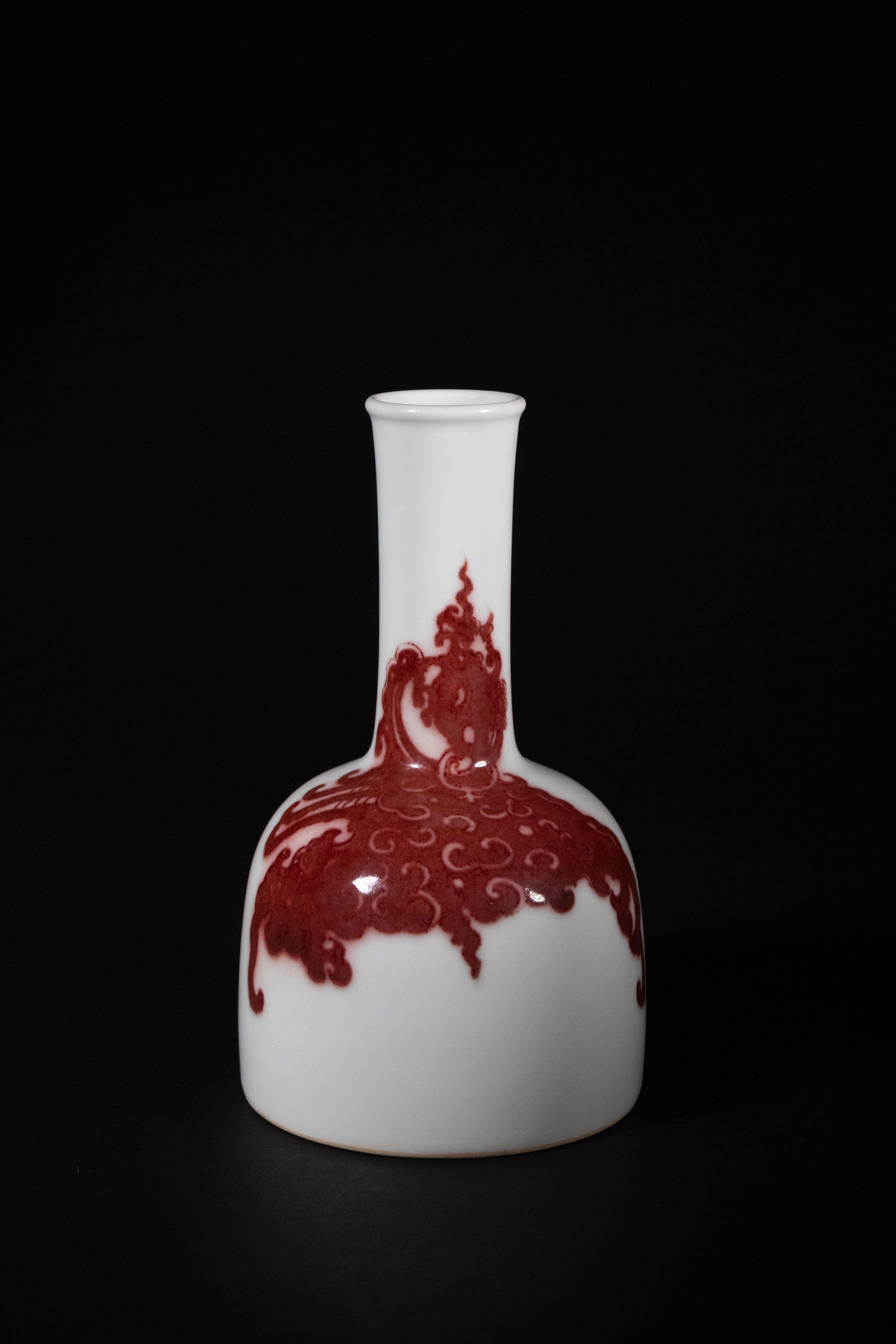 A Chinese underglaze copper-red decorated ‘phoenix’ yaoling zun, also known as a mallet vase, Kangxi marked. The porcelain bottle vase features a globular body rising to a tall, slender cylindrical neck, resting on an unglazed foot rim. It is decorated with a stylized mythical bird, likely a phoenix, amidst flame or cloud motifs, rendered in vibrant underglaze copper-red against a pristine white ground. The base bears a four-character underglaze blue mark, ‘大清康熙年製’ (Da Qing Kangxi Nian Zhi), indicating ‘Made in the Kangxi Period of the Great Qing Dynasty’.