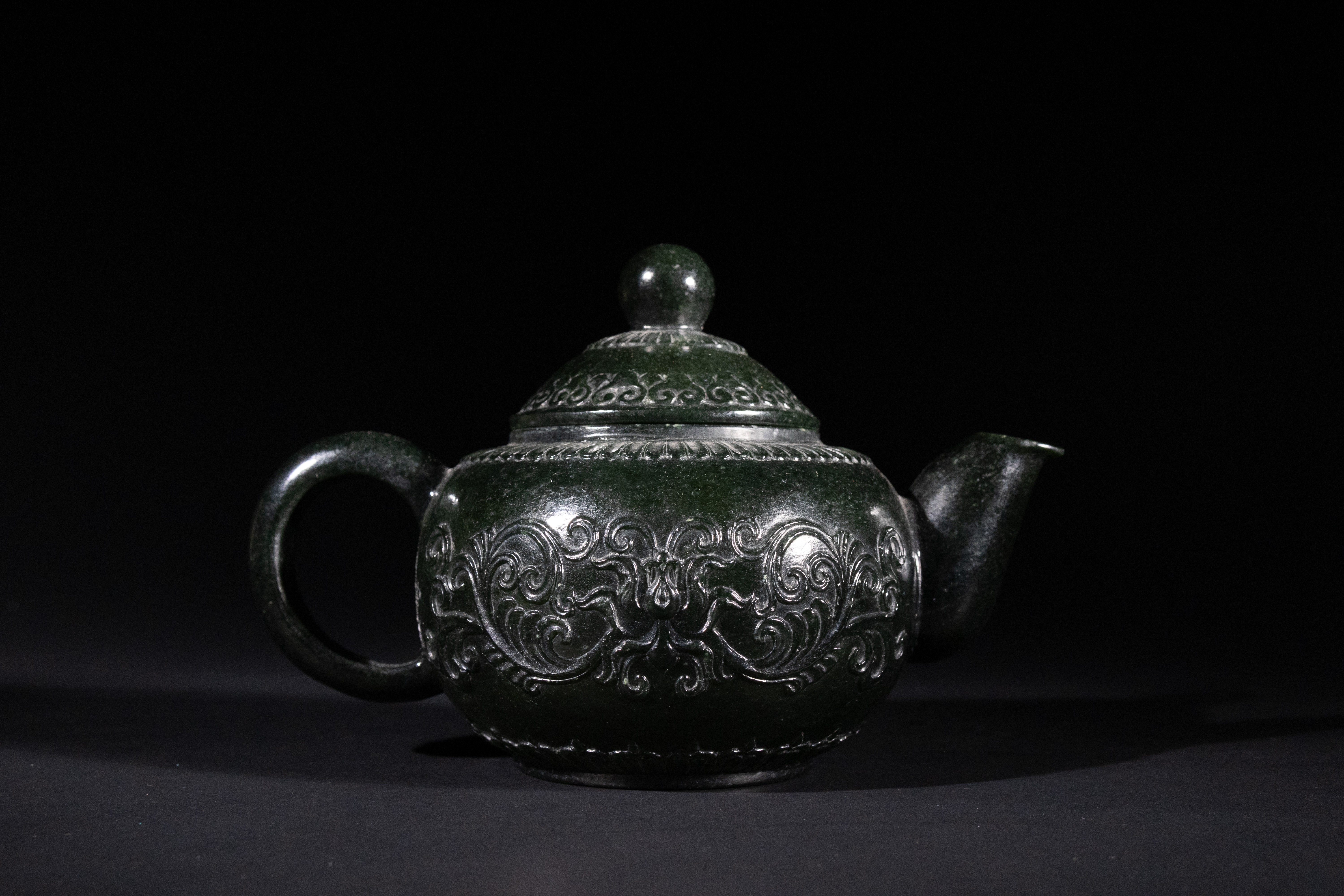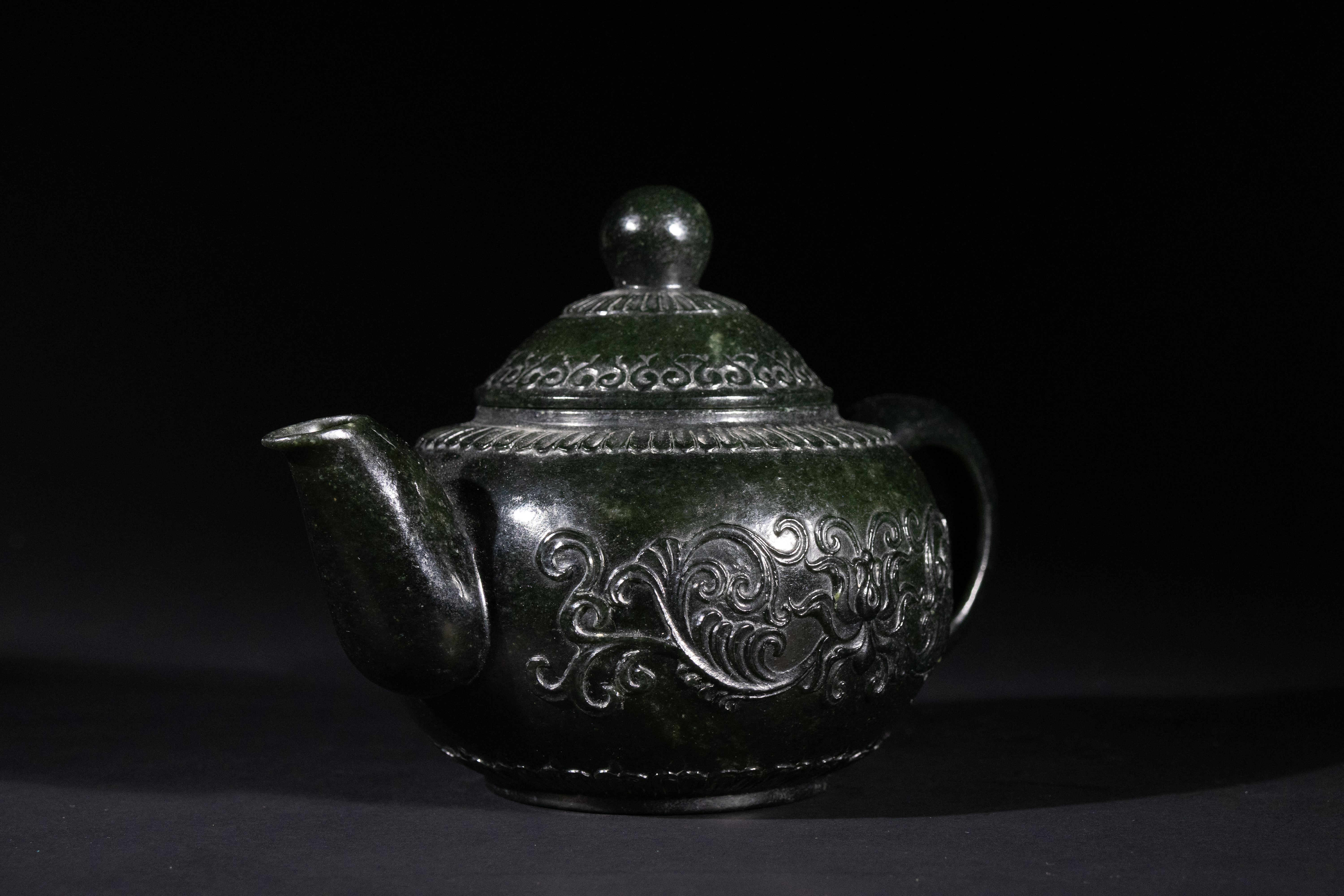 A Chinese Hetian green jade teapot. This teapot features a traditional bulbous body, curved handle, and short spout. Both the body and the domed lid, which is topped with a spherical finial, are extensively carved with intricate scrolling floral or foliate motifs.