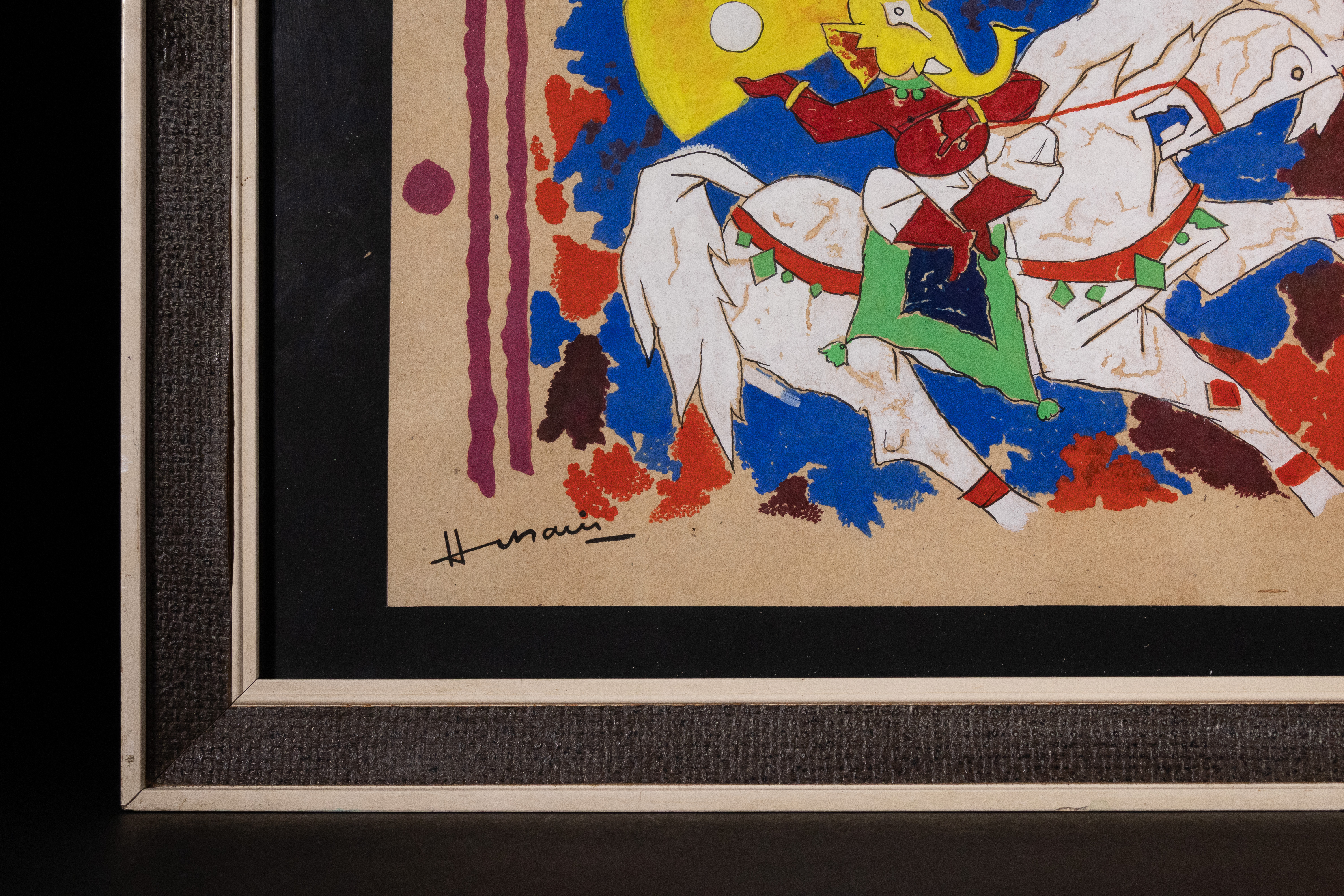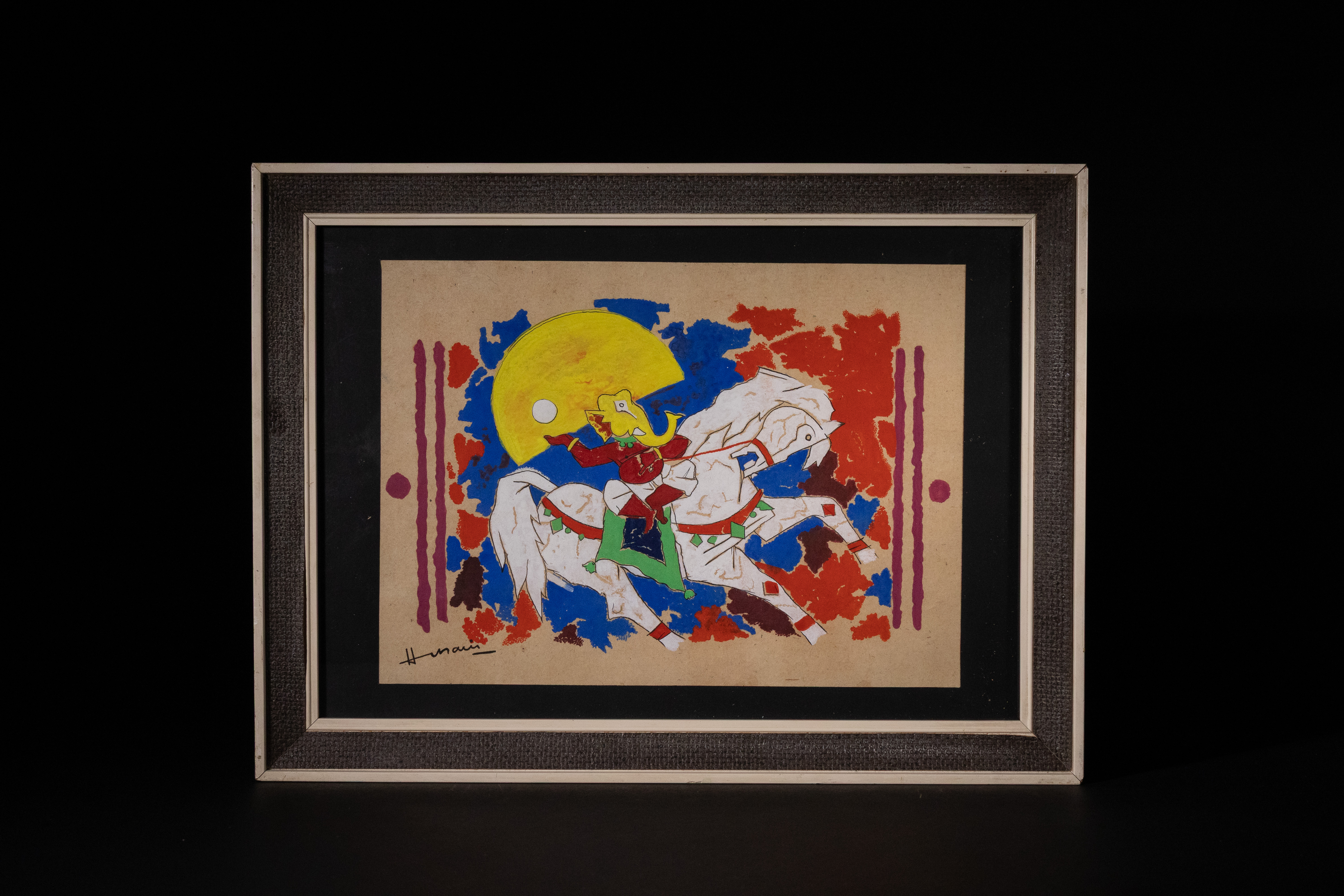 Maqbool Fida Husain (1915-2011). An original artwork, painting executed in opaque media (possibly gouache or tempera) on tan paper, depicting a stylized white horse ridden by a caricatured figure with an elongated yellow head. The background features dynamic strokes of red, blue, and purple, with a prominent yellow disc. Signed ‘Hussain’ in the lower left corner.