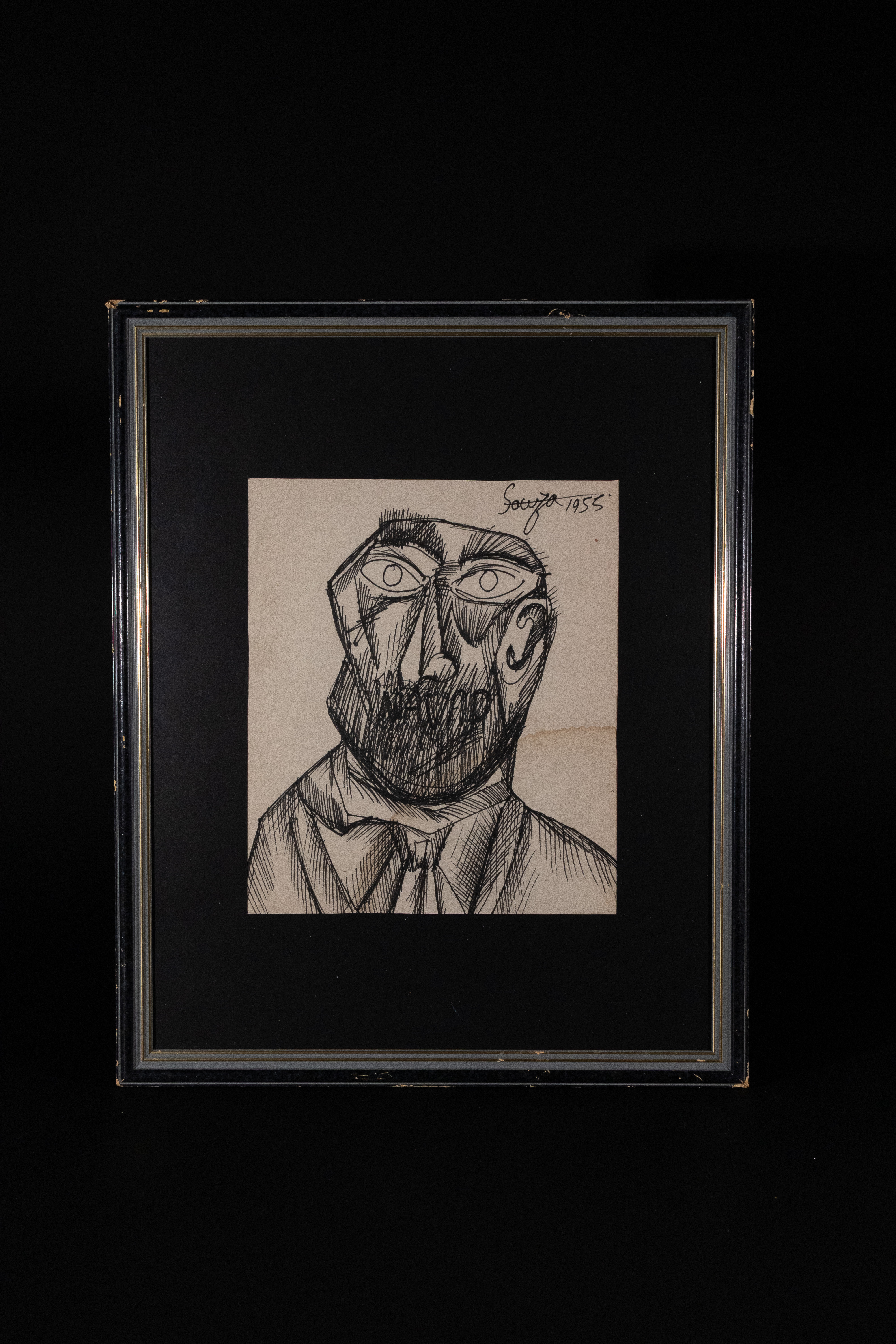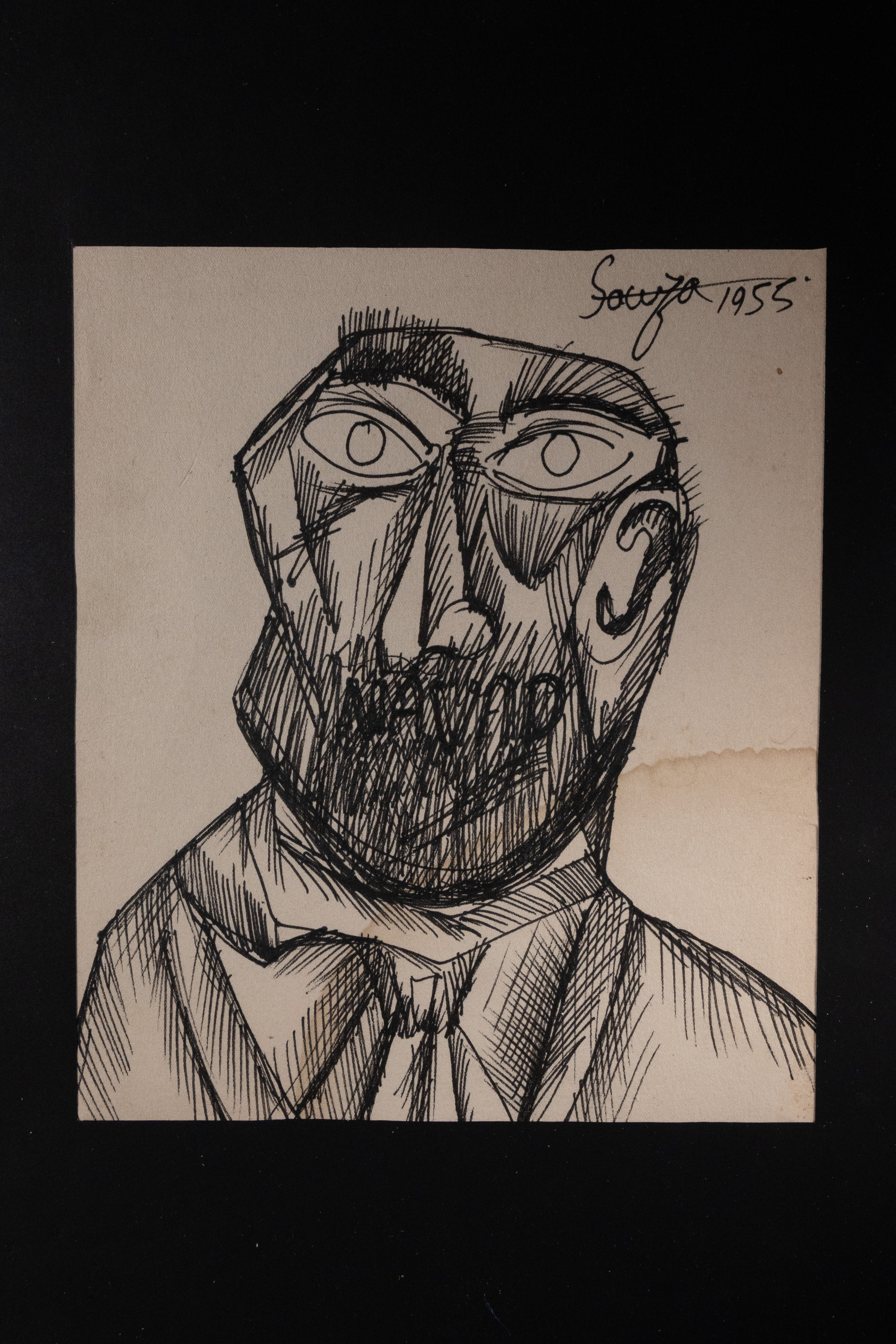 An ink drawing on paper by Francis Newton Souza, dated 1955. The artwork depicts a stylized, angular portrait or bust, rendered with heavy black ink lines and hatching, showing influences of cubist or expressionist styles. The piece is signed "Souza" in the upper right corner, alongside the date.