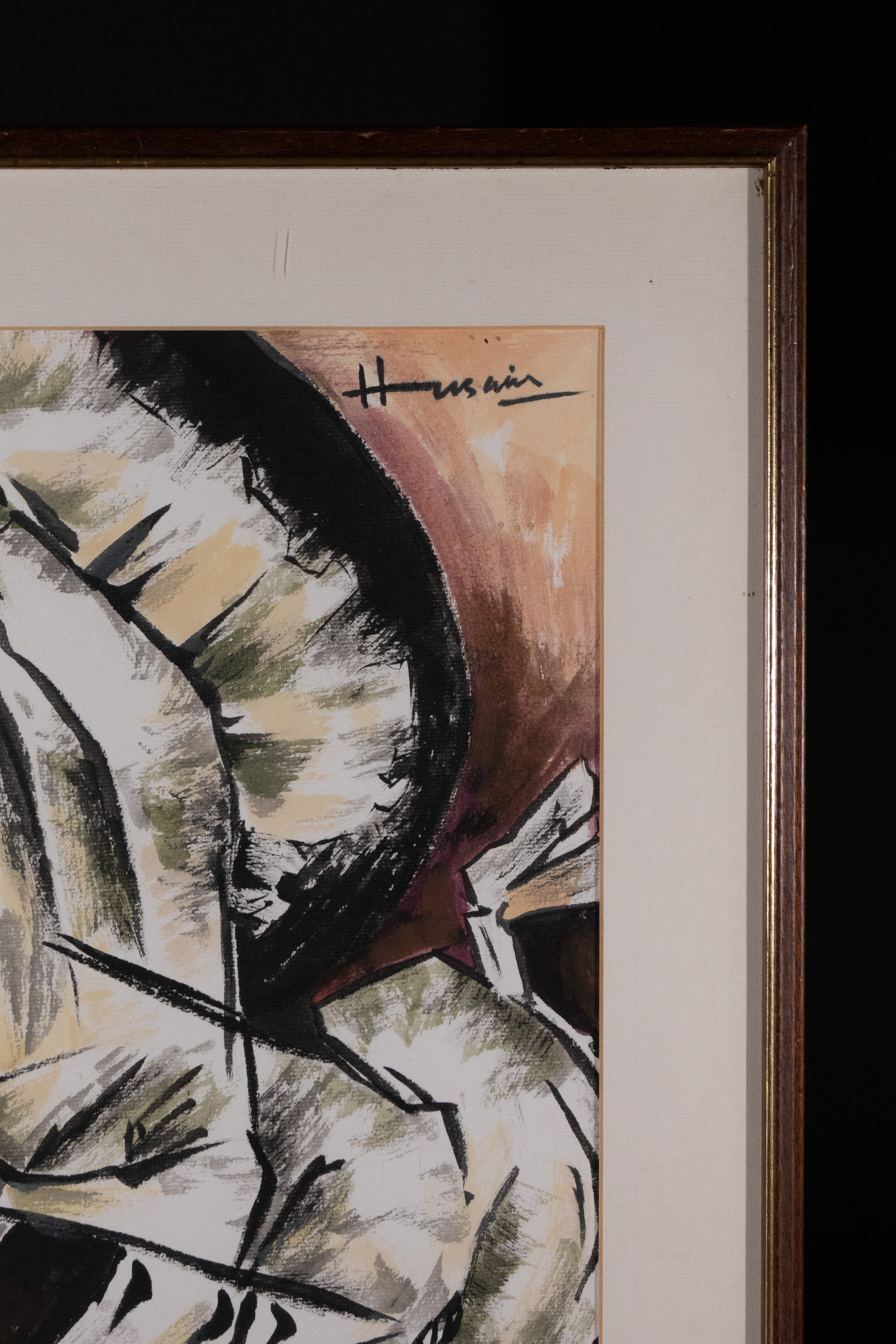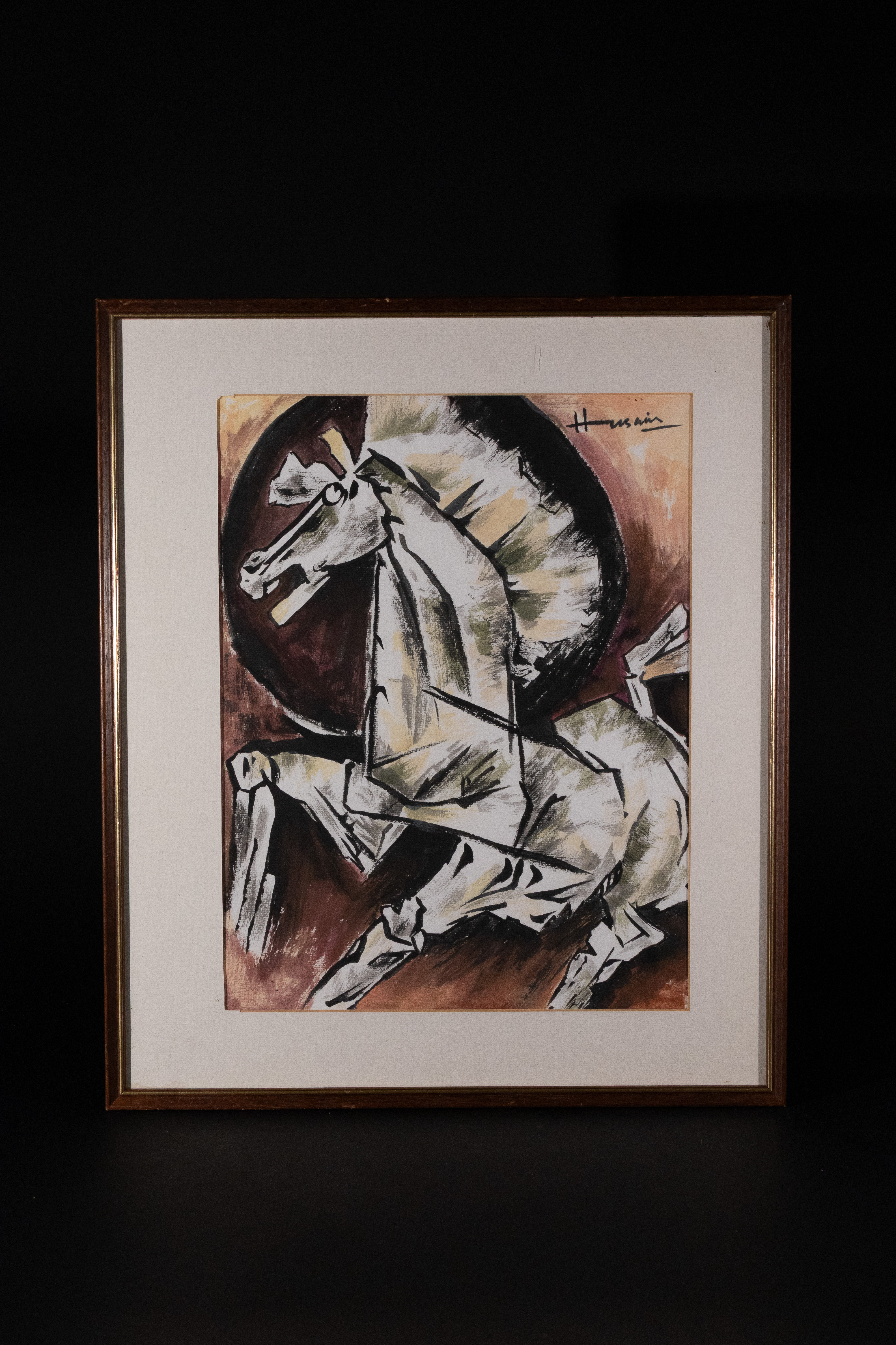 Maqbool Fida Husain (Indian, 1915-2011), Untitled (Horse). This framed modernist artwork, painting on paper, depicts a highly stylized and abstracted rearing horse. The composition features strong angular lines and a palette primarily of black, white, cream, and reddish-browns, set against a dark circular background, all mounted within a light mat. A cursive signature, "Husain, " is visible in the upper right corner of the artwork.