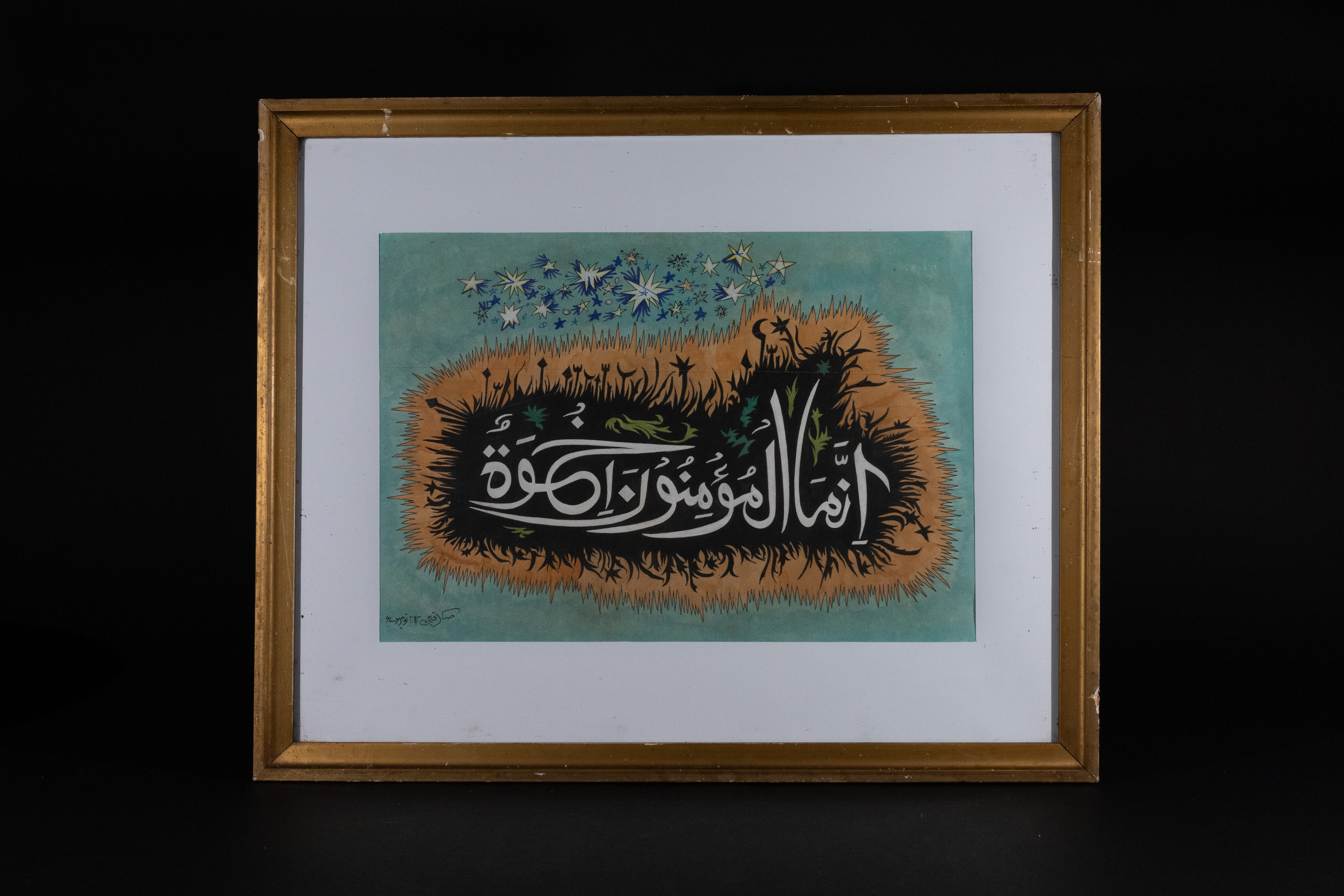 A framed piece of Arabic calligraphy, executed in black, white, green, and orange inks or paints on a light blue-green ground. The central calligraphic panel features the Arabic phrase “إِنَّمَا الْمُؤْمِنُونَ إِخْوَةٌ” (Innamal-mu’minūna ikhwatun), translating to “The believers are but brothers,” rendered in a prominent, flowing script style. This central motif is encircled by a vibrant, spiky orange border, and surmounted by scattered blue and white star-like patterns. A signature and numeric inscription, “حسين عارف ٩٧٢٤٢٣” (Hussein Arif 972423), are visible in the lower left corner.