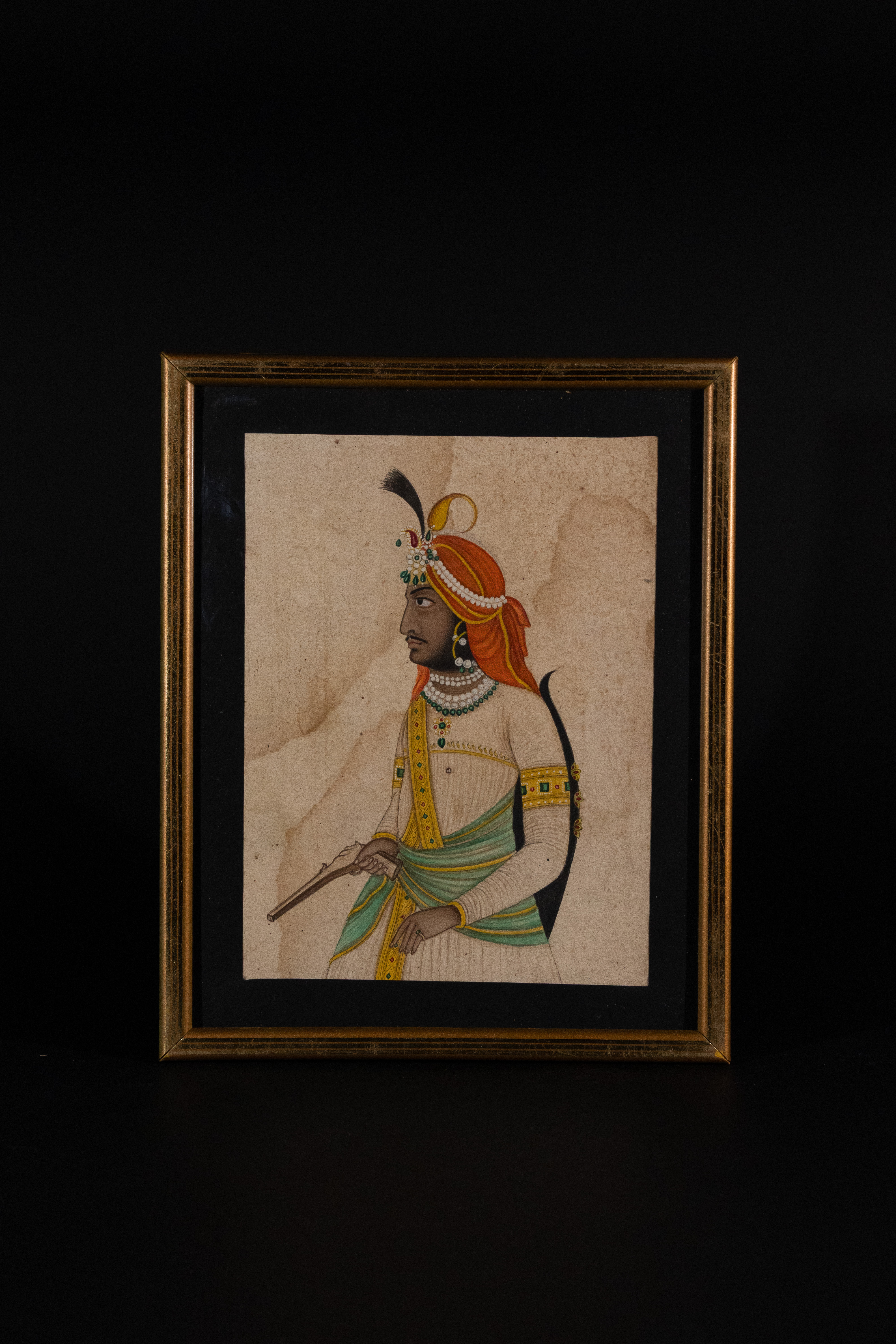 A Mughal Indian miniature portrait of a prince, 18th/19th century. This framed miniature painting on paper depicts a dark-skinned male figure in profile, facing left. He is elaborately attired in a white pleated tunic, a green and gold sash, and a red turban adorned with pearls, a feather, and various gemstones. The figure is accessorized with multiple pearl necklaces, large earrings, and decorated armbands. He holds a slender, dark object in his right hand, with a dark, curved form partially visible behind him, likely a weapon or shield.