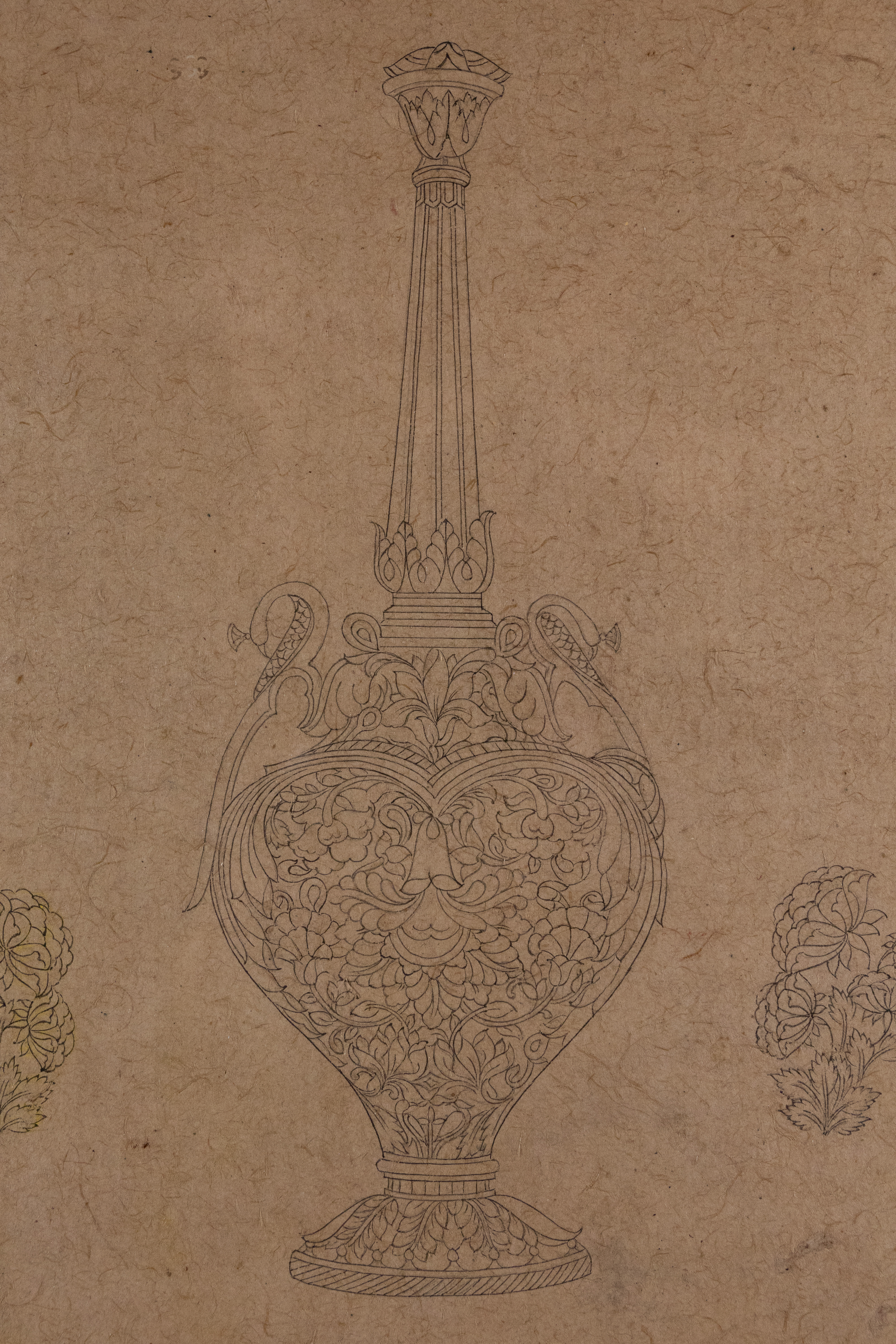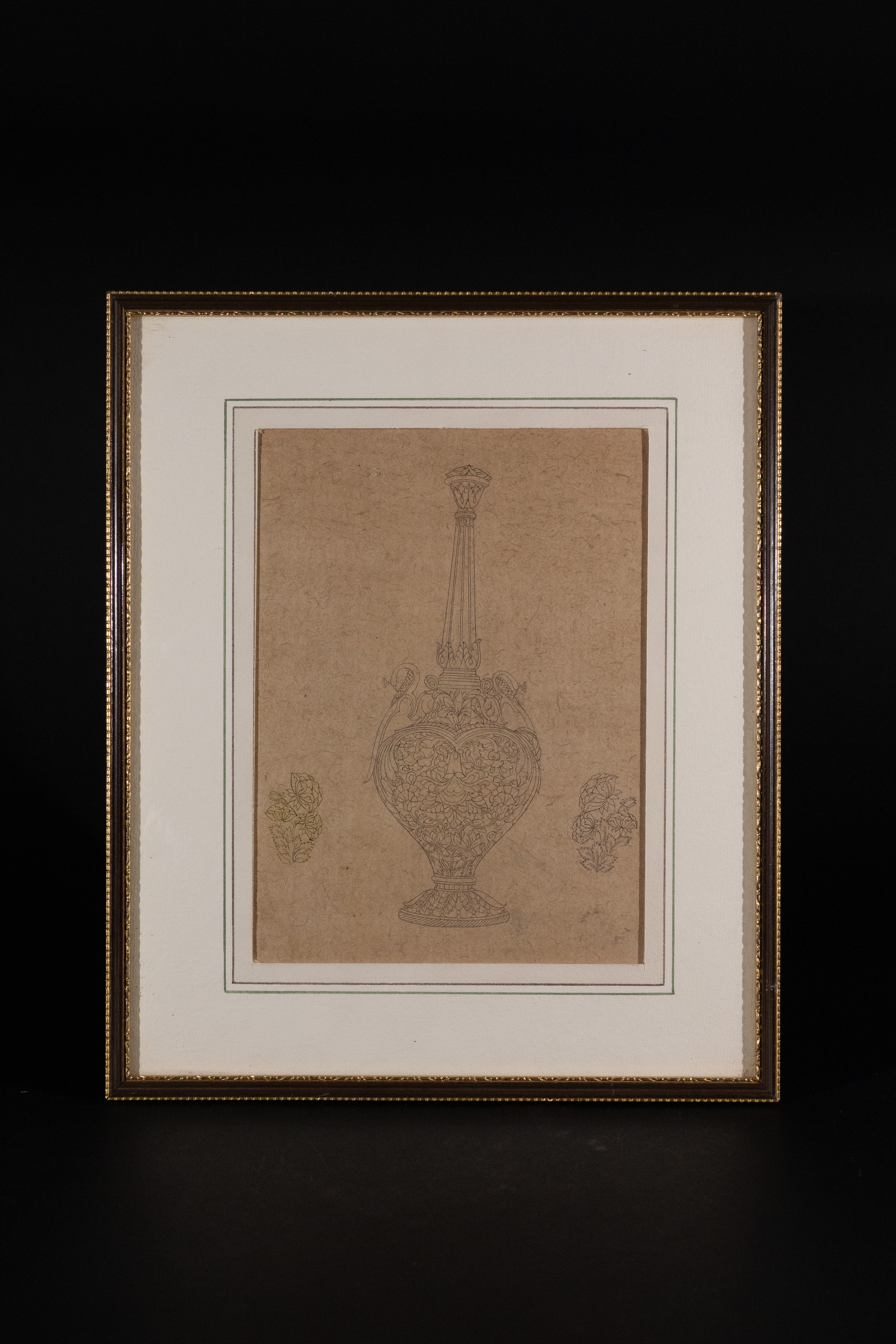 A framed drawing depicting an ornate vessel, possibly a rosewater sprinkler or perfume flask, flanked by two floral motifs, executed in an Indo-Persian or Mughal style. The central object features intricate scrolling foliate designs rendered in a precise linear technique. The drawing is on light brown, fibrous paper, showing age-consistent discoloration and texture variations.