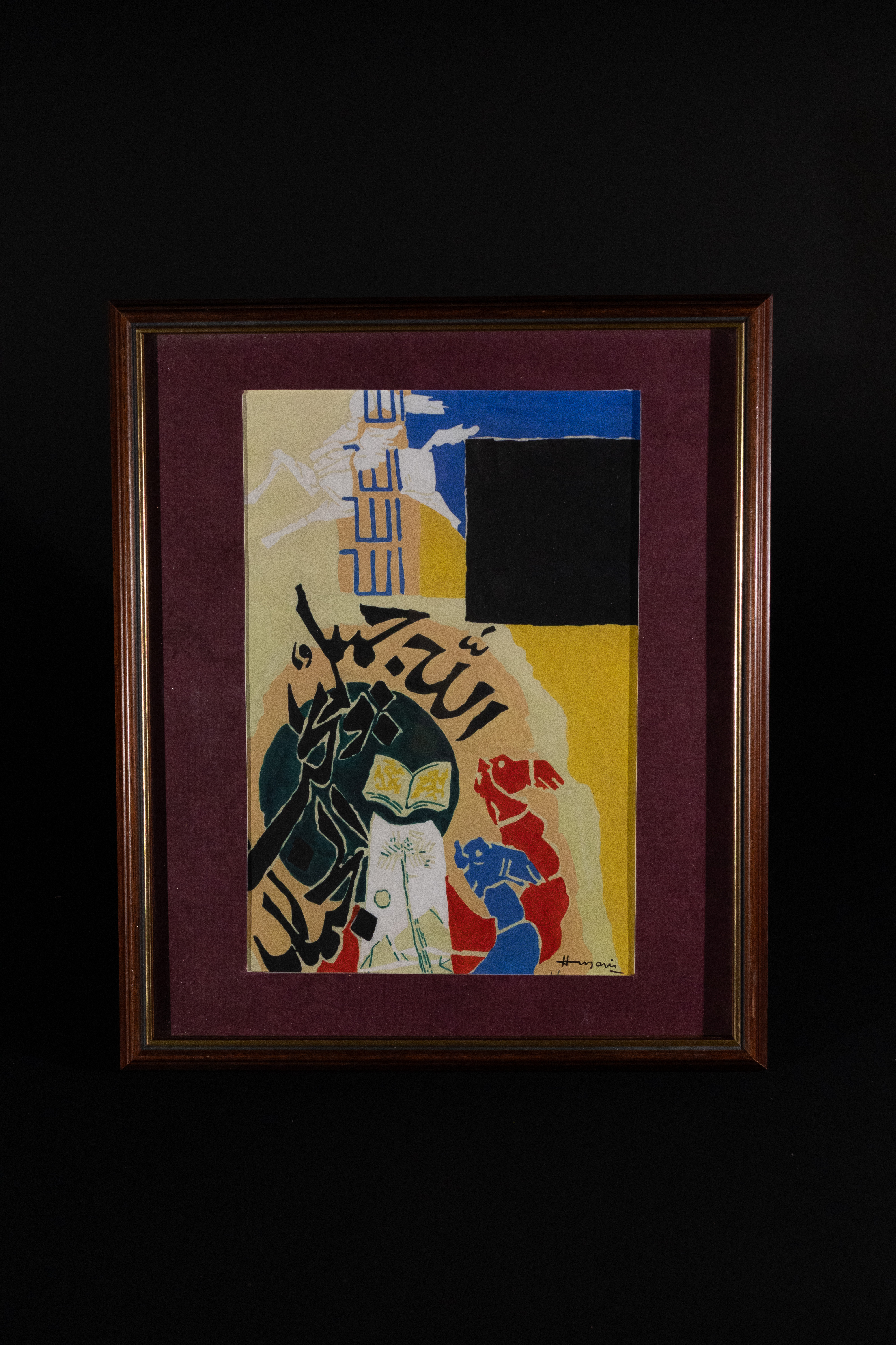An abstract painting on board by Maqbool Fida Husain (1915-2011). The composition features vibrant colors including yellow, blue, red, black, and white, with prominent stylized Arabic calligraphy, notably the word "الله" (Allah, meaning God) in black. Abstract figures in red and blue are visible alongside geometric shapes, including a black rectangle in the upper right. The artwork is signed in lower right corner.