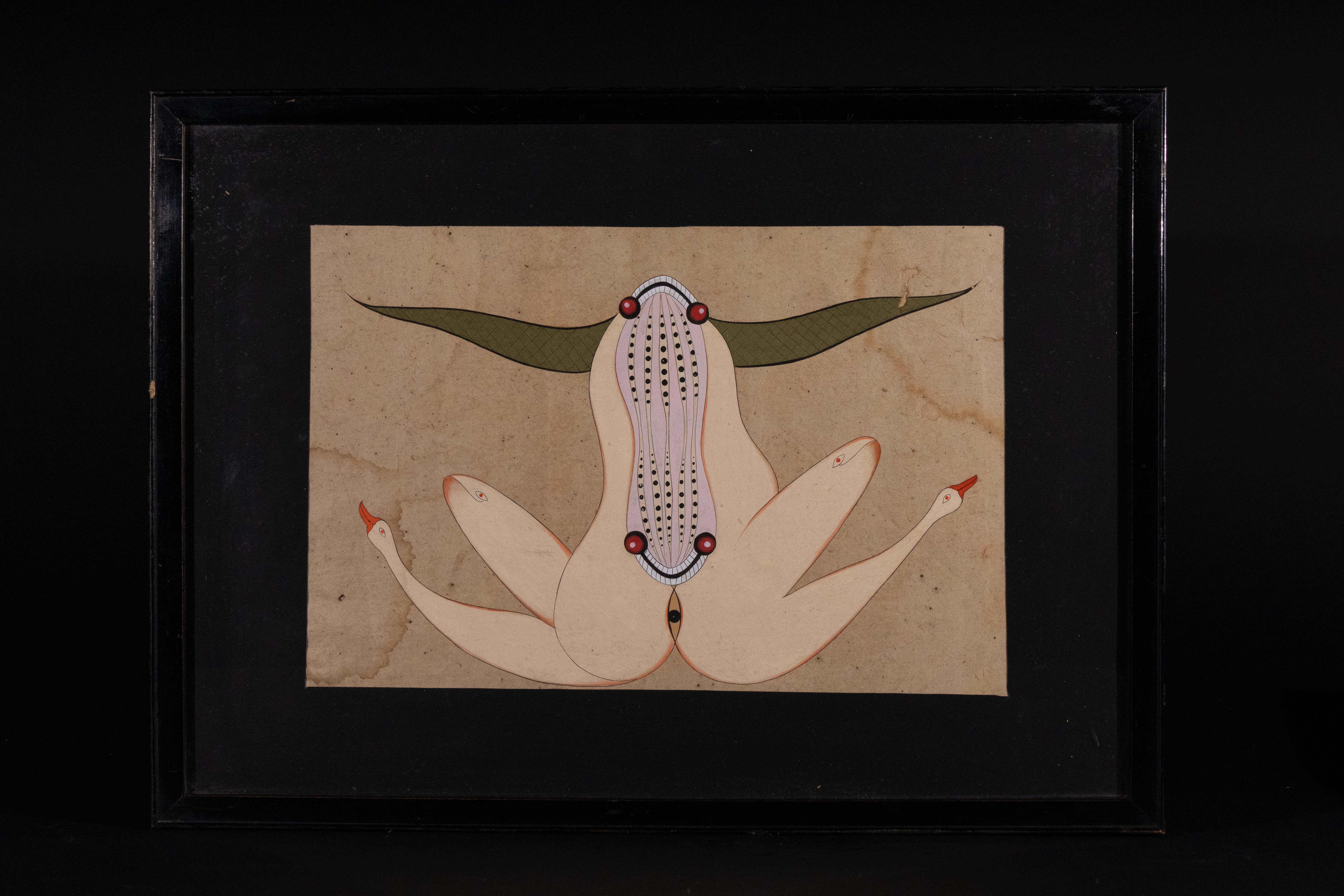 This traditional Indian miniature-style painting is executed in watercolor or gouache on light brown paper. The central composition depicts a composite figure, formed by multiple bird-like figures, likely swans, with red beaks and eyes, arranged to create a lower body. This supports an elongated central form adorned with intricate patterning and prominent red circular details, flanked by green horn-like or foliage elements.