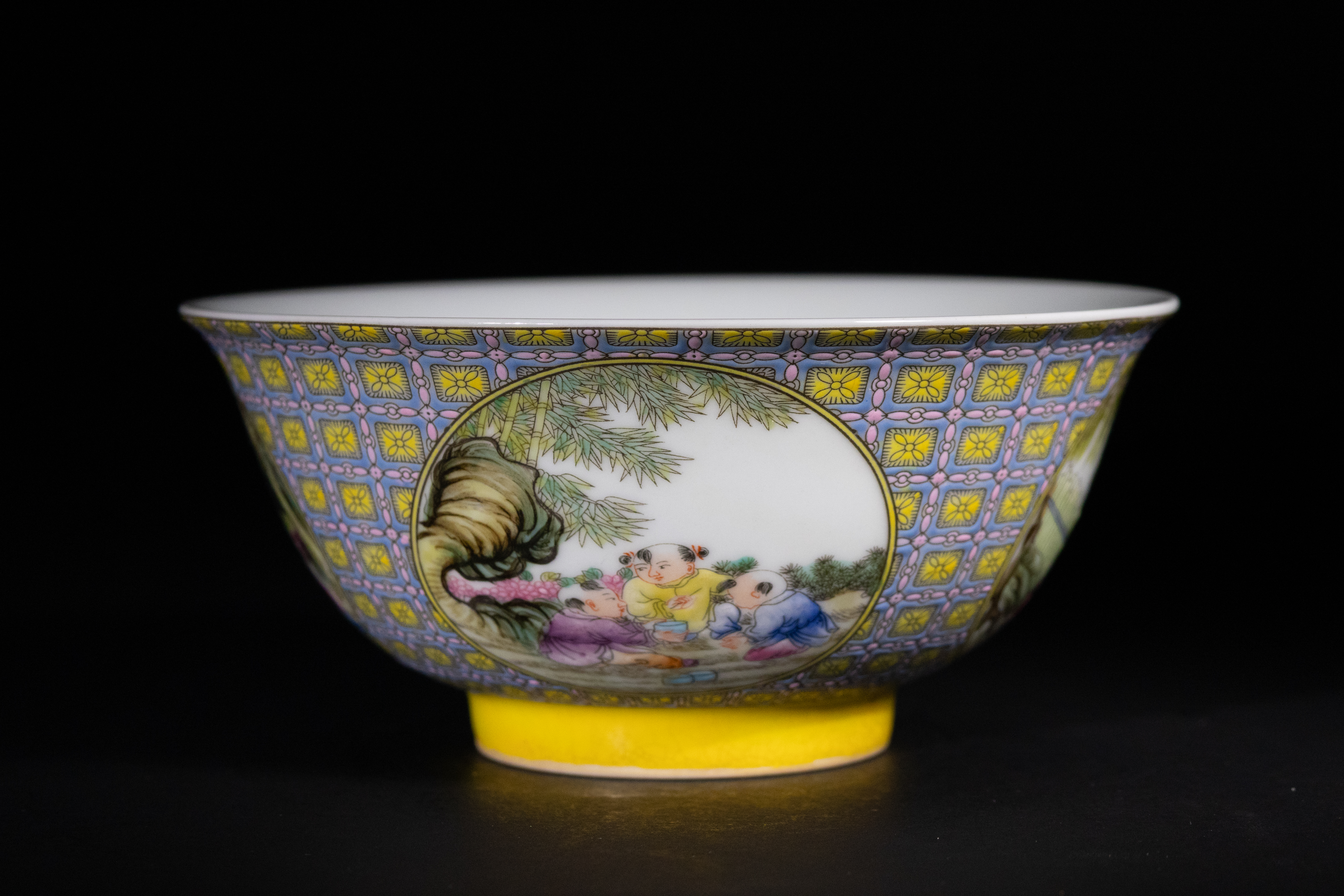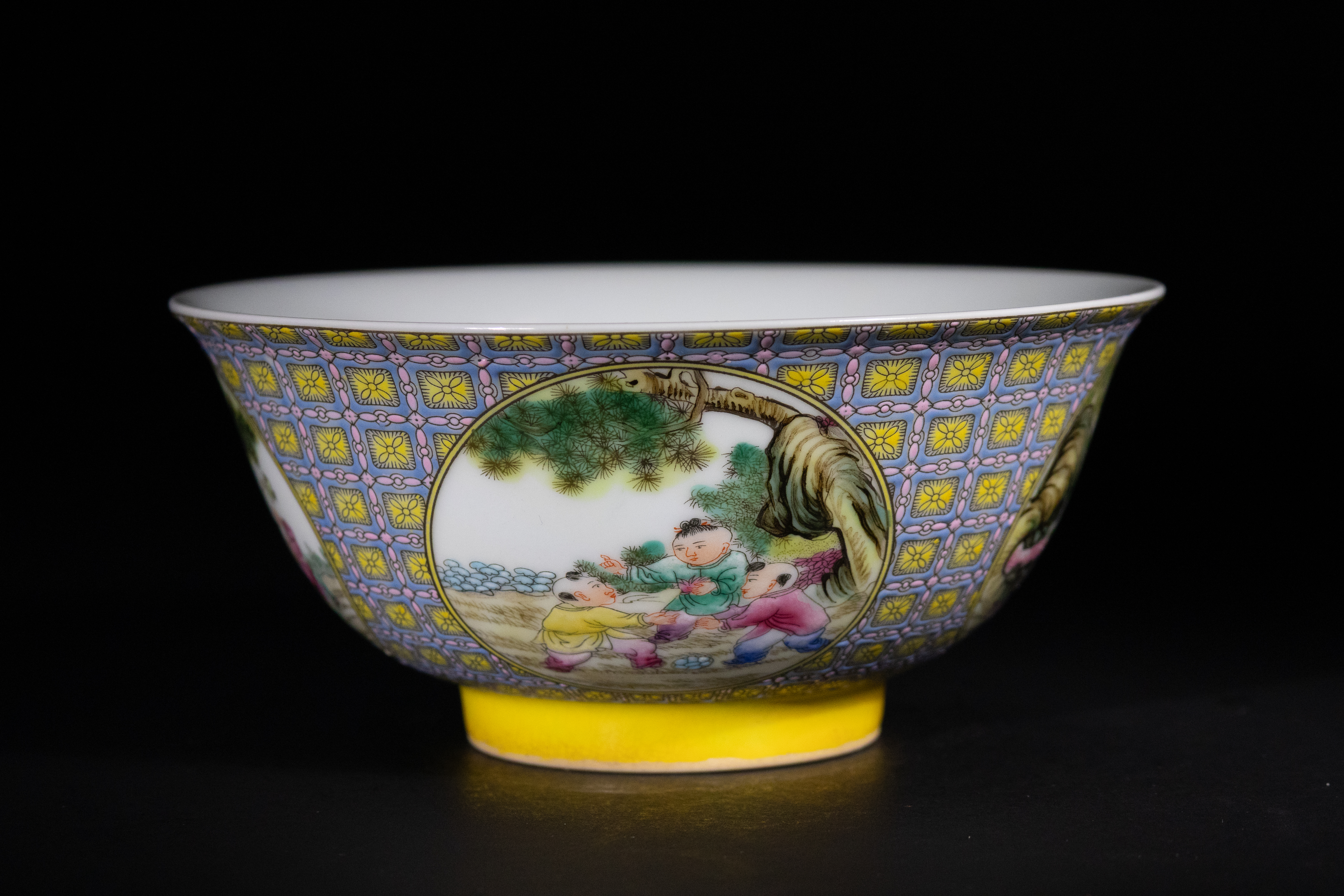 A Chinese Famille Rose yellow-ground ‘children at play’ medallion bowl. The deep body features a flared rim and a vibrant yellow footring. The exterior is adorned with multiple circular reserves, each depicting lively scenes of children playing in a natural landscape with trees and fences. These reserves are set against an intricate blue and pink geometric lattice ground, interspersed with yellow and containing small floral motifs. The interior is plain white. The base bears a blue underglaze four-character mark, ‘康熙御製’ (Kāngxī Yùzhì), which translates to ‘Made for Imperial Use during the Kangxi reign.’