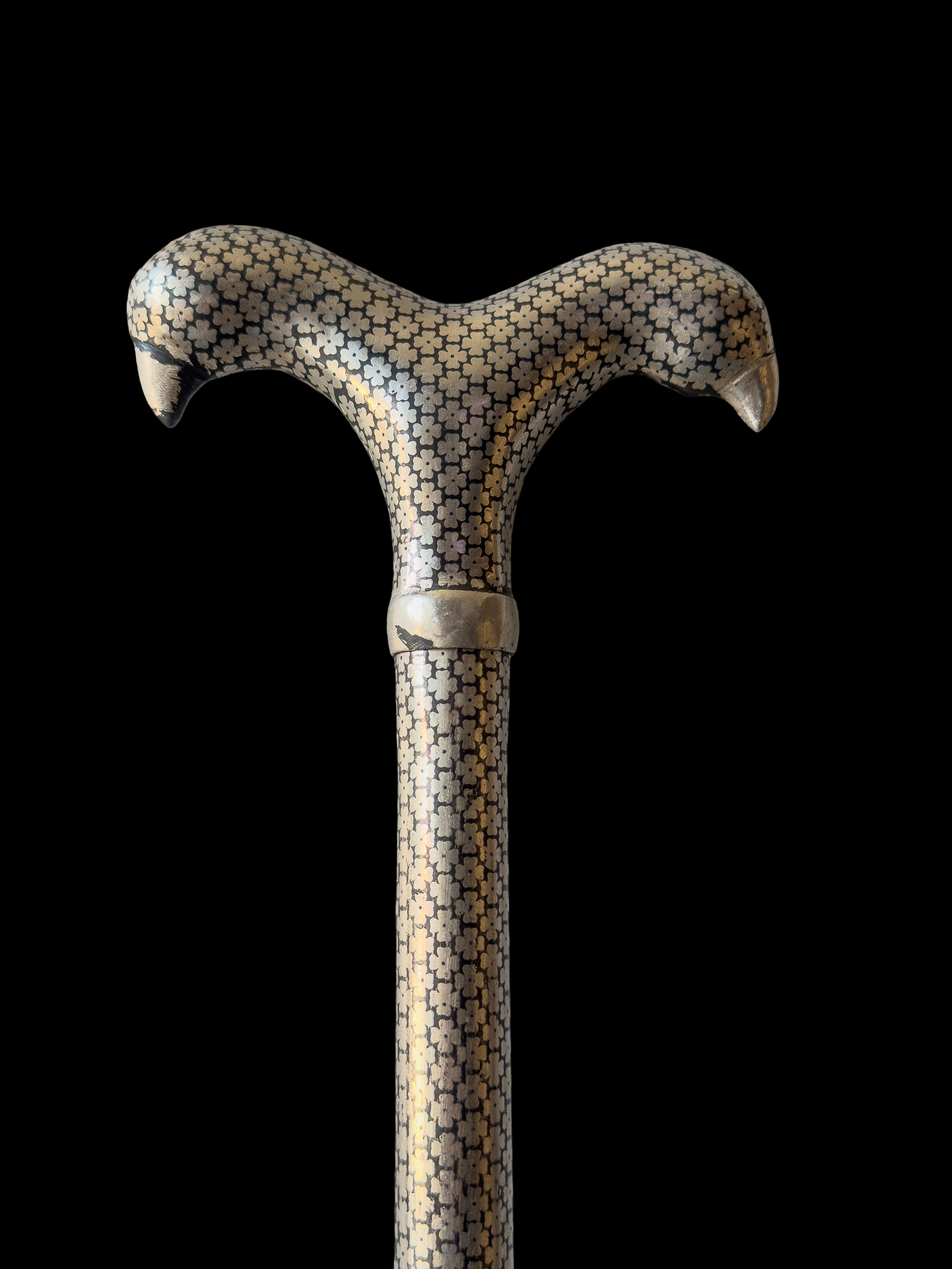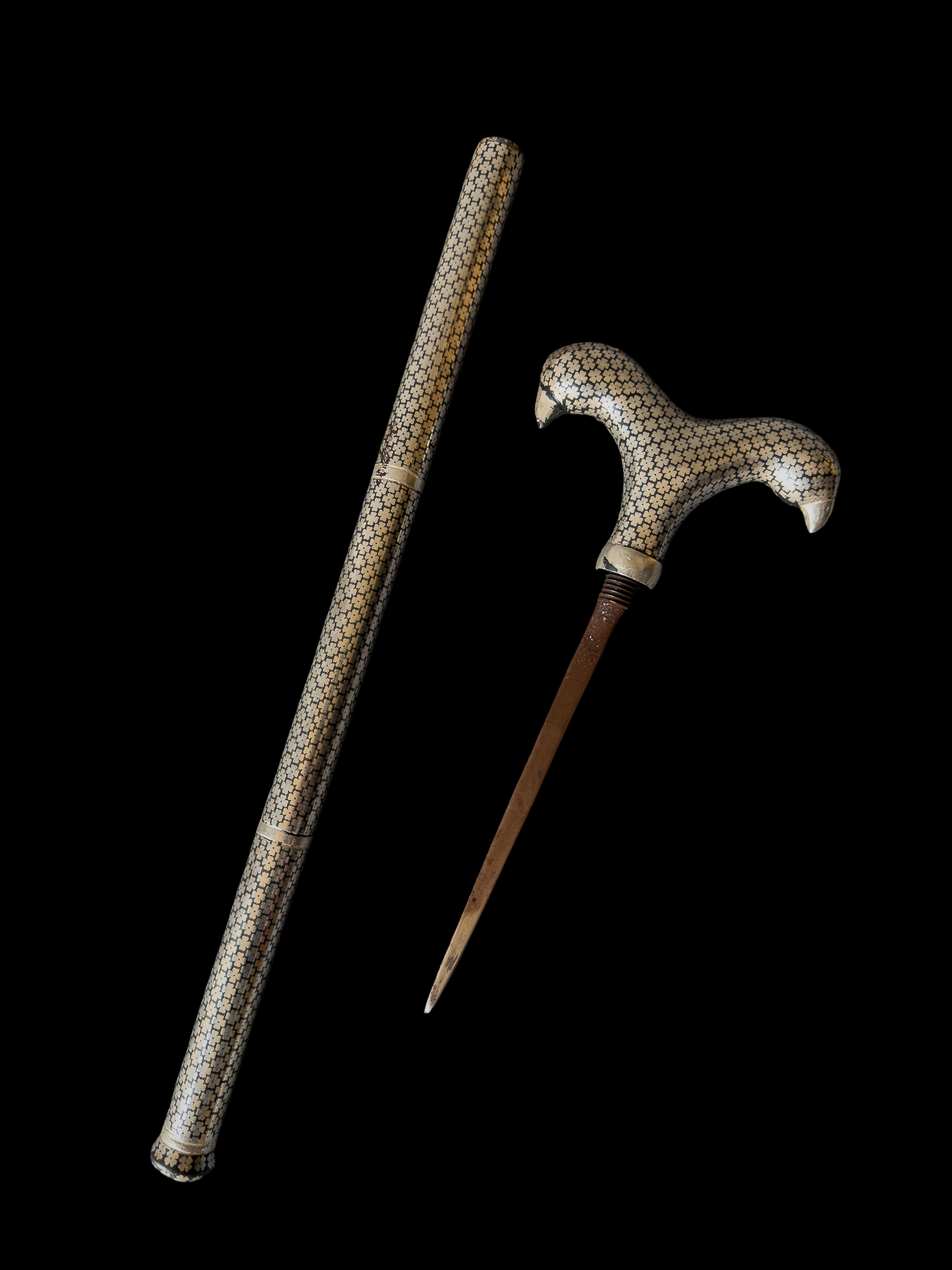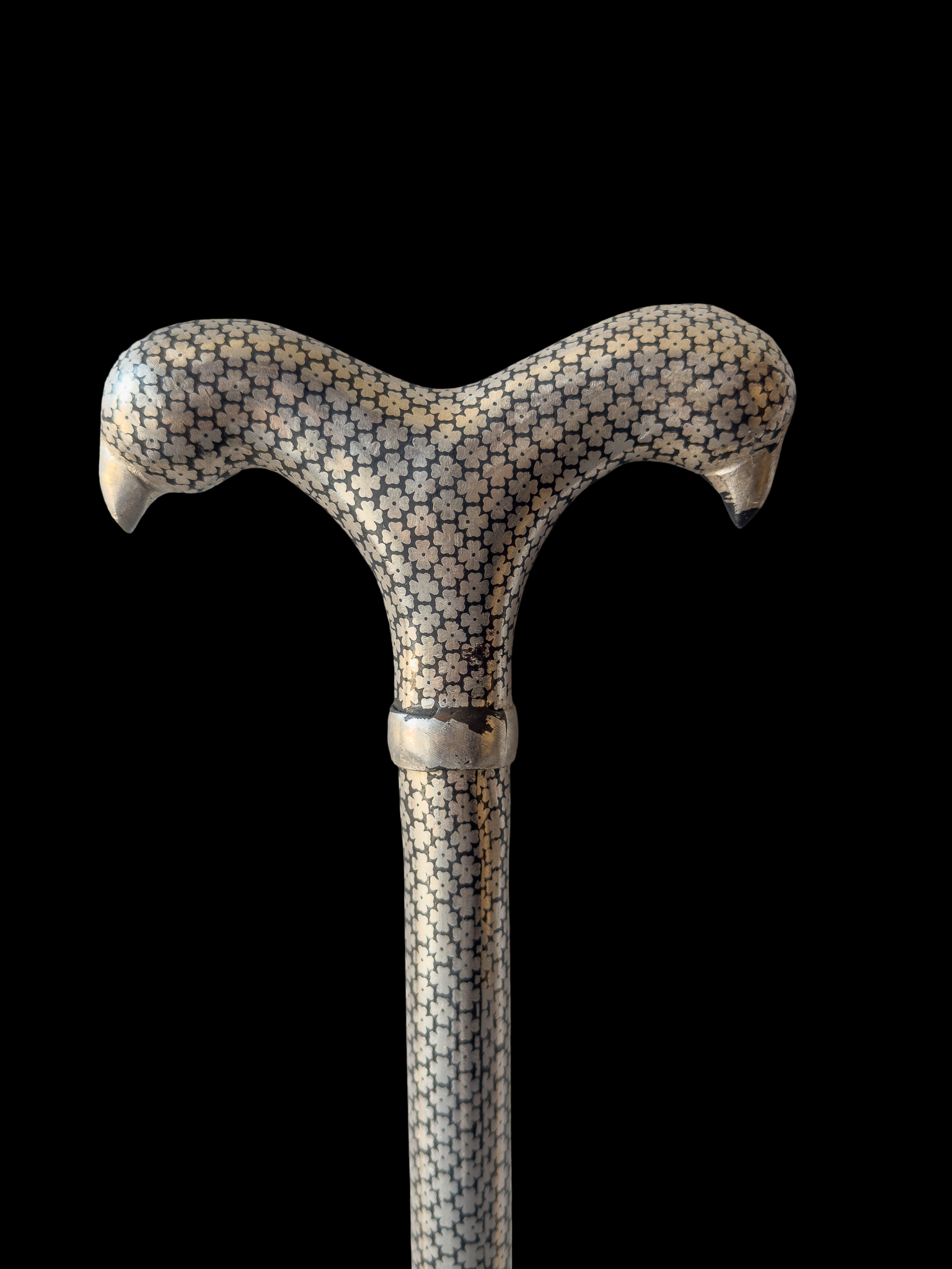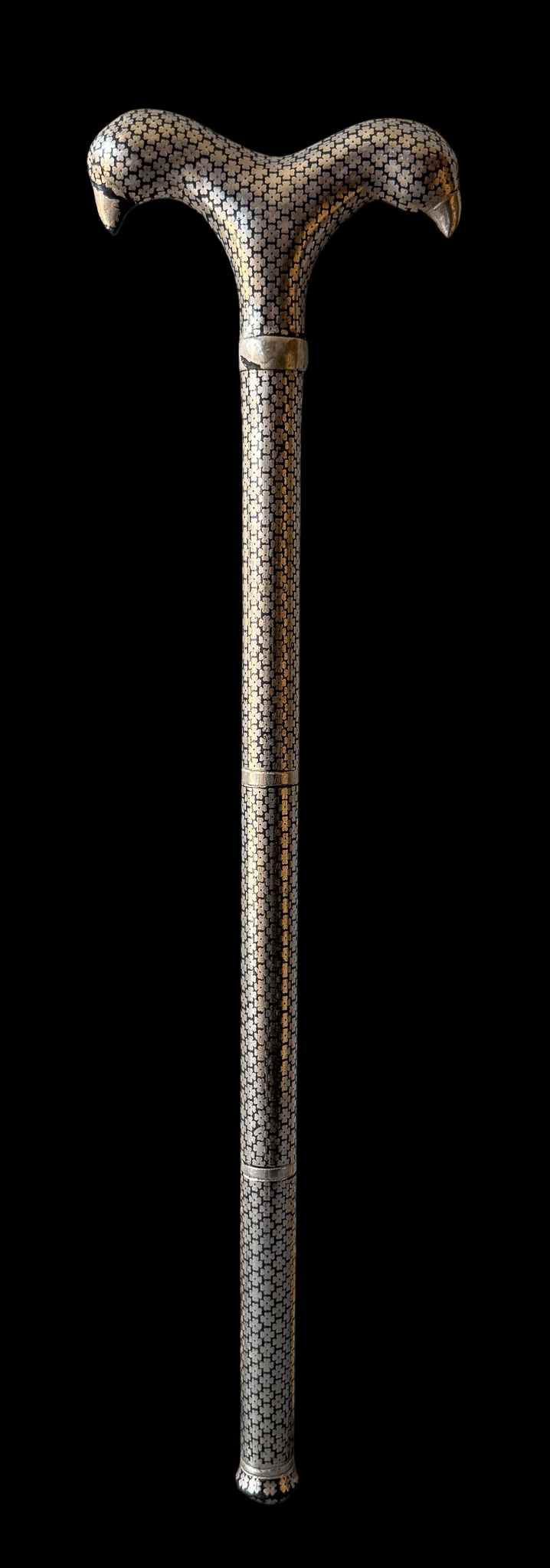 An Indo-Persian niello-work sword stick. The item features a bifurcated handle resembling two stylized animal heads, surmounting a tapered shaft. Both the handle and shaft are extensively adorned with a dense, repeating pattern of small, light-colored four-lobed motifs, inlaid against a dark ground, characteristic of niello-work. The cane separates into two main components: the upper section comprising the handle and a short, pointed metal blade, and the lower section forming the sheath/shaft. A plain metallic band connects the handle to the shaft, and similar metallic accents are present on the handle’s tips and the cane’s base.