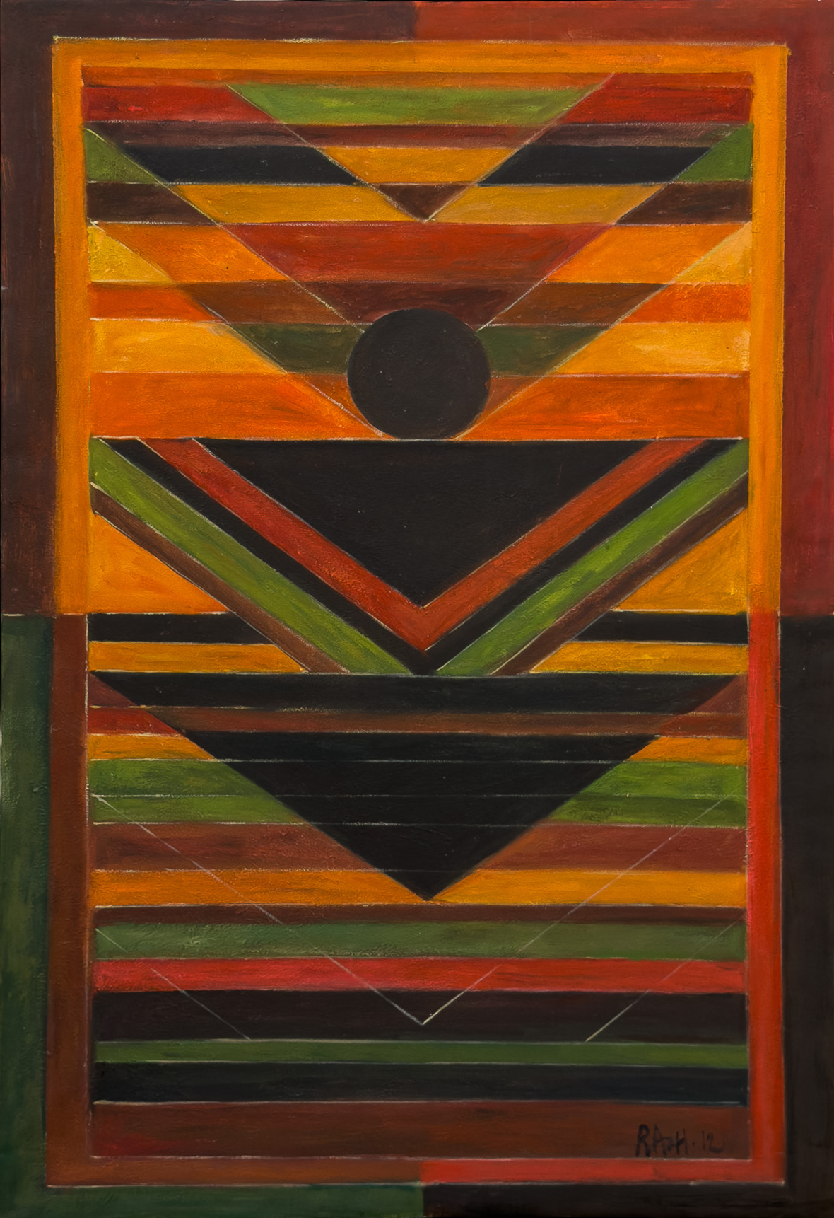An abstract geometric painting by Syed Haider Raza, executed in oil or acrylic on canvas. The composition features a symmetrical arrangement of horizontal and diagonal bands in a palette dominated by warm oranges, reds, yellows, and greens, contrasted with significant areas of black, including a central horizontal band and inverted triangular forms. A solid black circle is positioned above the central black band. The painting retains a textured surface indicative of brushwork. The lower right corner bears a visible signature.