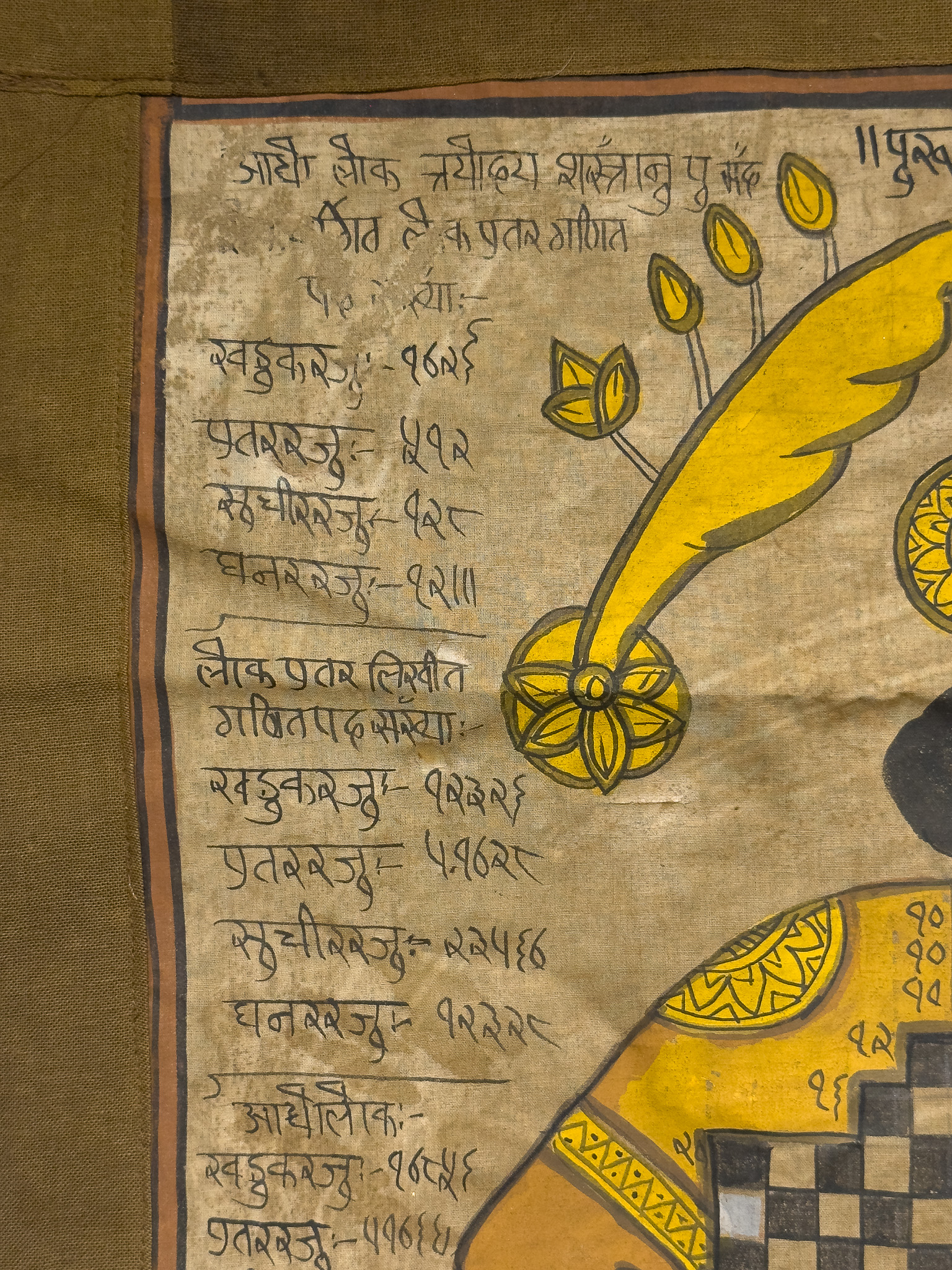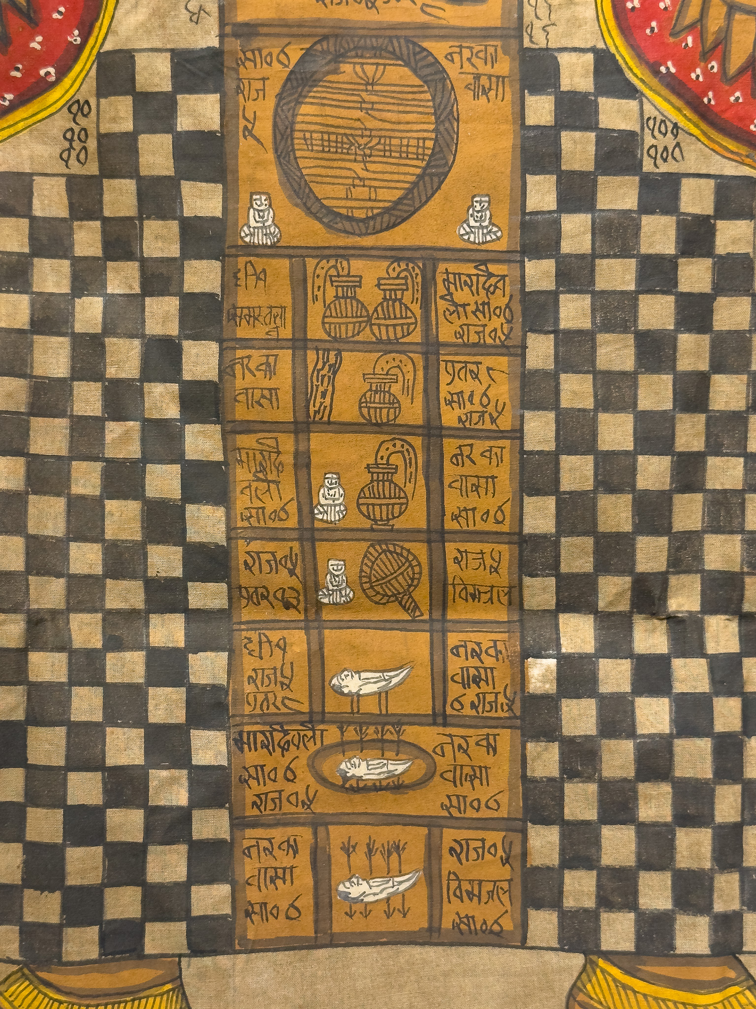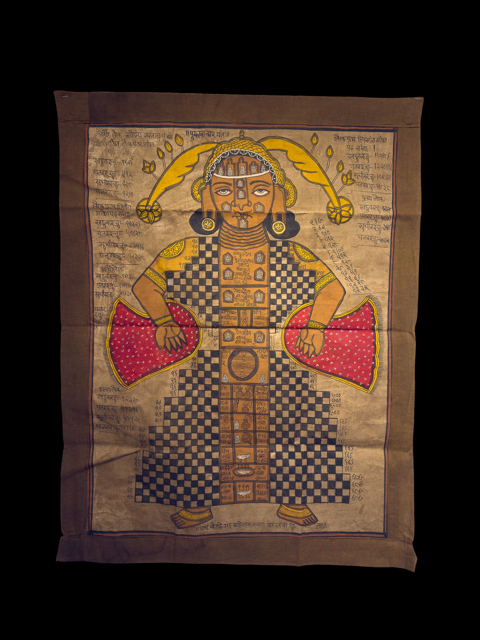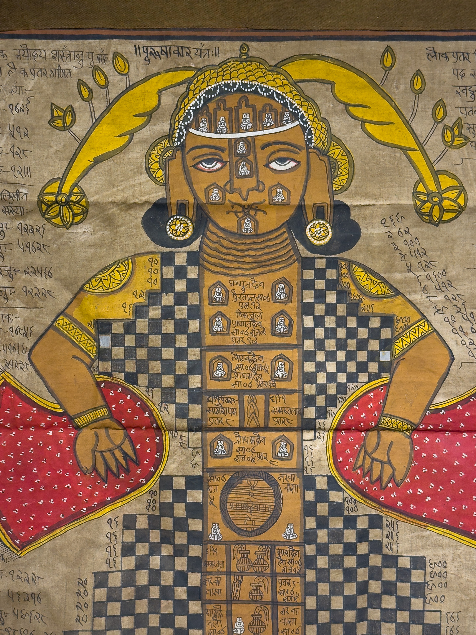 A Jain Purushagar Yantra (Cosmic Man) from Rajasthan, 19th Century. This painted textile scroll or banner depicts a stylized anthropomorphic figure formed by a grid of checkered and solid brown panels. Rendered in a schematic folk art style, the central figure features brown skin tones, yellow stylized headgear, and red dotted elements. Its segmented torso and limbs contain numerous smaller seated figures, symbolic motifs such as pots and birds, and further inscriptions. Extensive inscriptions in Devanagari script, accompanied by numerous numerical notations, are present both surrounding the figure and within its internal compartments, with a prominent header reading "॥पुरुषागार यन्त्रम्॥". Executed on a light brown woven textile with opaque pigments.