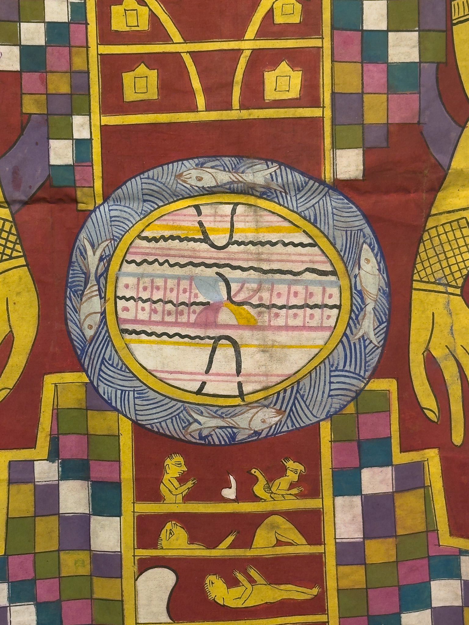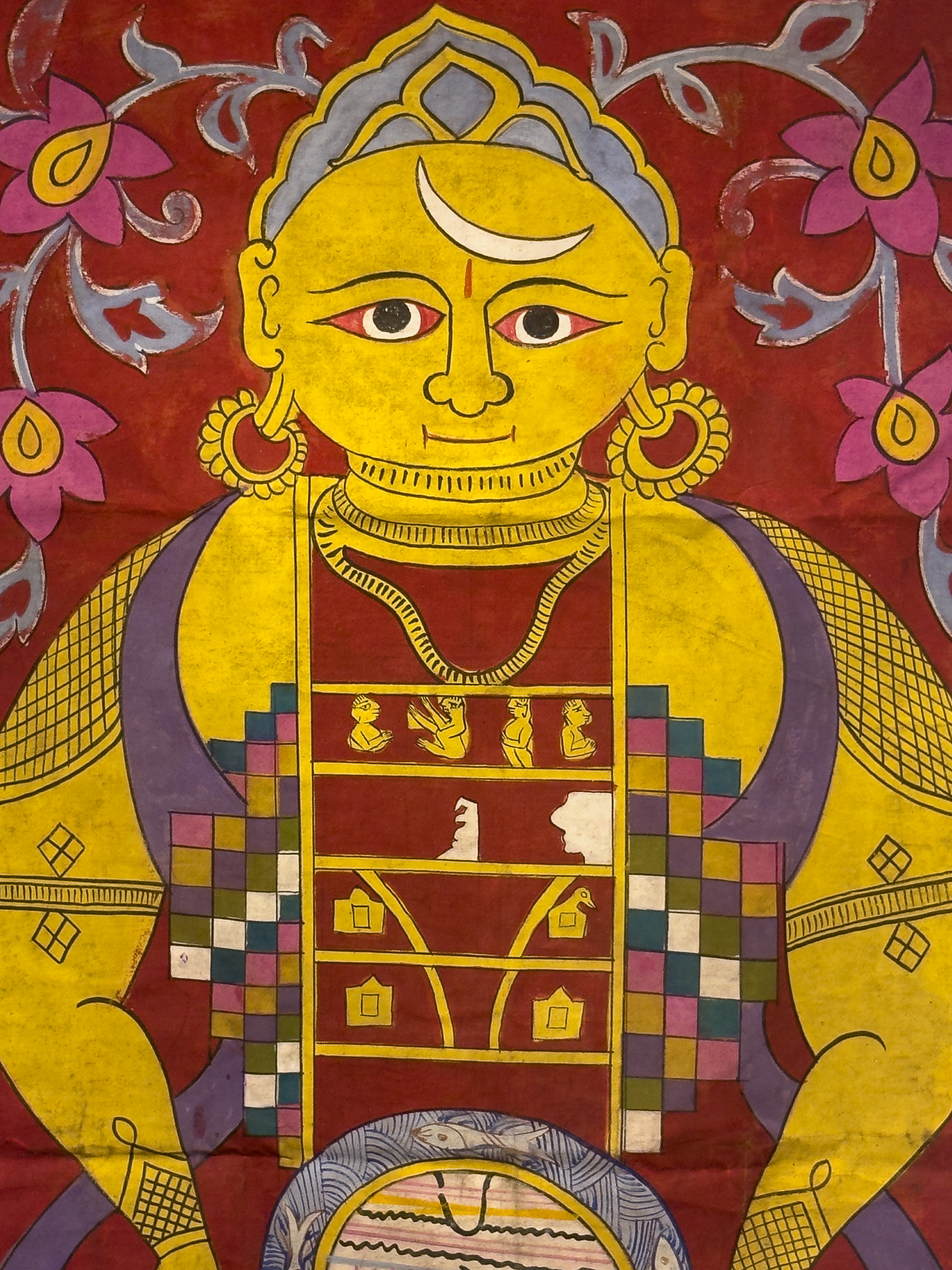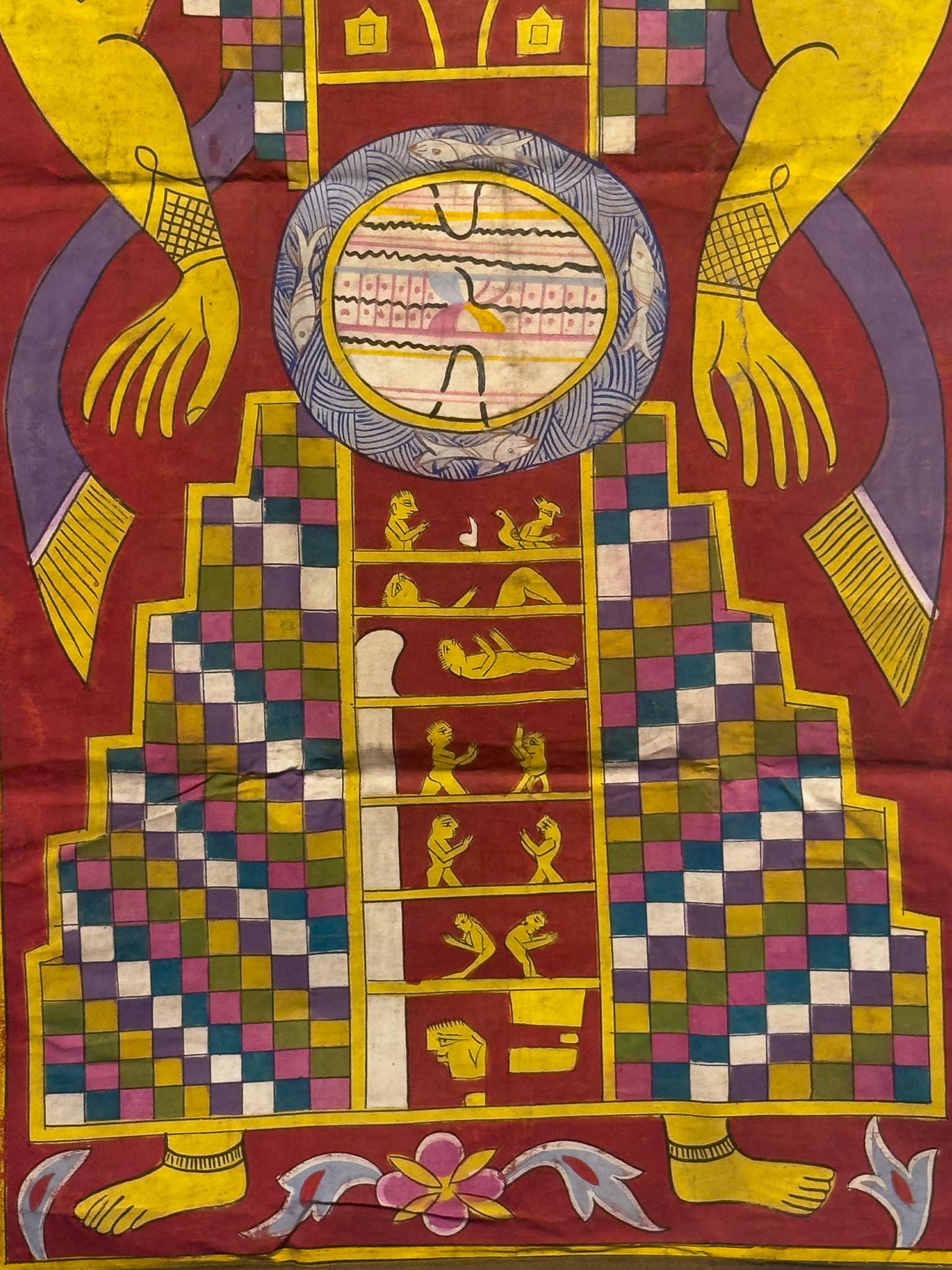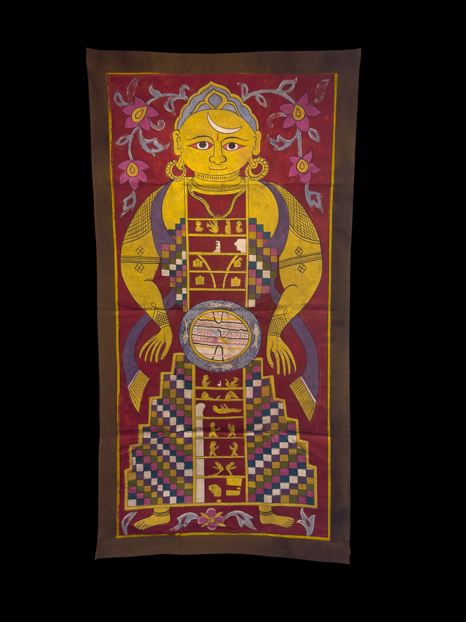A vertically oriented painting depicting a Jain cosmic diagram, known as Lokapurusha. The highly stylized anthropomorphic figure is rendered in a folk art style, characteristic of South Asian tradition. The central figure, predominantly yellow, features a crescent moon on its forehead, prominent earrings, necklace, and armbands. Its body is distinctly compartmentalized, showcasing small, illustrative scenes within a central vertical column, and a prominent circular motif at the abdomen which features elements resembling Indic script. The lower body is rendered as a checkered skirt-like structure, all set against a rich red background adorned with simplified floral motifs and framed by a dark brown border.