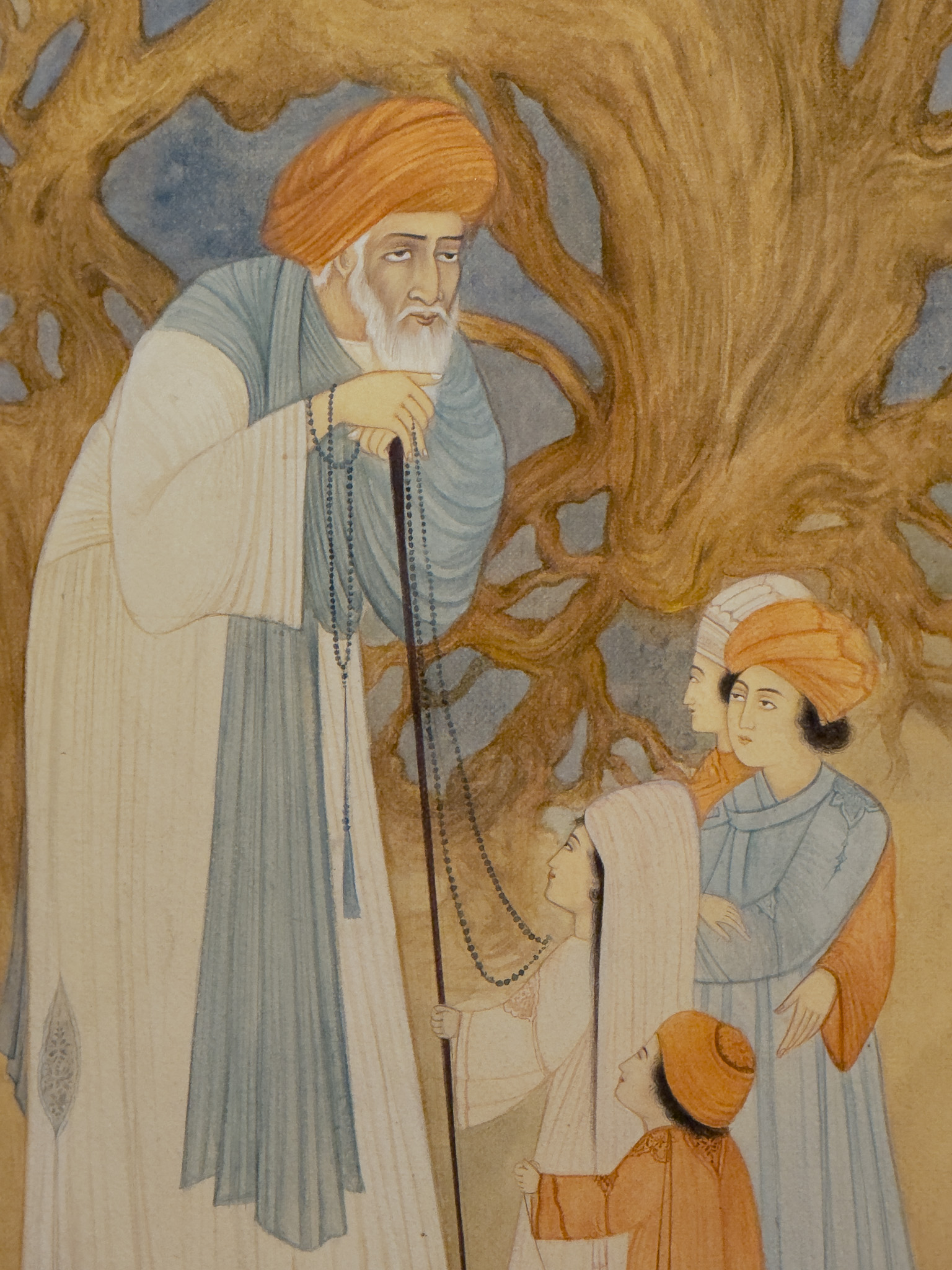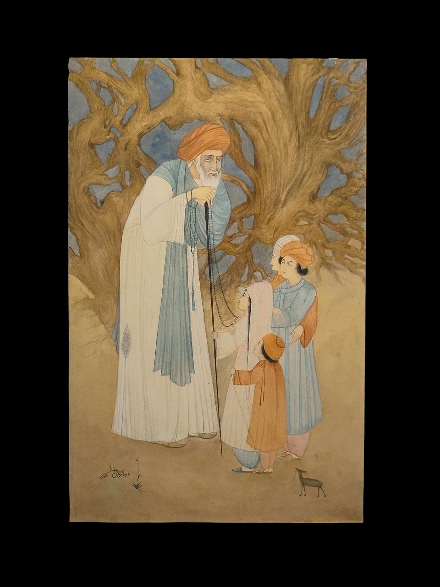 A vertical format miniature painting by Abdur Rahman Chughtai (India/Pakistan, 1894-1975), executed in watercolor or gouache on paper. The scene depicts a tall, elderly bearded man in a saffron turban and flowing blue and white robes, holding a string of prayer beads and a staff, addressing three younger figures in traditional attire. They are set against a backdrop of a large, gnarled tree with exposed roots and a muted blue sky, with a small dog in the lower right. The painting bears a signature in Nastaliq script in the lower left corner, translating to ‘Chughtai Abdur Rahman Lahore’.