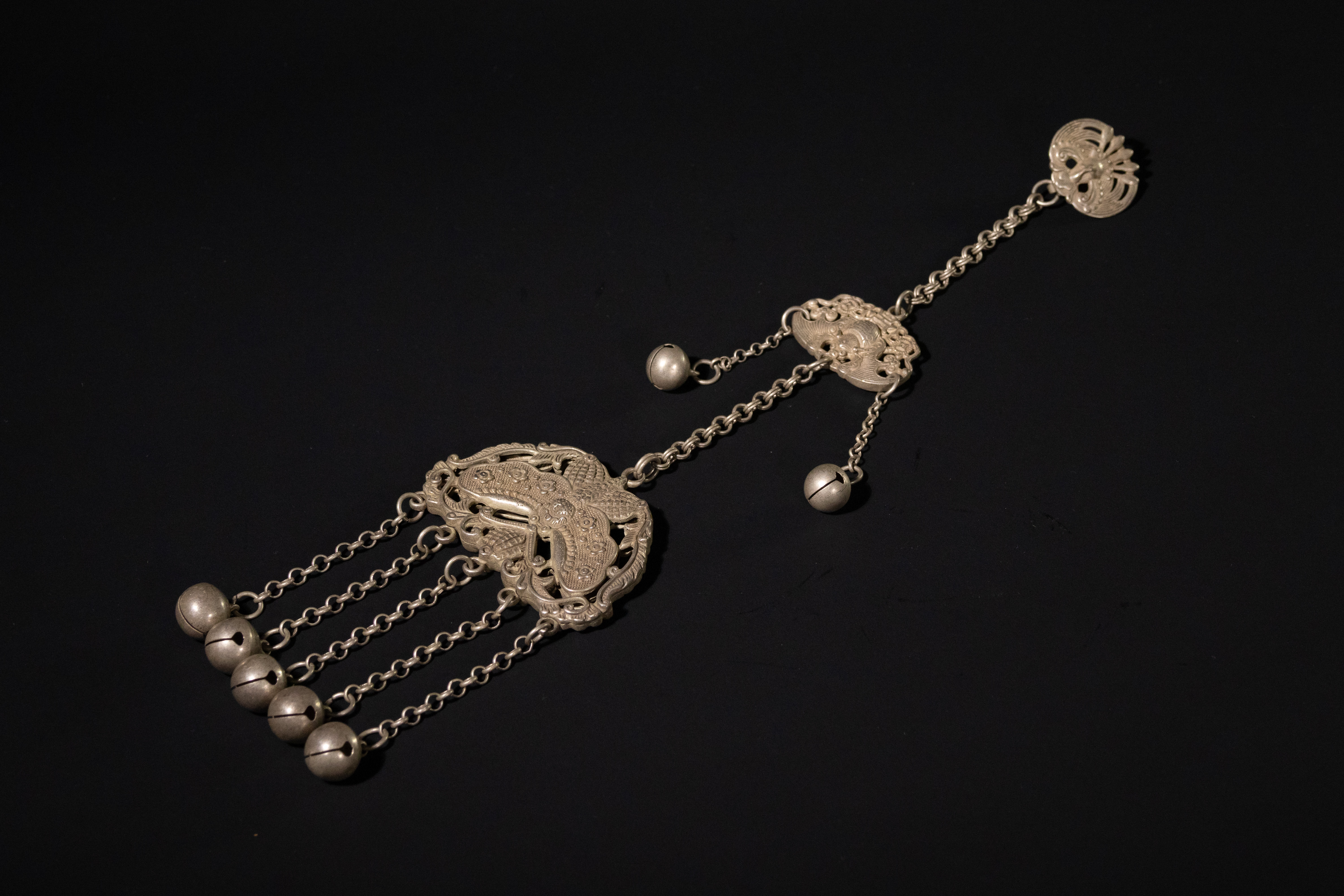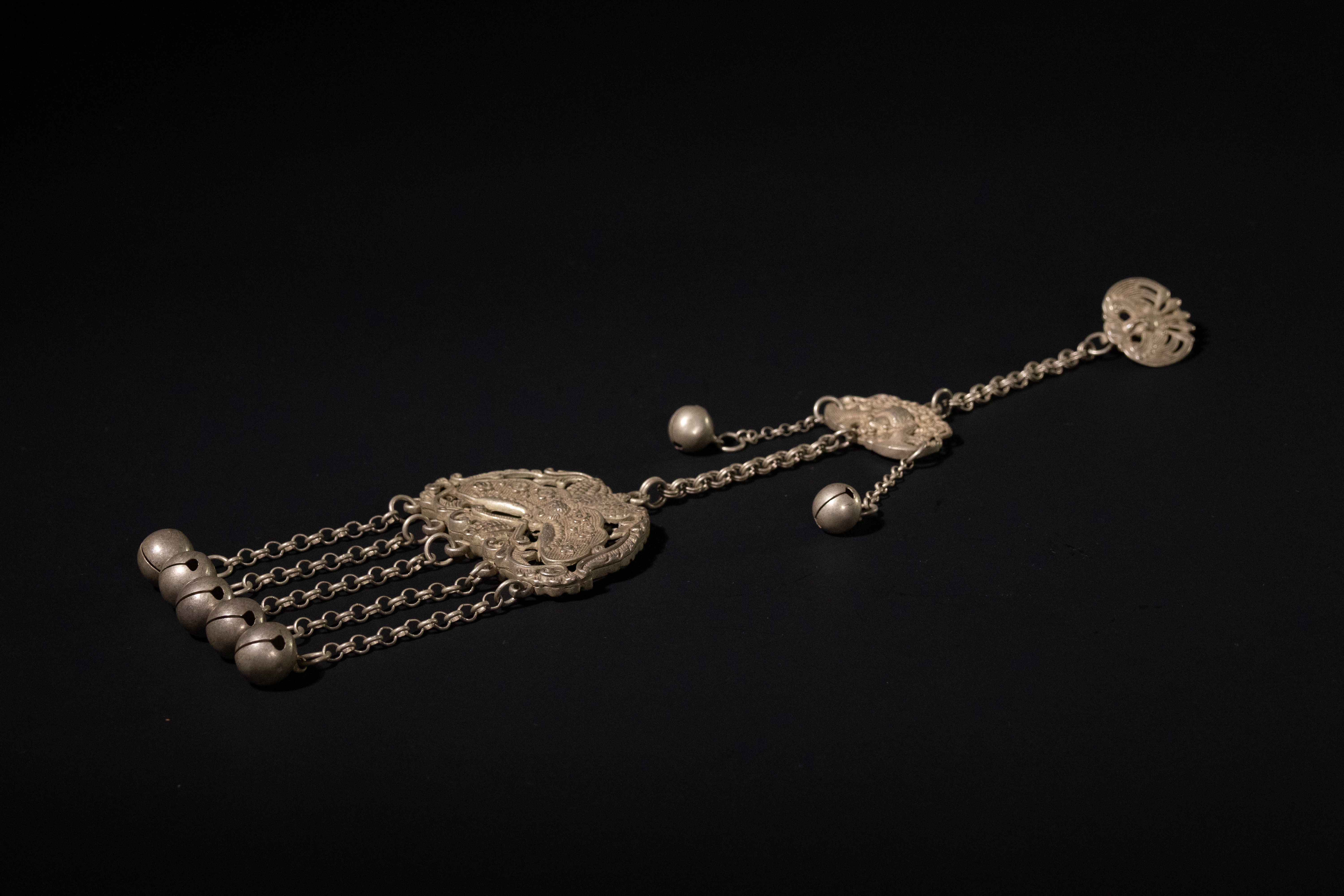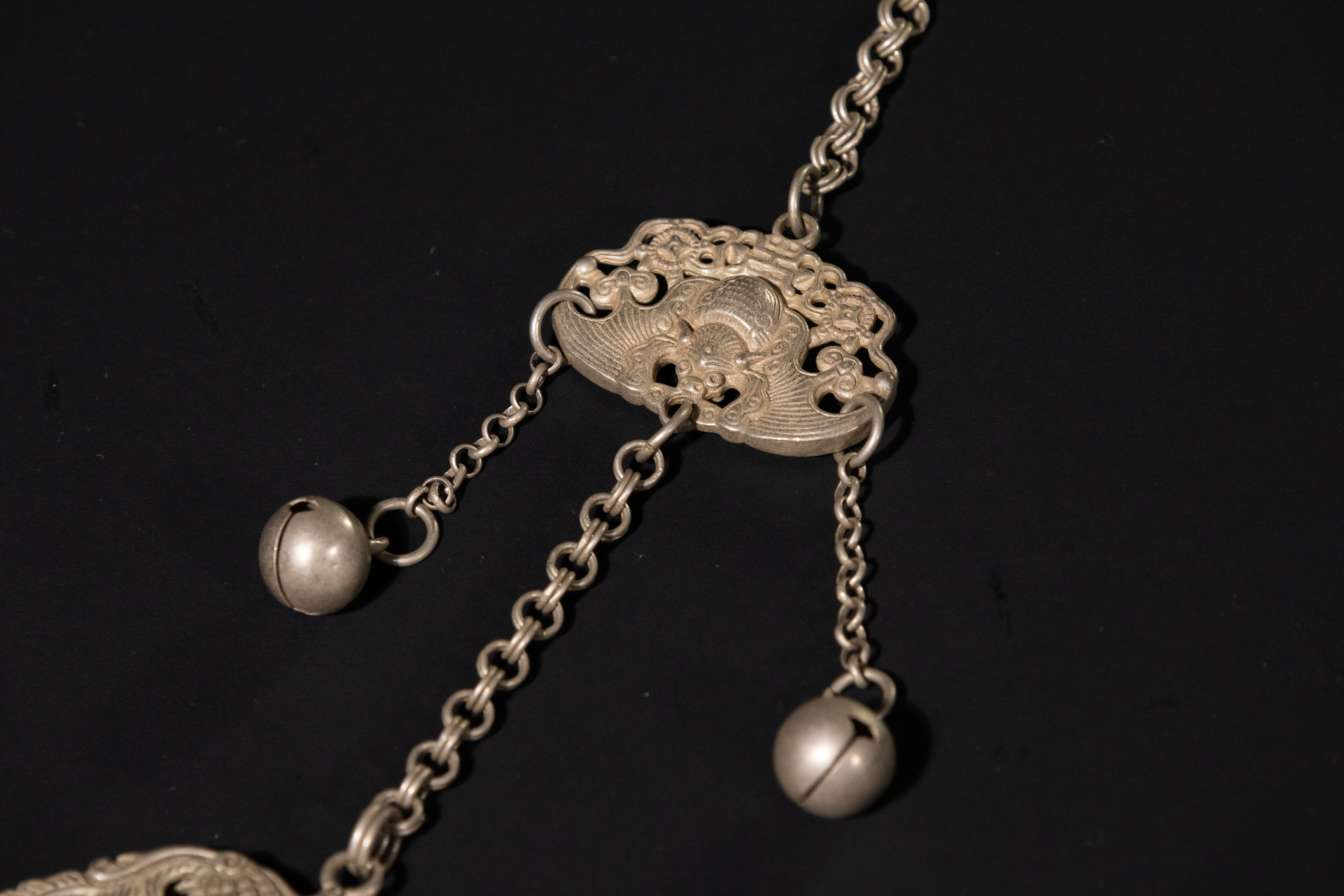 Lot 228: A Chinese White Metal Chatelaine Pendant with Phoenix, Bells, and Longevity Inscription, 19th/20th Century