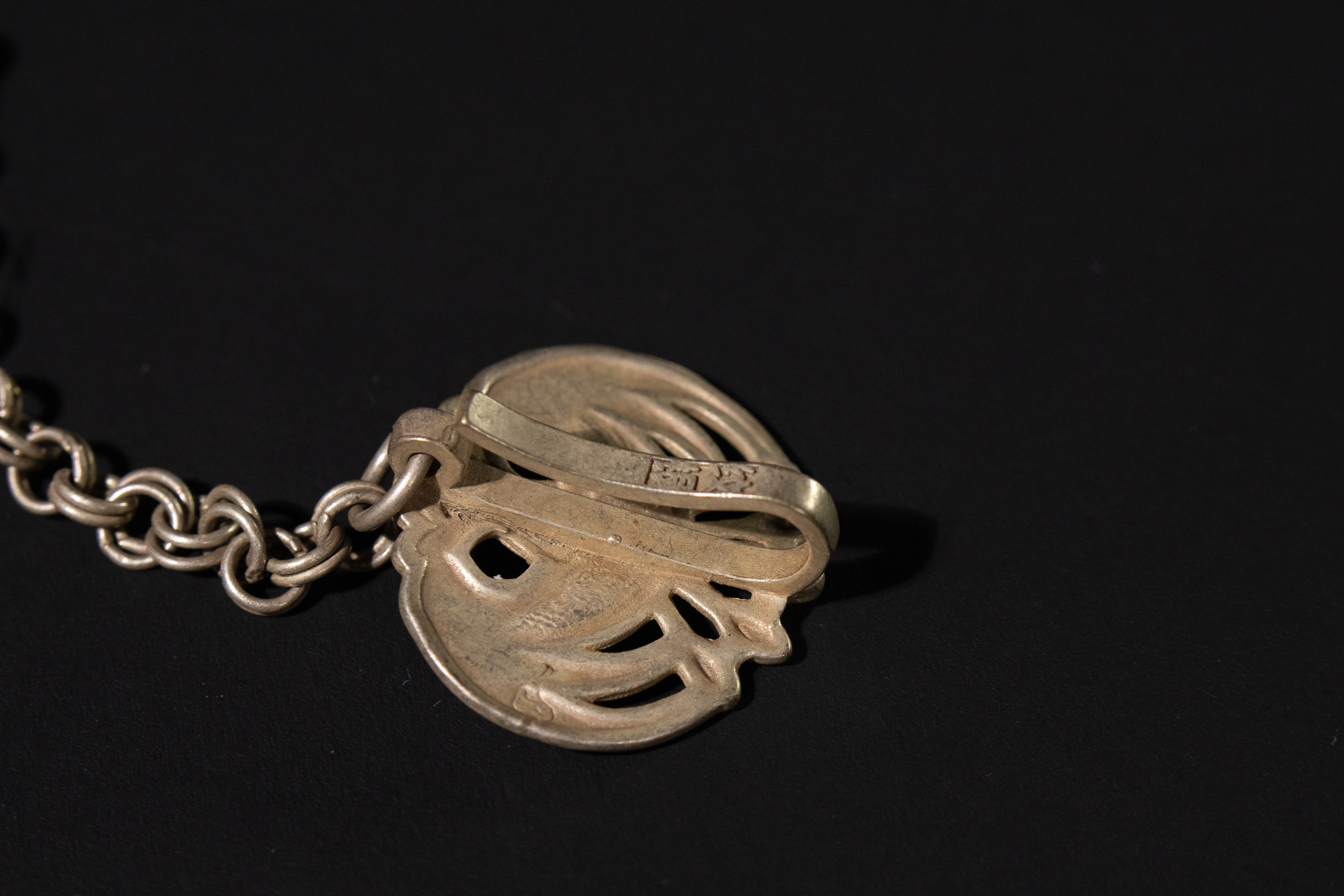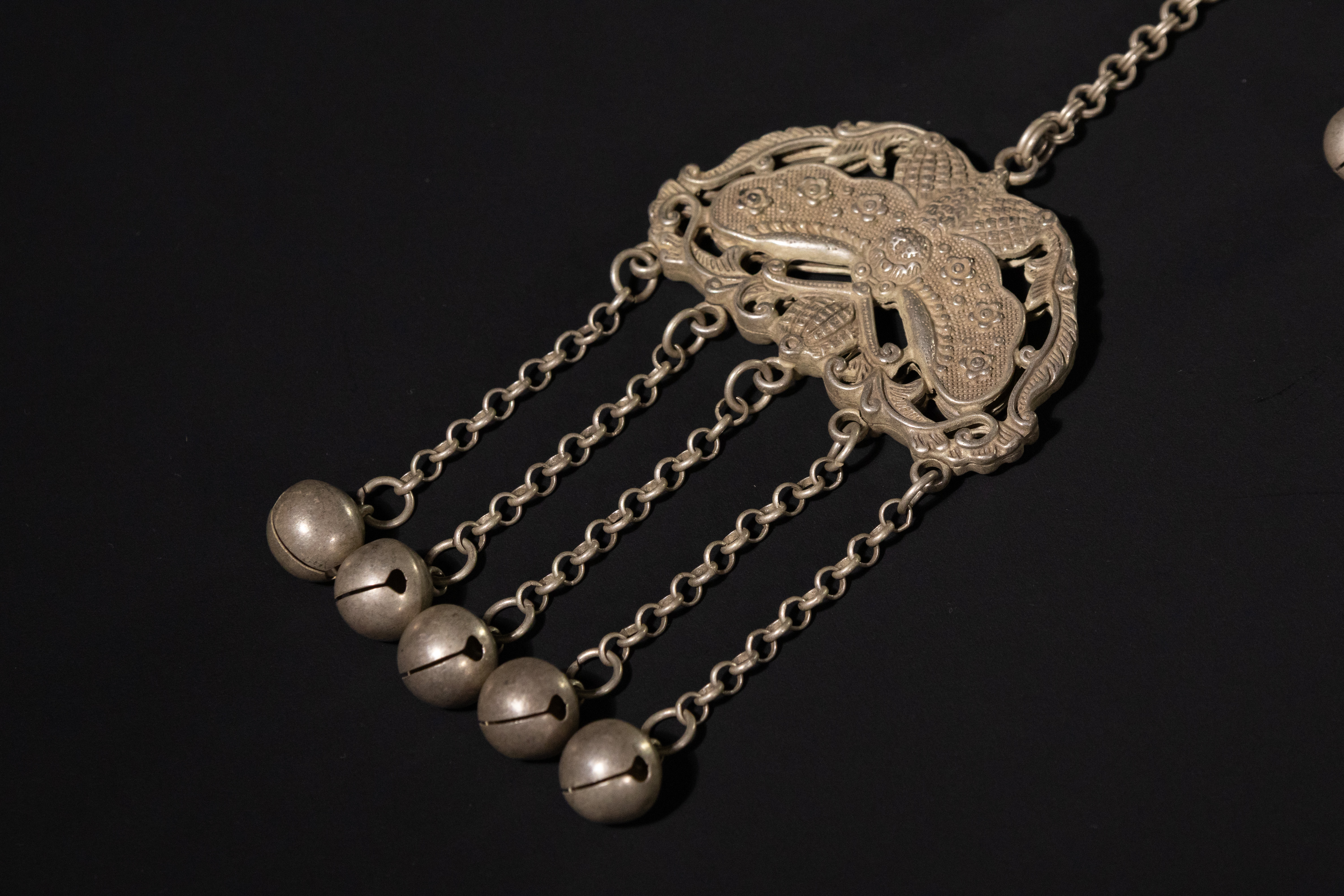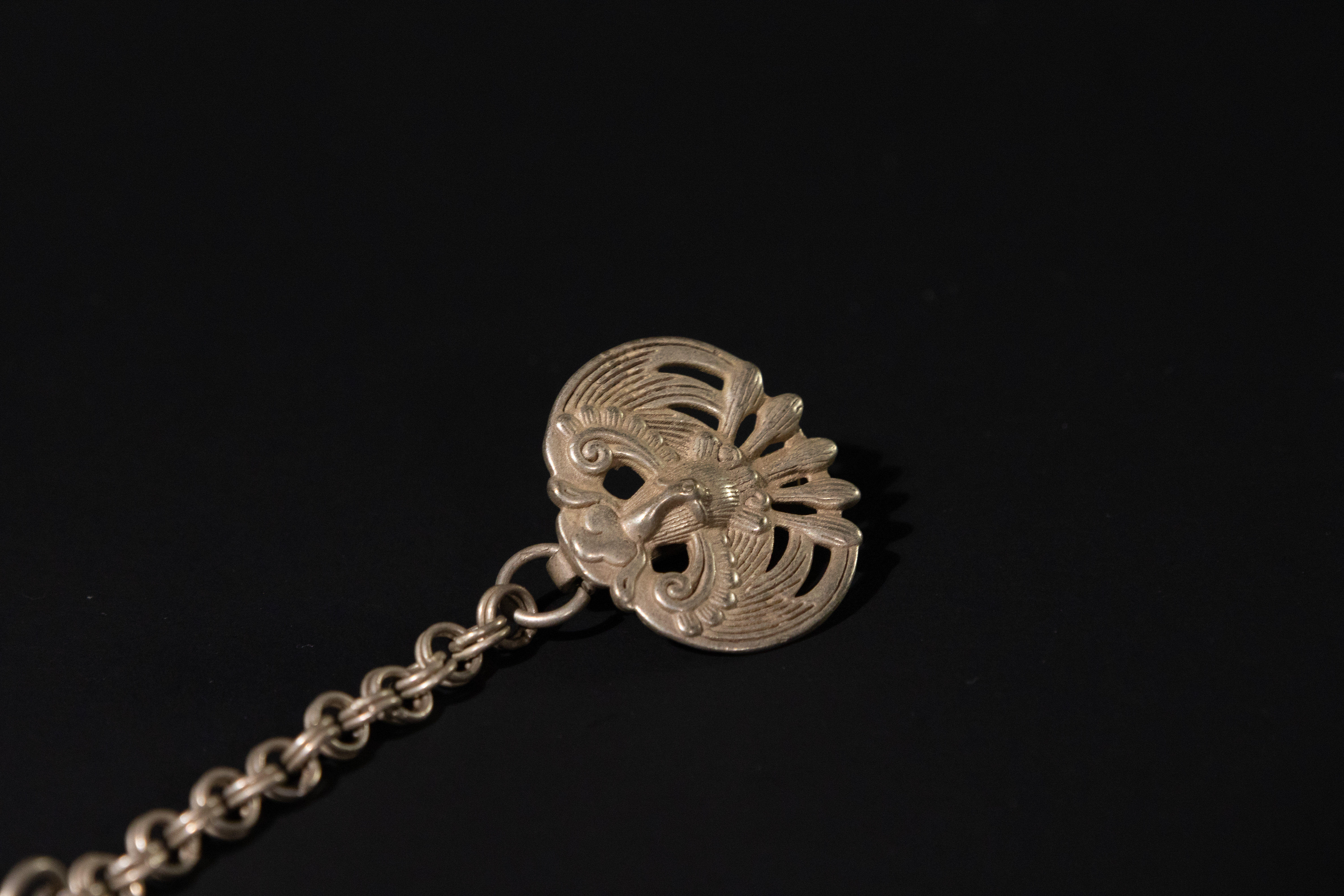 Lot 228: A Chinese White Metal Chatelaine Pendant with Phoenix, Bells, and Longevity Inscription, 19th/20th Century
