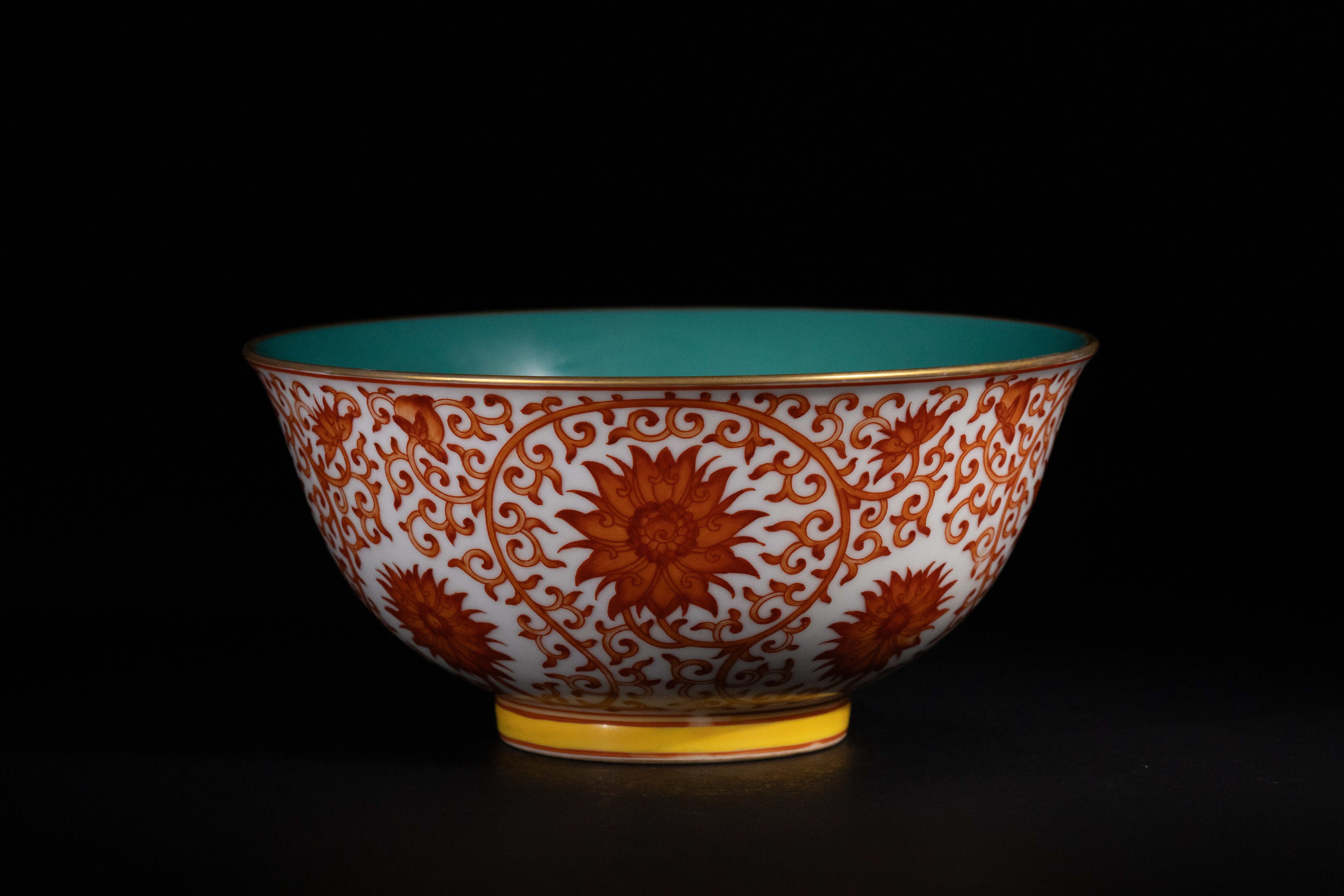A finely potted porcelain bowl, known as a coral-ground lotus scroll bowl. The rounded body features a subtly flared gilded rim and a distinct footring. The exterior is densely decorated with a continuous pattern of scrolling vines and stylized lotus blossoms rendered in iron red enamel on a white ground. A vibrant yellow band encircles the foot. The interior and the recessed base are uniformly glazed in a striking turquoise enamel. The base bears a blue underglaze six-character seal mark reading ‘大清乾隆年製’ (Dà Qīng Qián Lóng Nián Zhì), translating to ‘Made in the Great Qing Qianlong reign’.