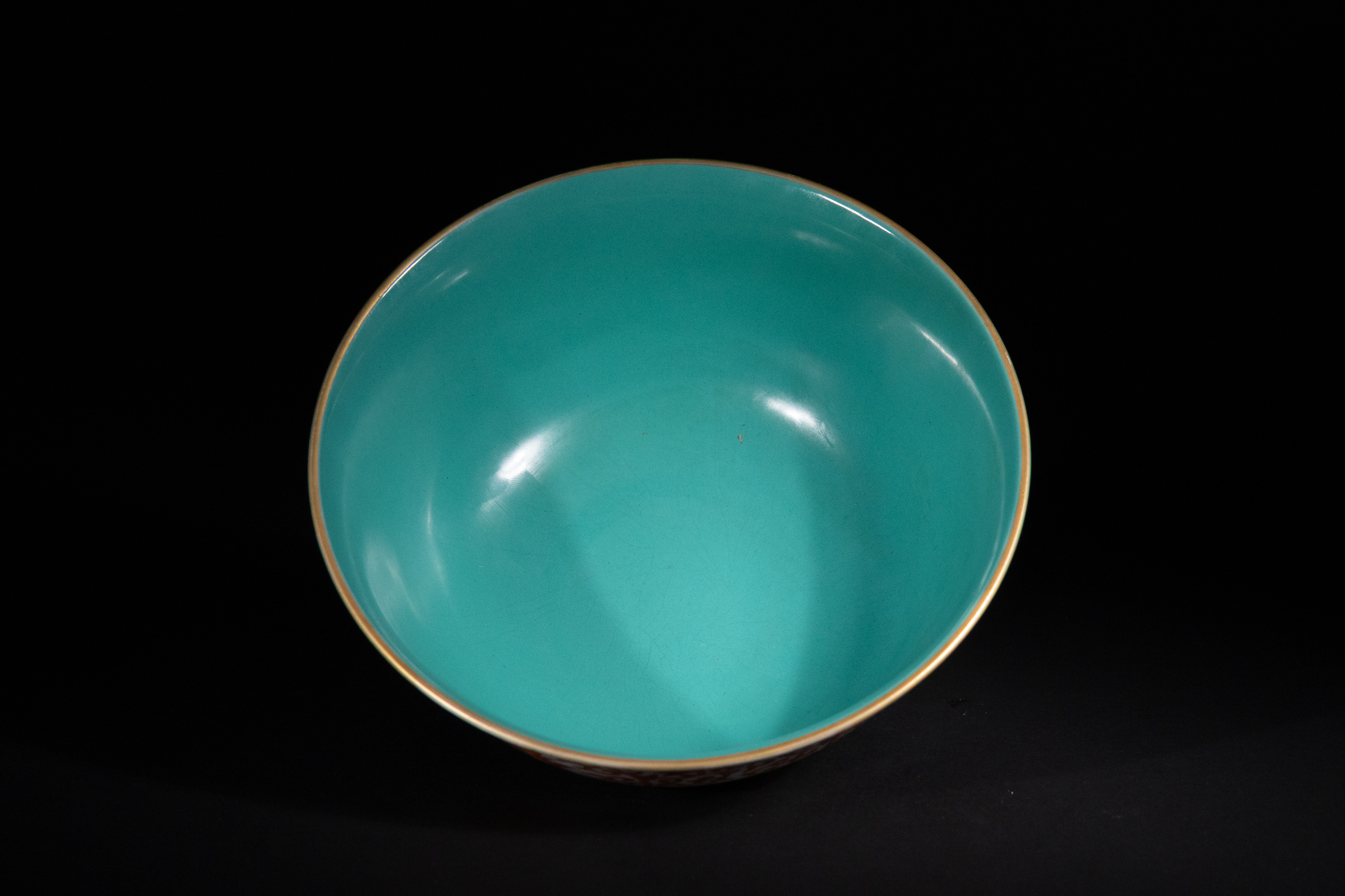 Good overall condition. Minor wear consistent with age and use. Fine crazing is present within the interior turquoise glaze.