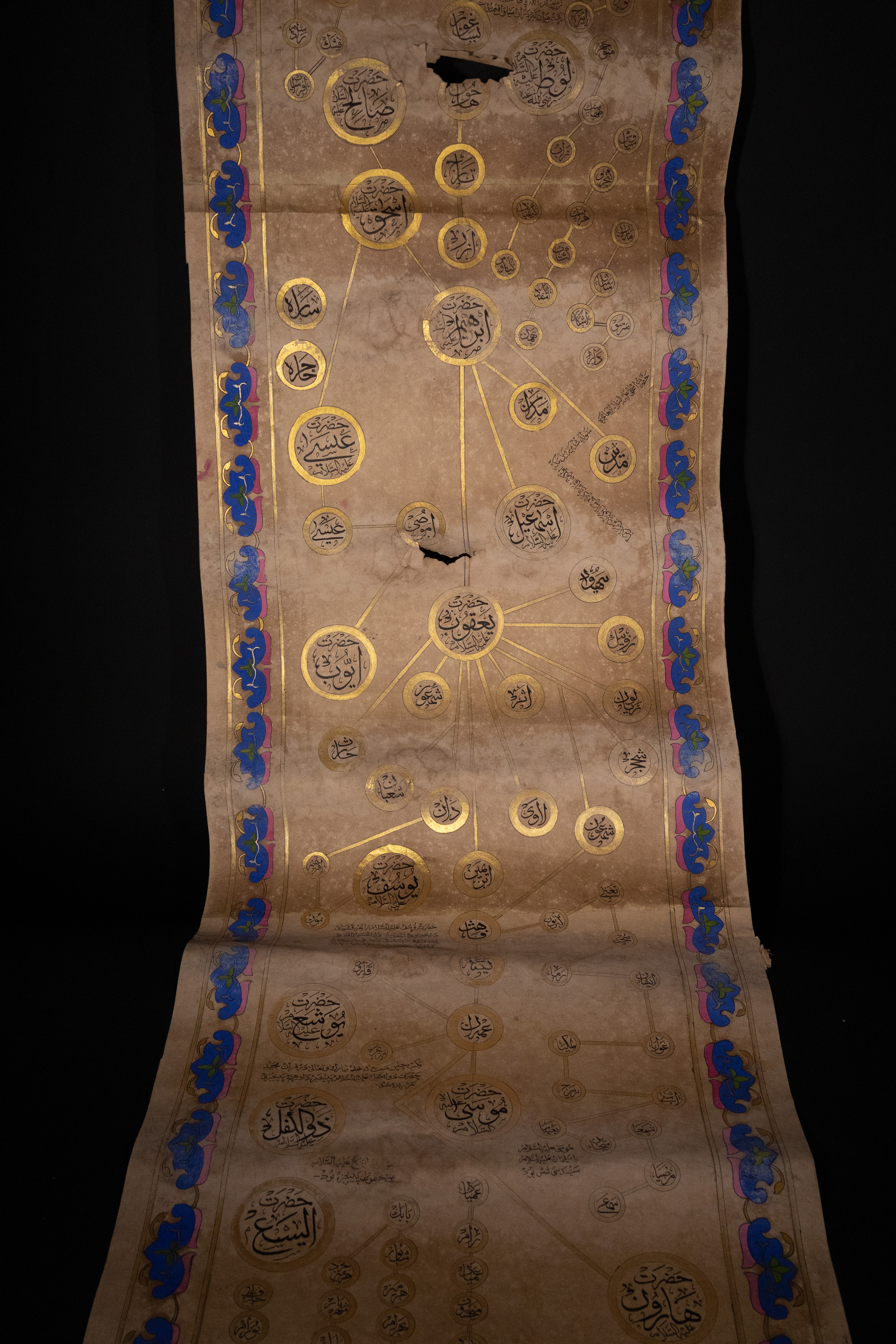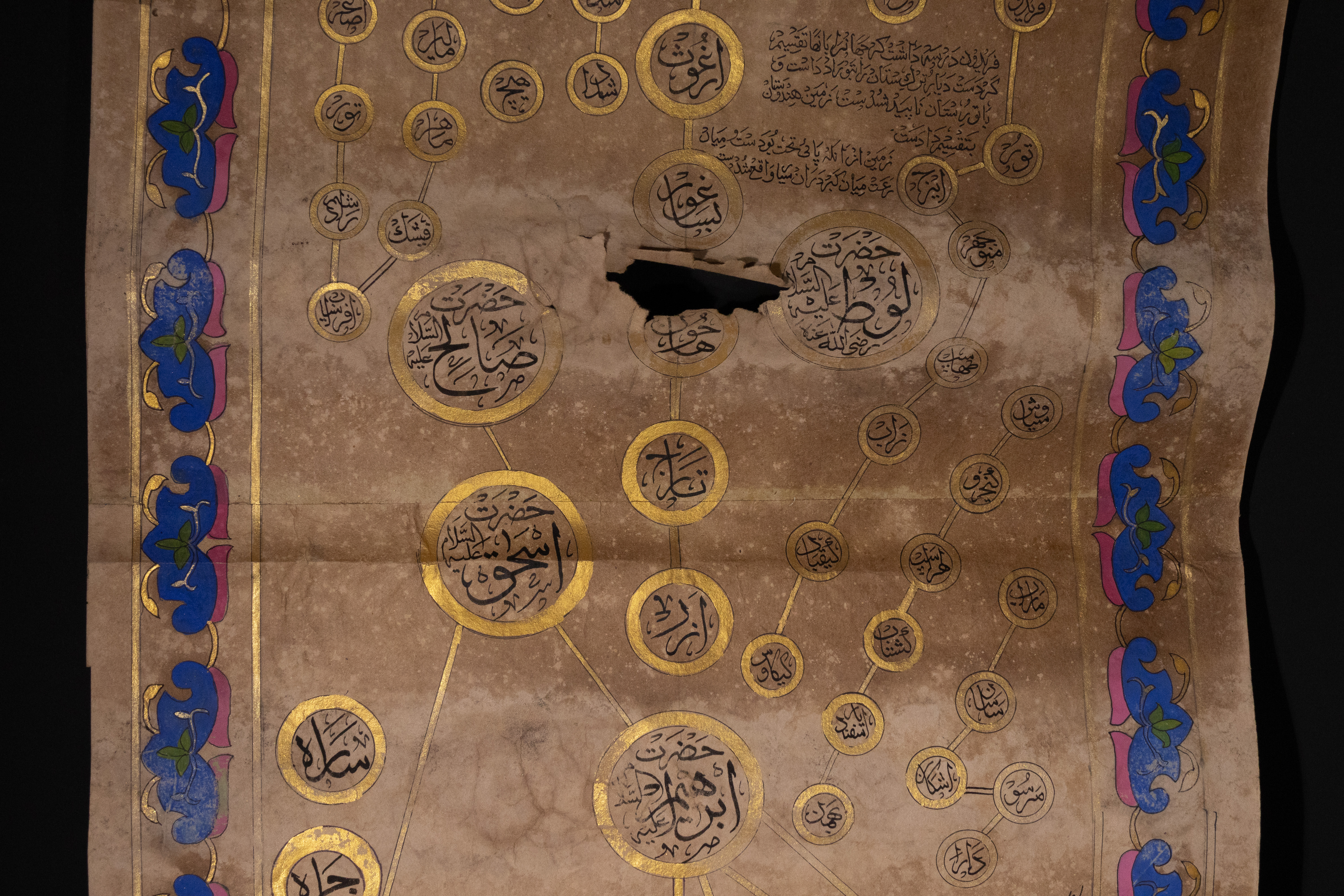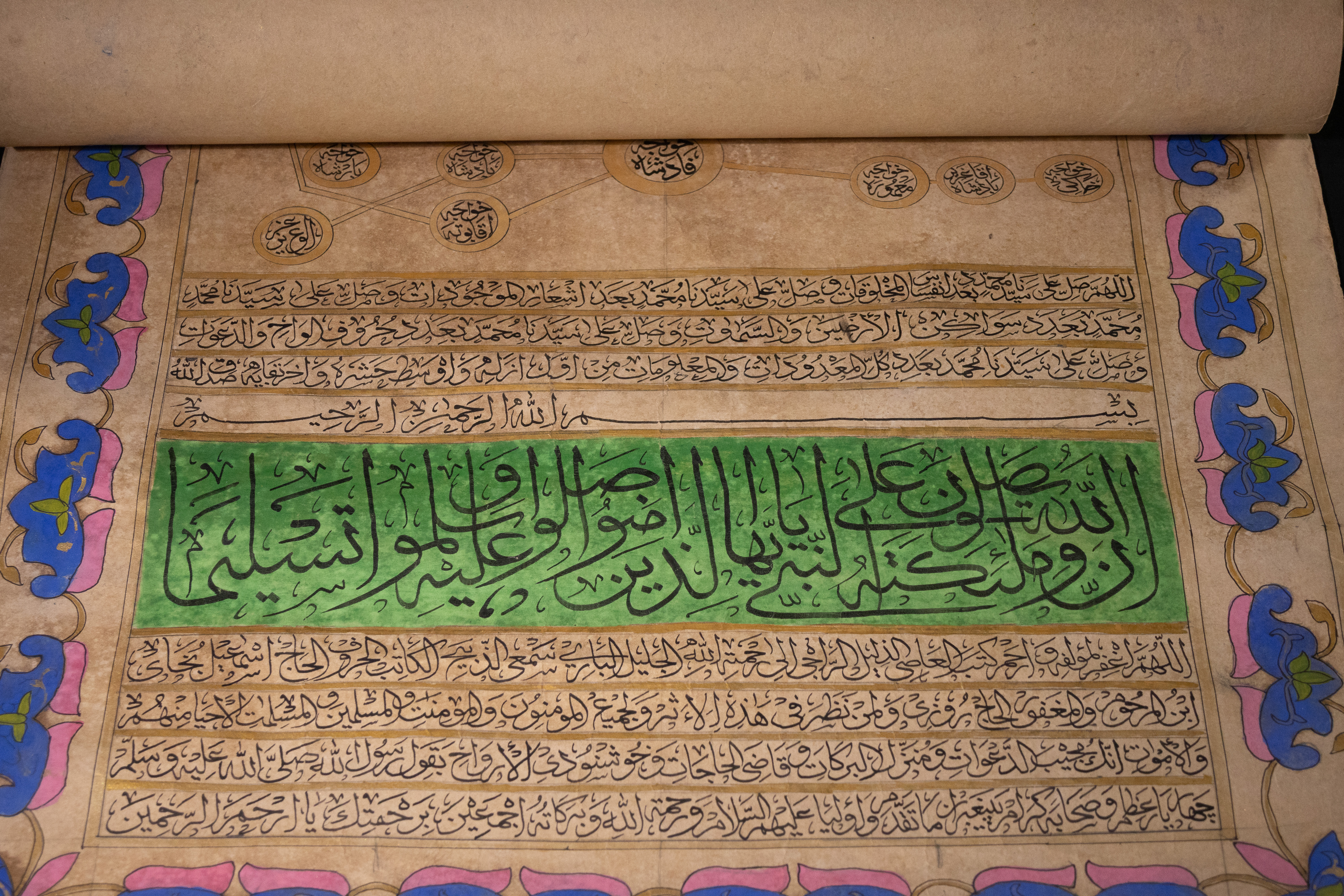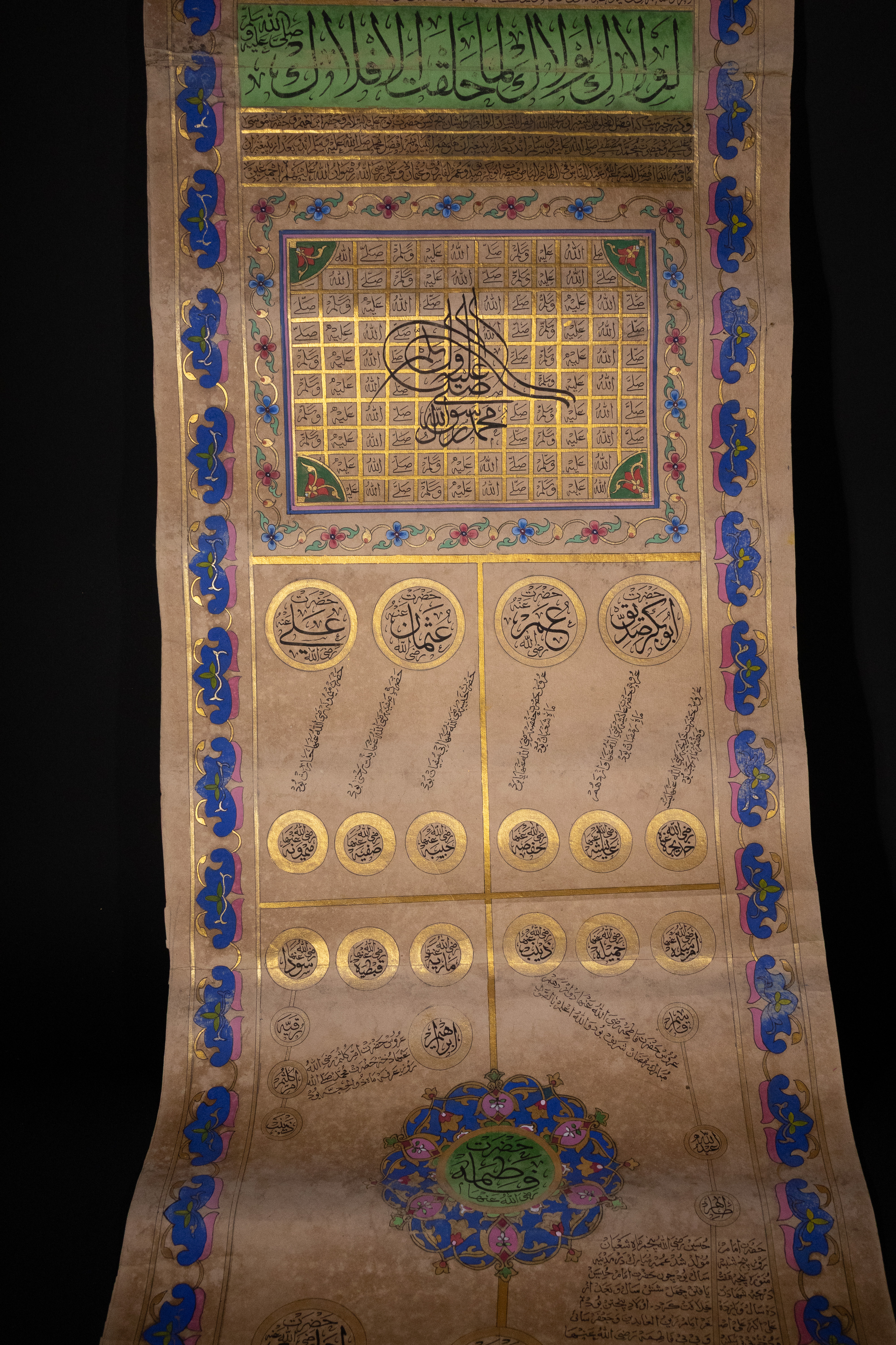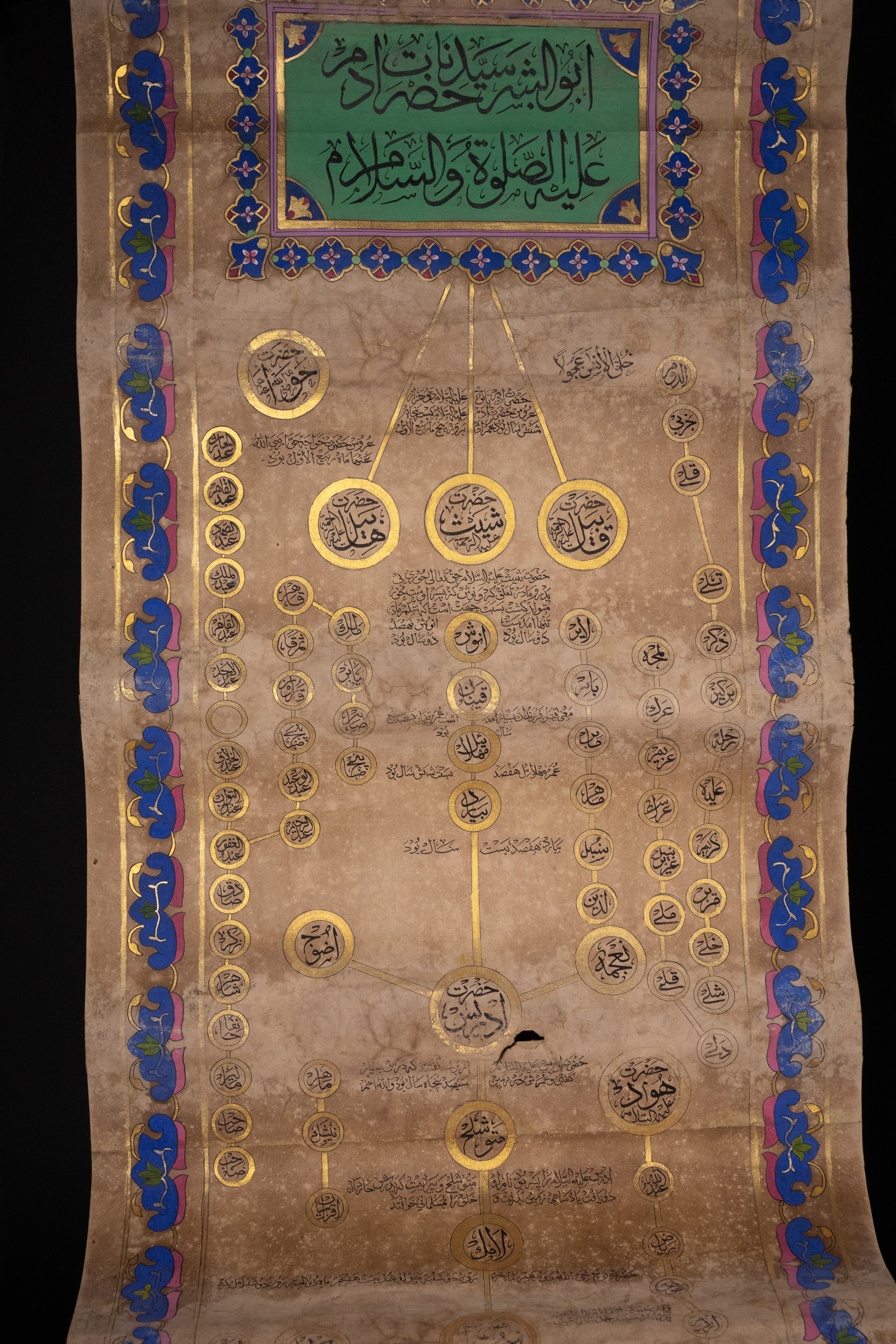 An illuminated Islamic genealogical scroll, likely Ottoman or Persian, dating to the 19th Century. Executed on aged paper, it features extensive Islamic calligraphy in black ink, vibrant green, blue, and pink pigments, and prominent gold embellishments. Its layout includes a large Ottoman Tughra, decorative floral and foliate borders, and multiple panels of Arabic text. A significant portion details an interconnected genealogical or spiritual lineage (silsila) through gold-outlined circles containing Arabic names, identified as prophets or revered figures, such as ‘أبو البشر محمد’ (Abu al-Bashar Muhammad, ‘Father of Humanity, Muhammad’).